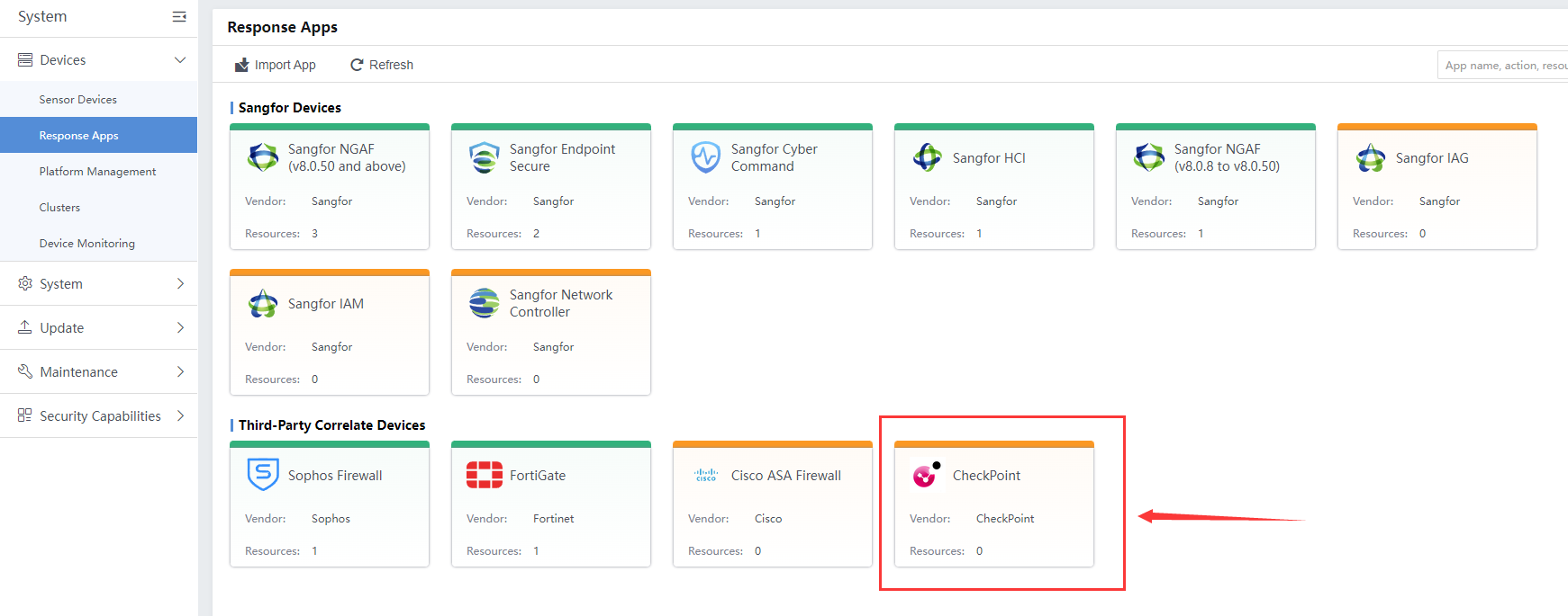 Navigate to System > Devices > Response Apps > CheckPoint to configure the CheckPoint Firewall.