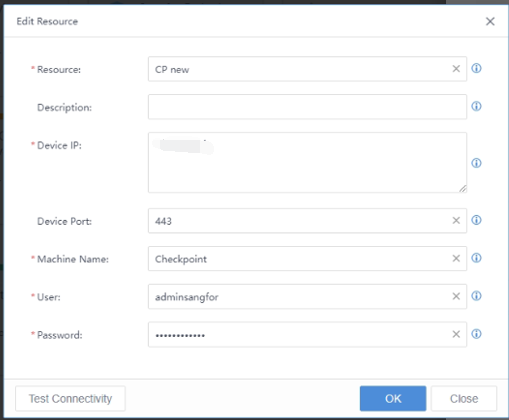 Below is an example. The device IP is the CheckPoint firewall IP address; the device port is the CheckPoint firewall’s web console listening port (by default is 443). Then, input the RESTFUL API admin and password.