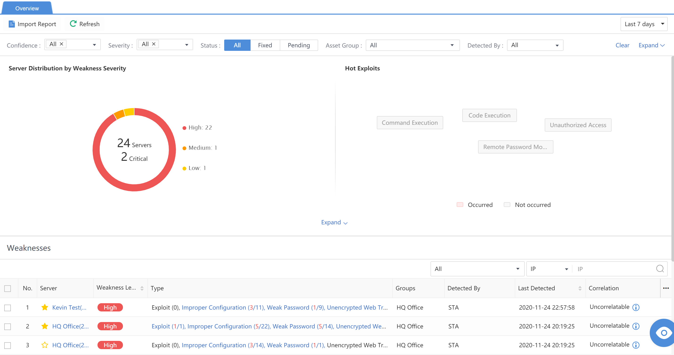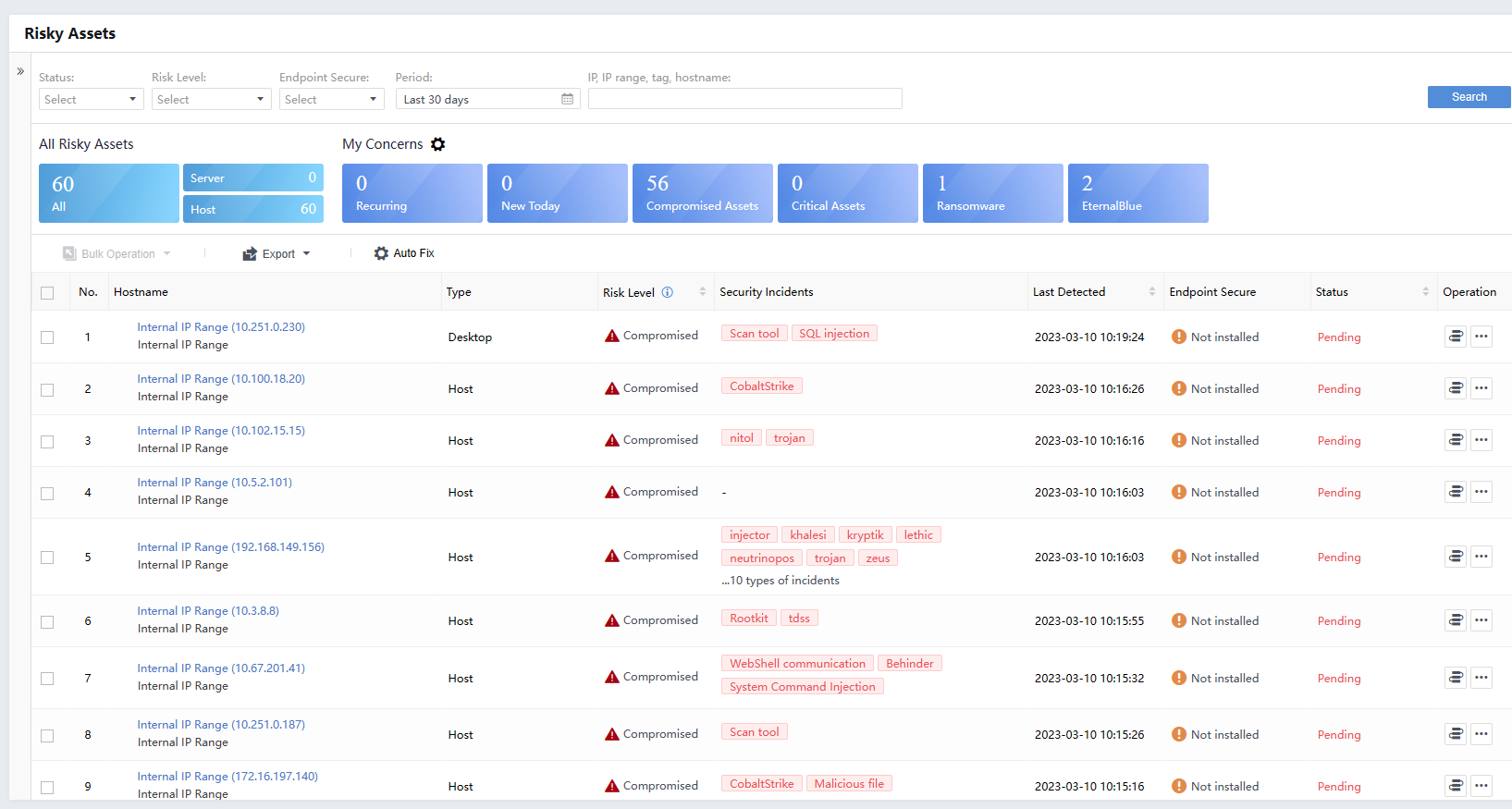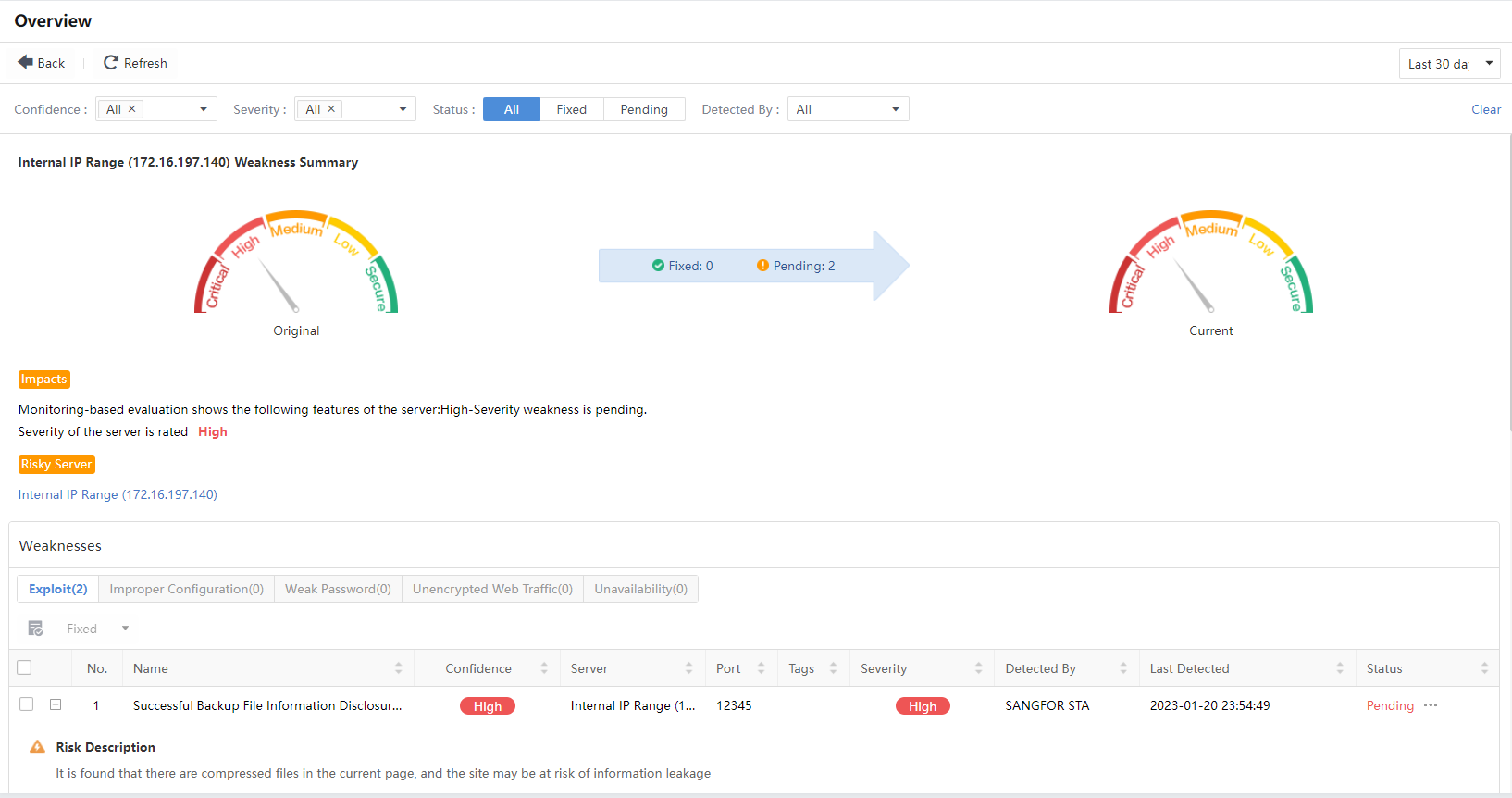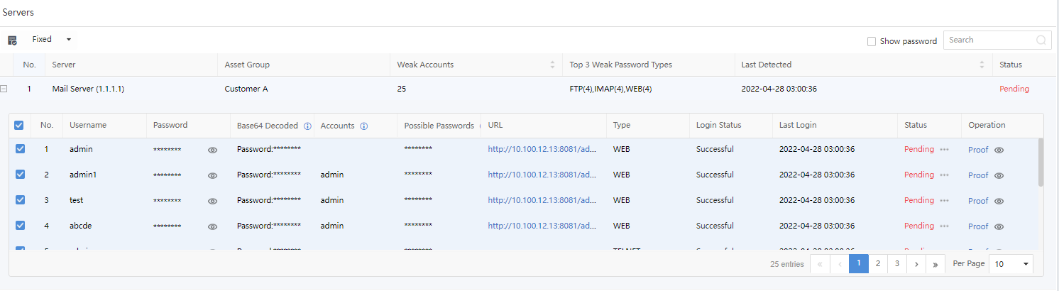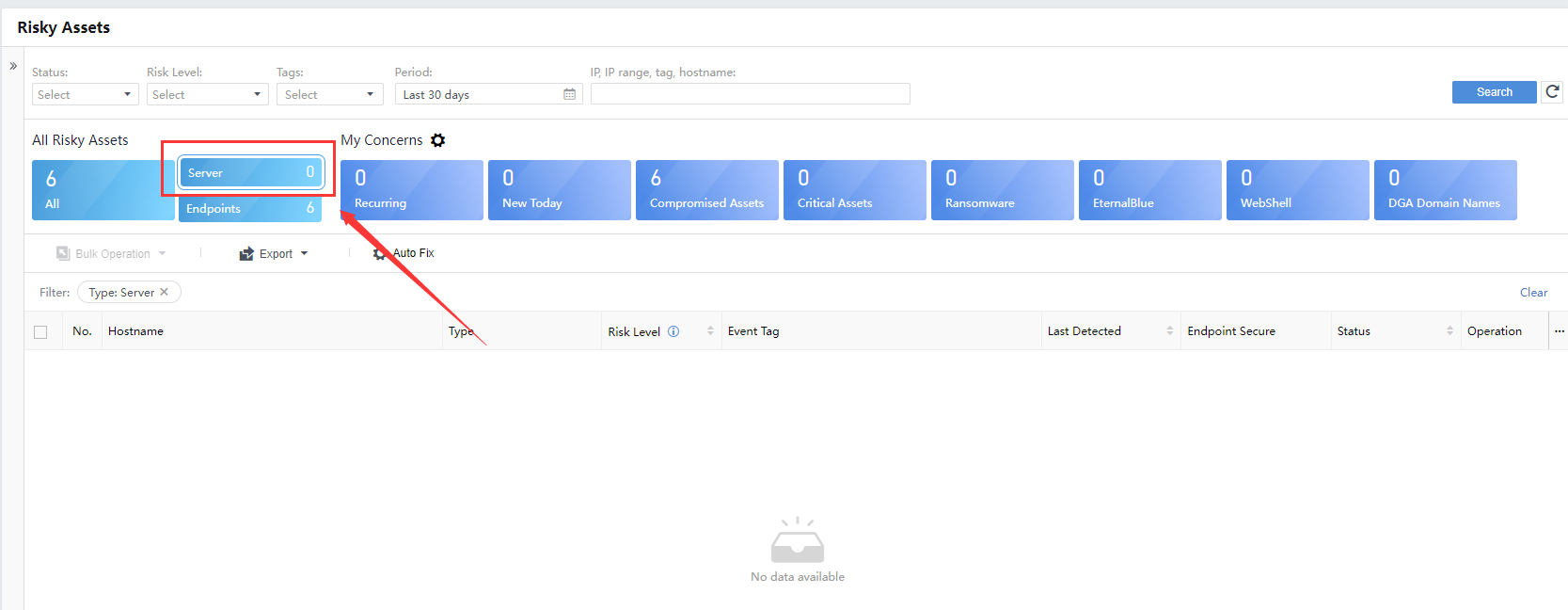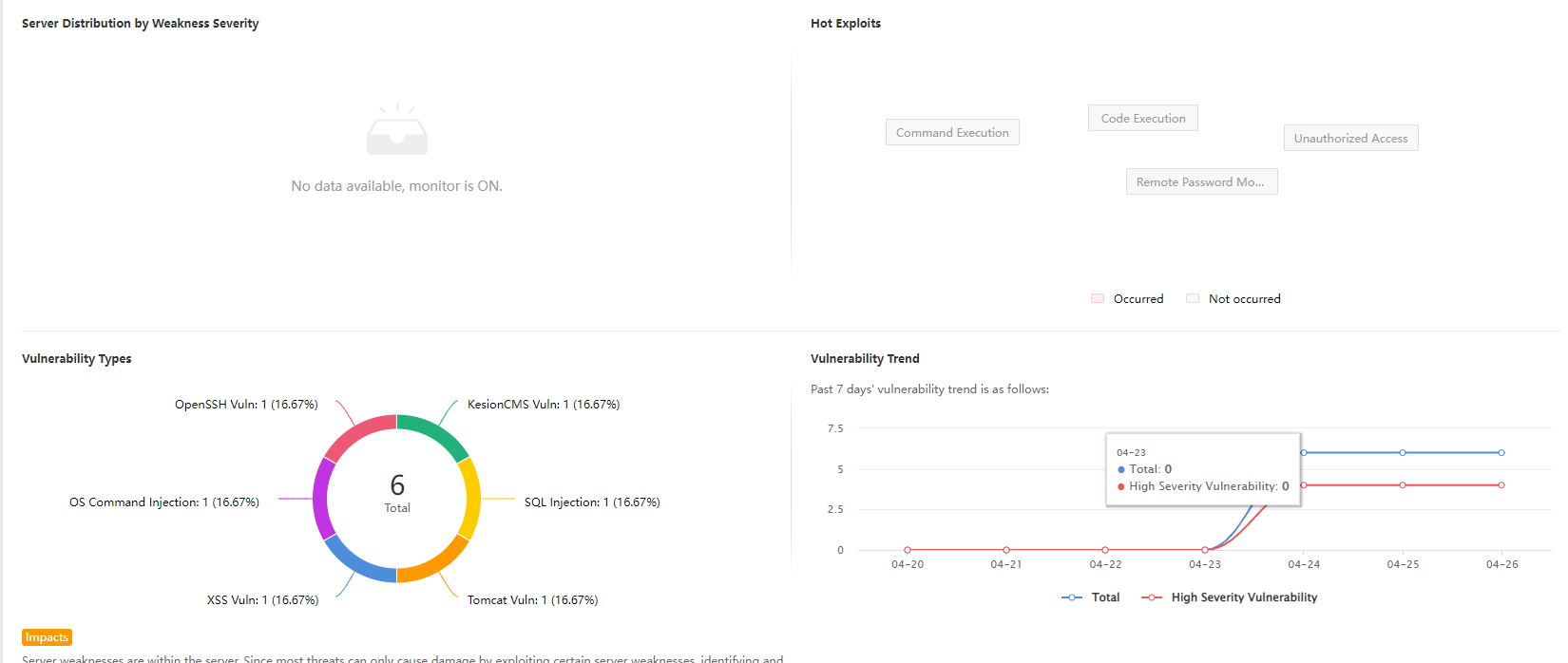 Server Distribution: Count the number of compromised, high-severity, medium-severity, low-severity, and vulnerable servers in the current network, as well as the vulnerability situation of risky servers, including vulnerability, configuration risks, weak password, and cleartext transfer.