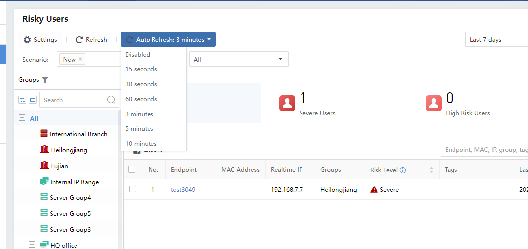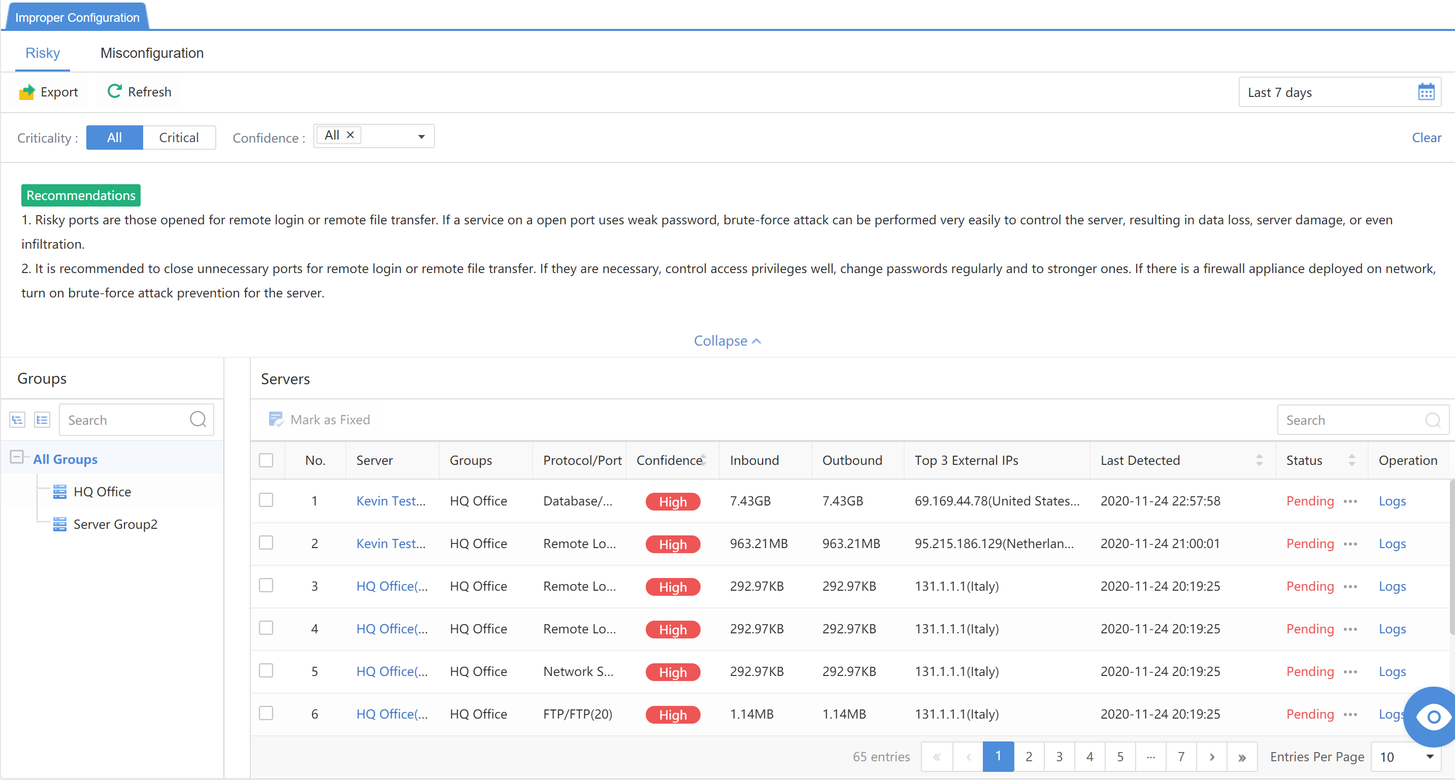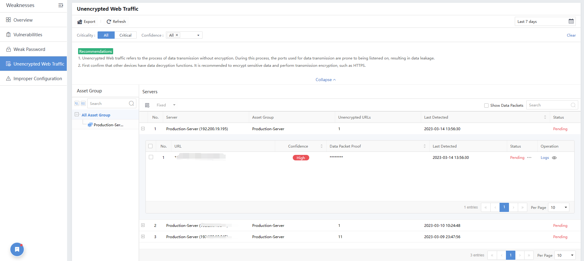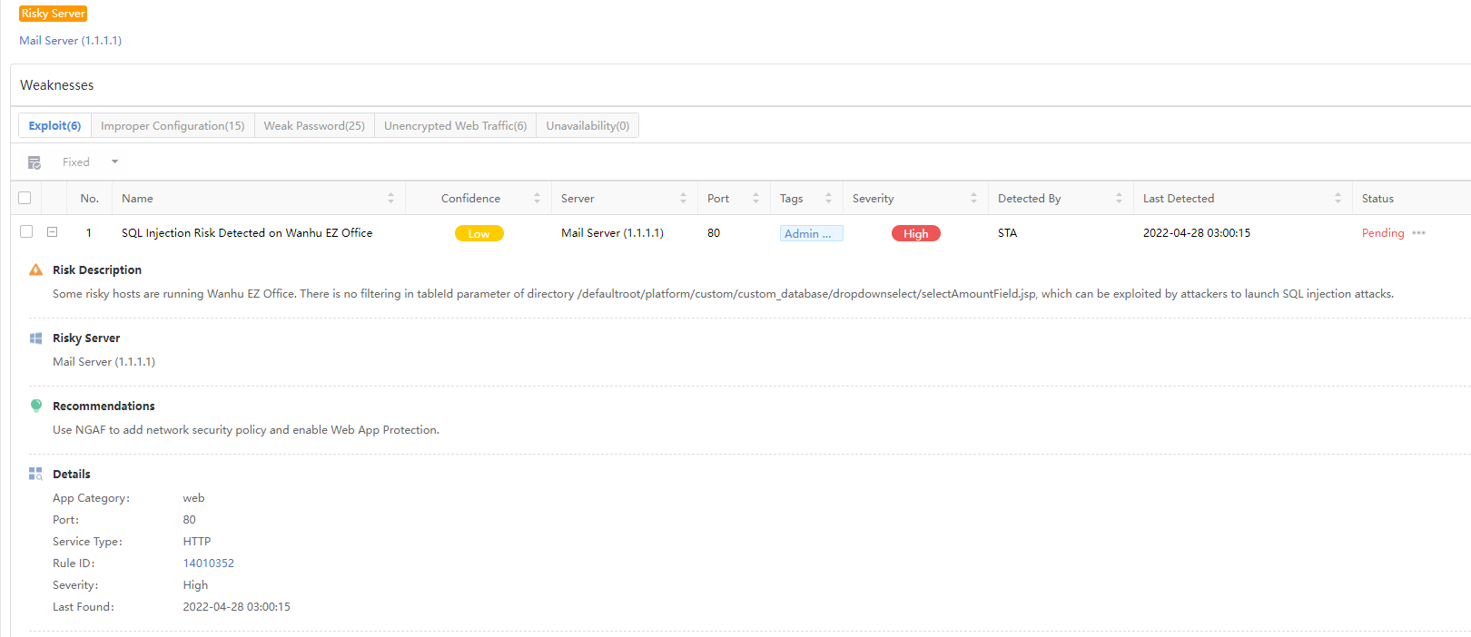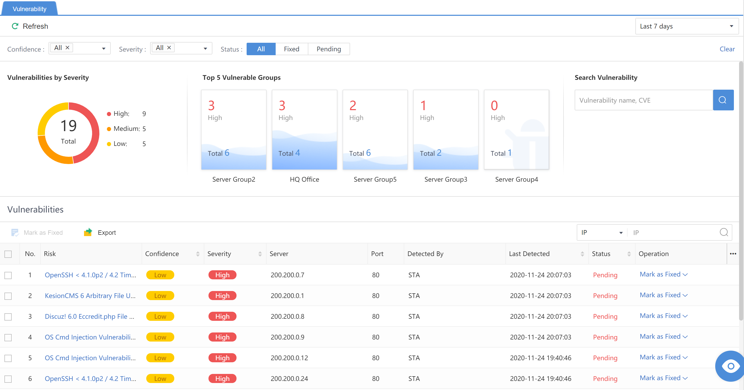 Server Distribution: Count the number of compromised, high-severity, medium-severity, low-severity, and vulnerable servers in the current network, as well as the vulnerability situation of risky servers, including vulnerability, configuration risks, weak password, and cleartext transfer.