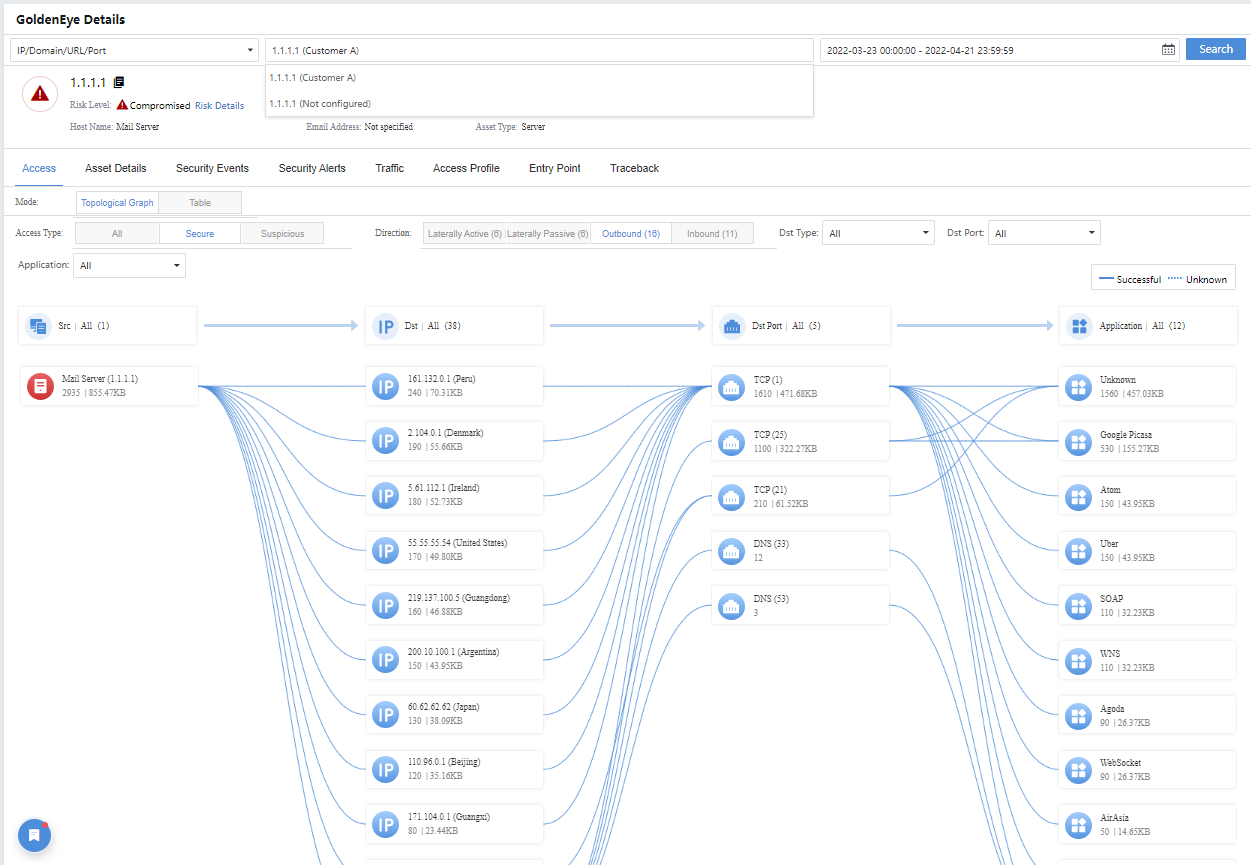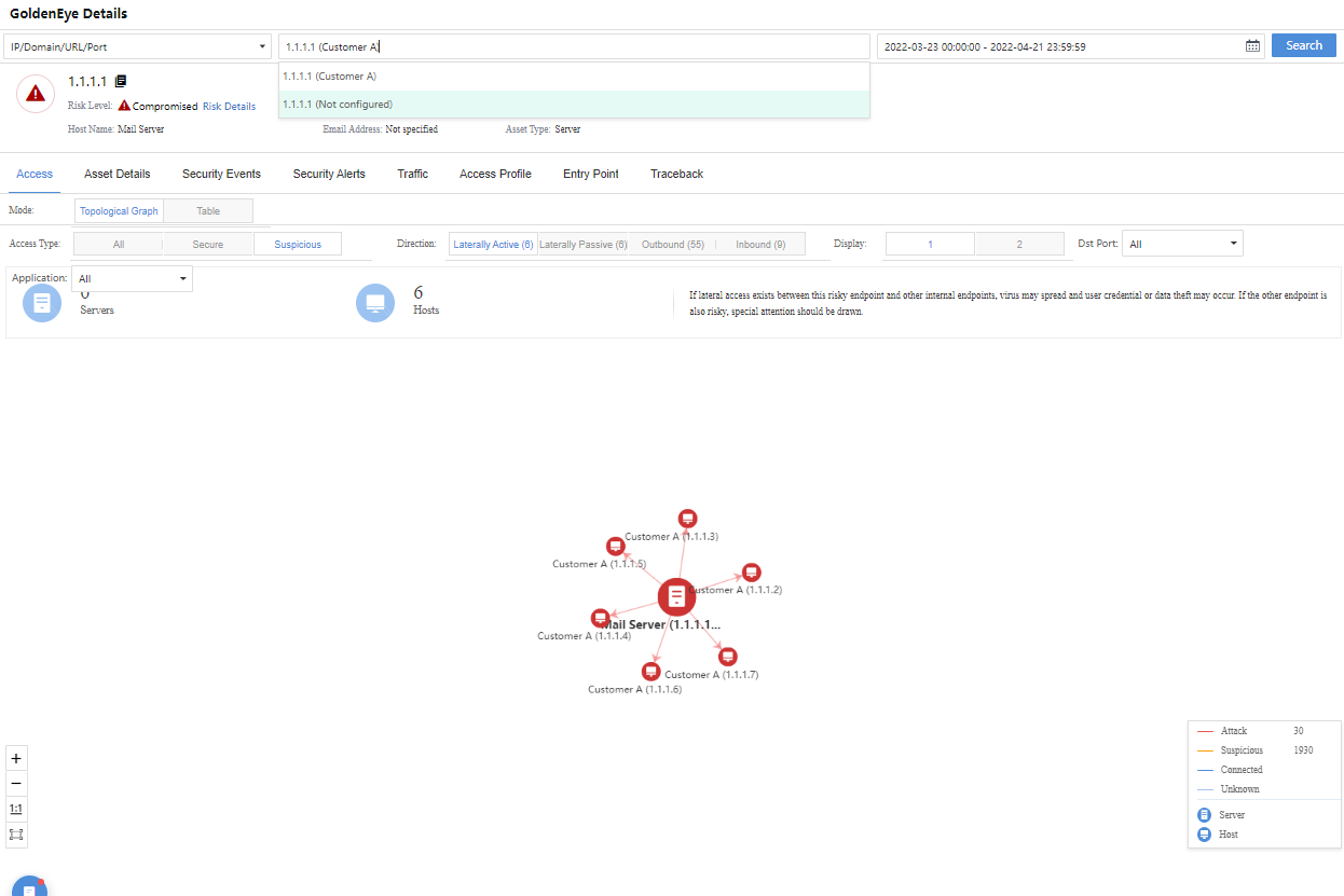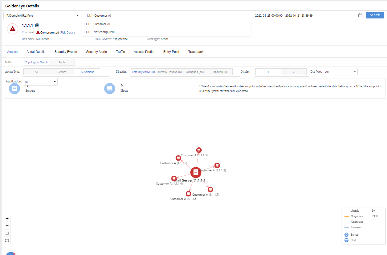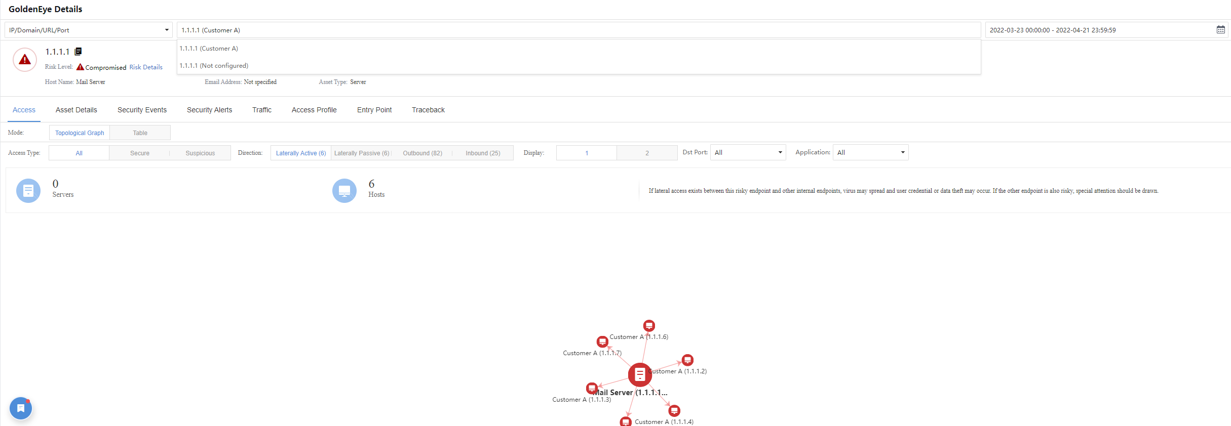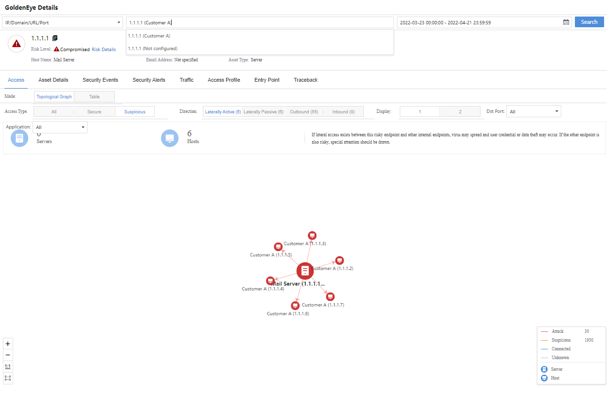 GoldenEye Traceback:A search and tracking tool integrating access relation, UEBA, and host overview. It can perform a search when finding risky hosts or malicious domains. See chapter 3.1.3 for details.