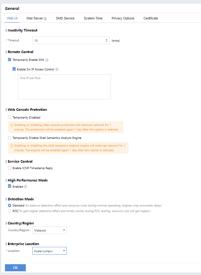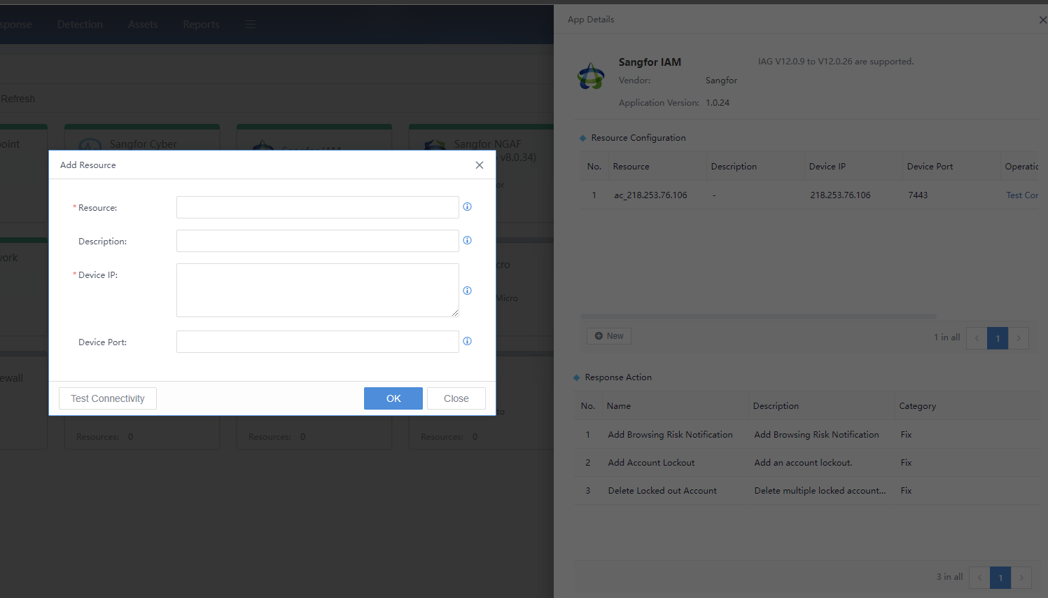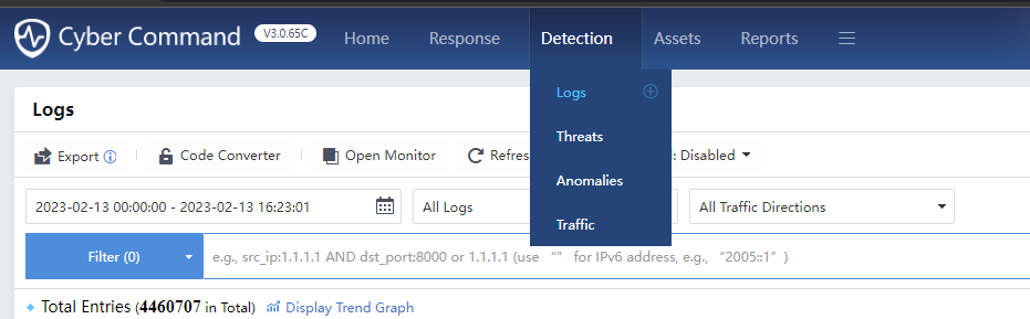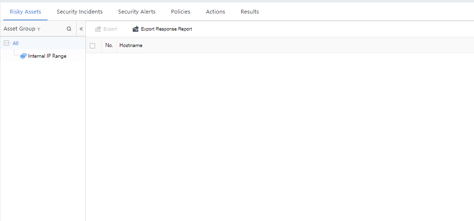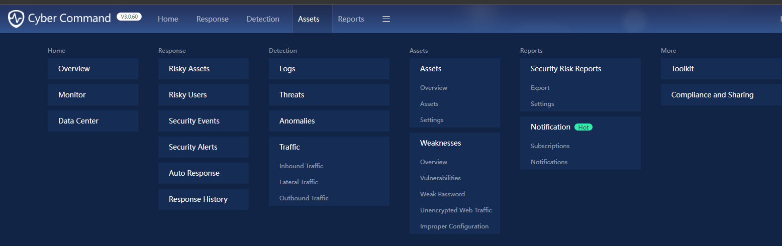 Log in to the Web UI configuration page. You will see the following configuration modules: Home,Response,Detection,Assets, Reports,Navigation, Holistic, and More.