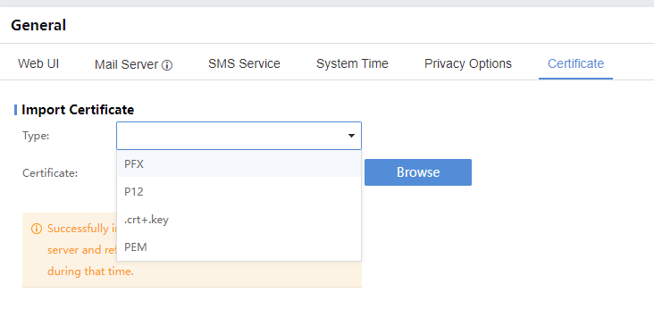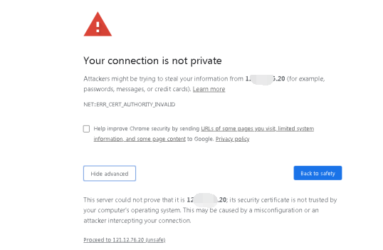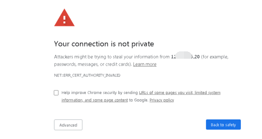 Firstly, configure an IP of network segment 10.251.251.X for the local unit (such as IP address: 10.251.251.100, netmask: 255.255.255.0). Then enter the Cyber Command’s default login IP address and port: https://10.251.251.252 in the Chrome browser. A security prompt will appear, as shown below: