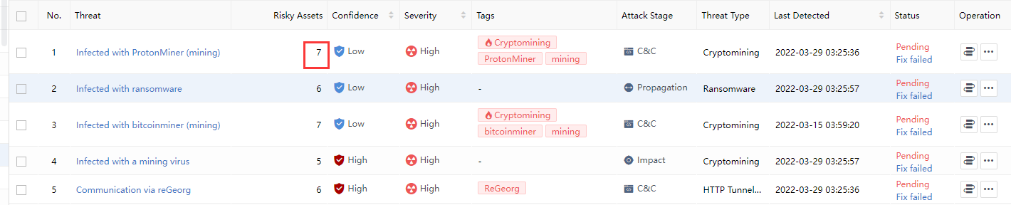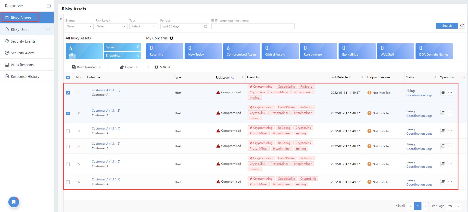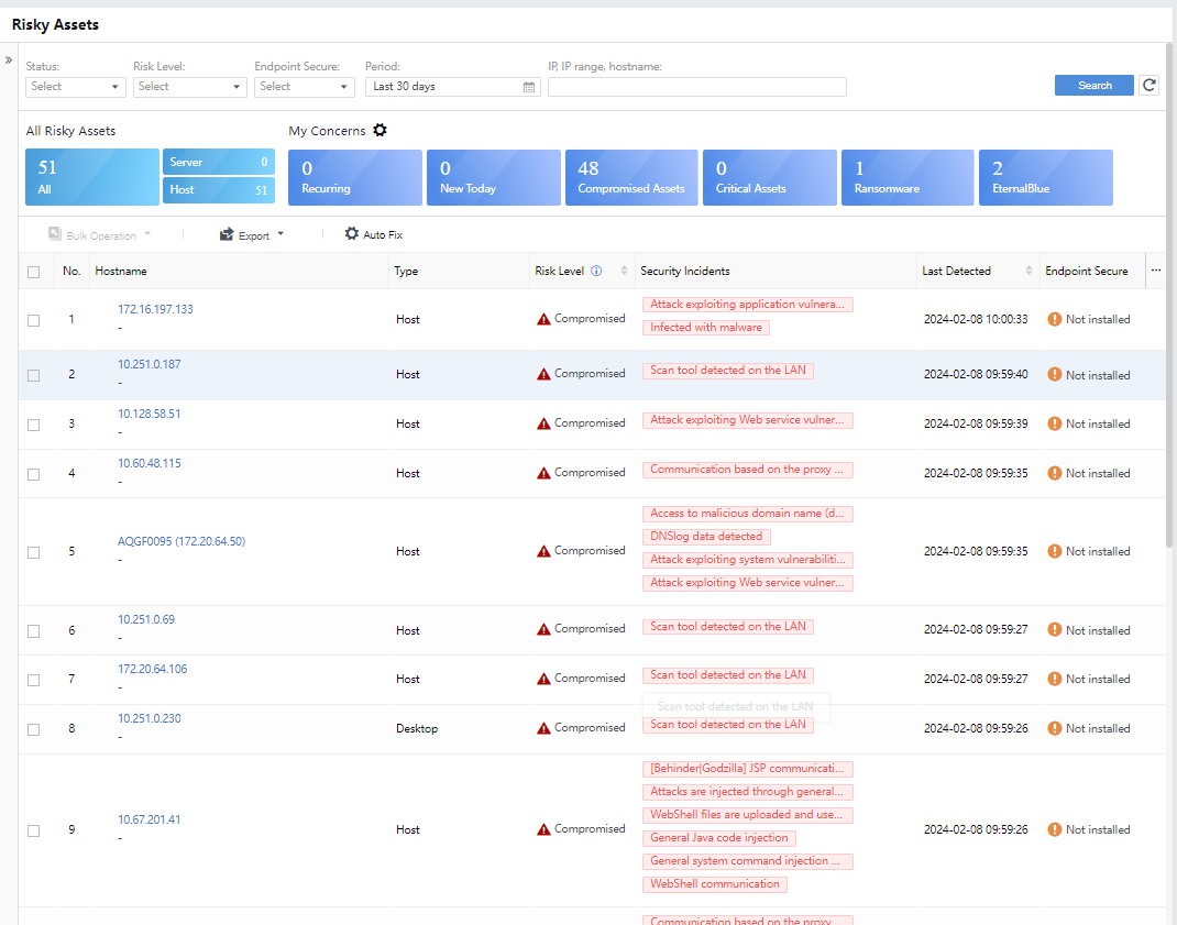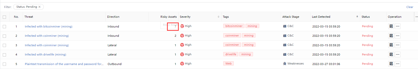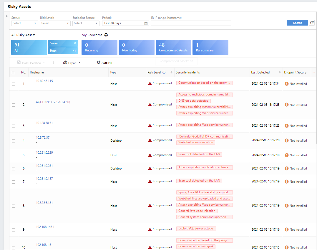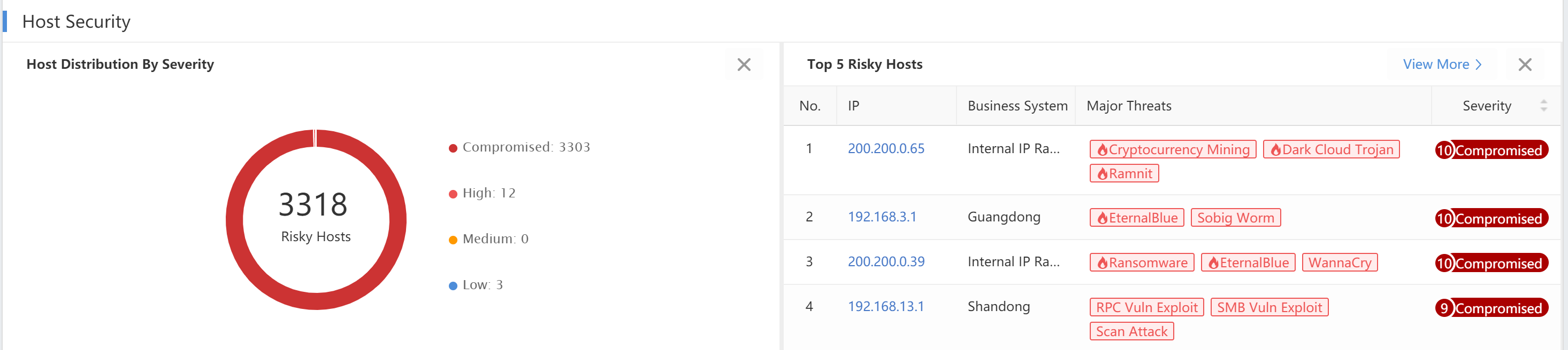 Top 5 Risky Hosts:Rank the Top 5 risky hosts by risk level. Hosts with risk levels after the Top 5 are ranked in random order. Click View More > Response > Risky Assets to see more.
