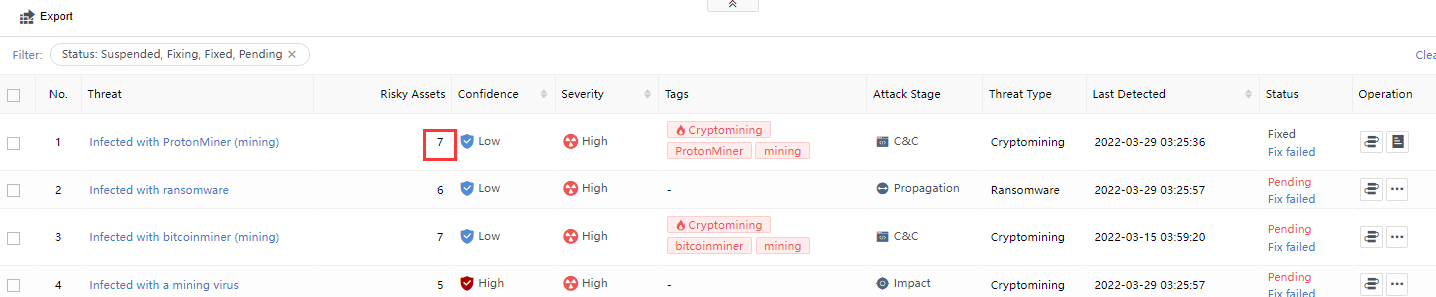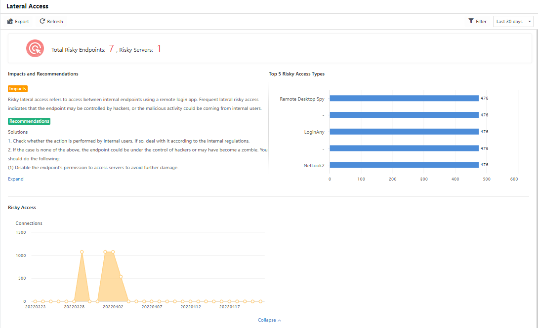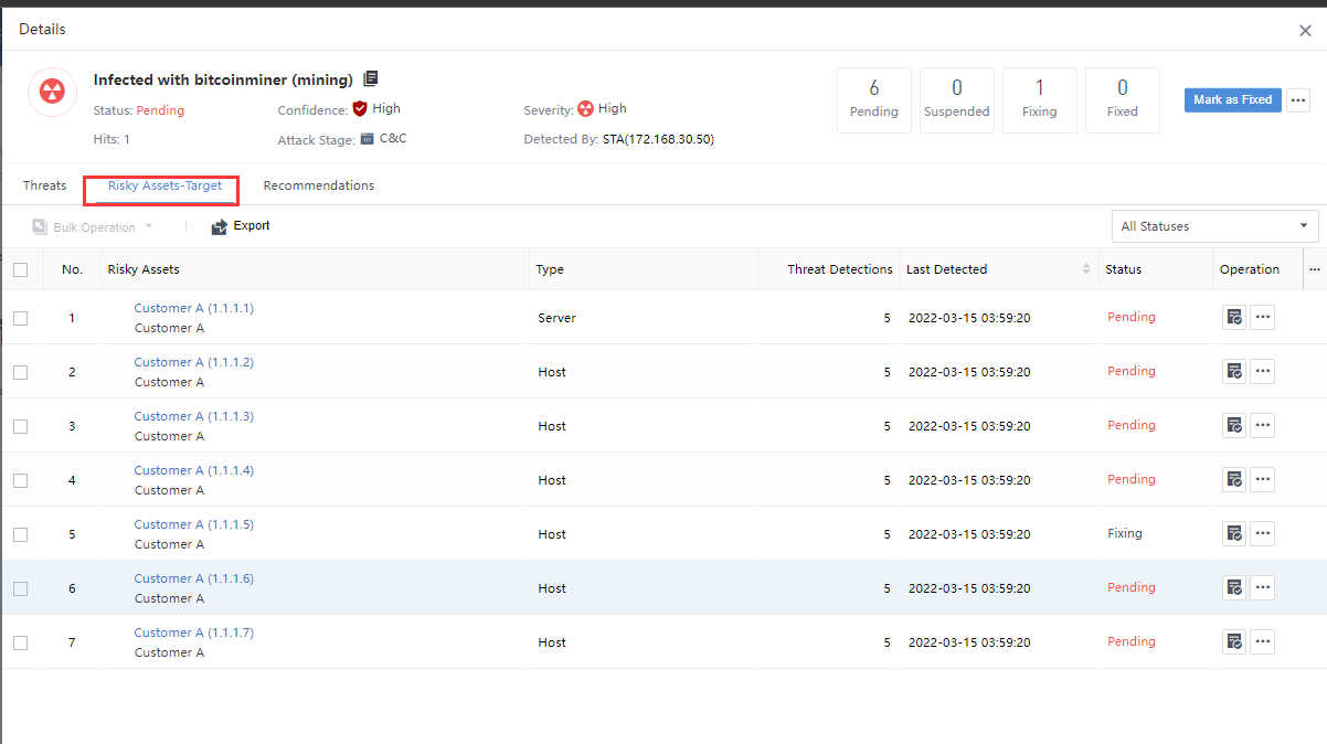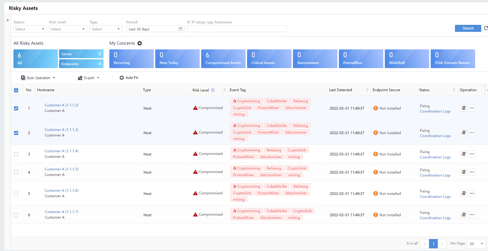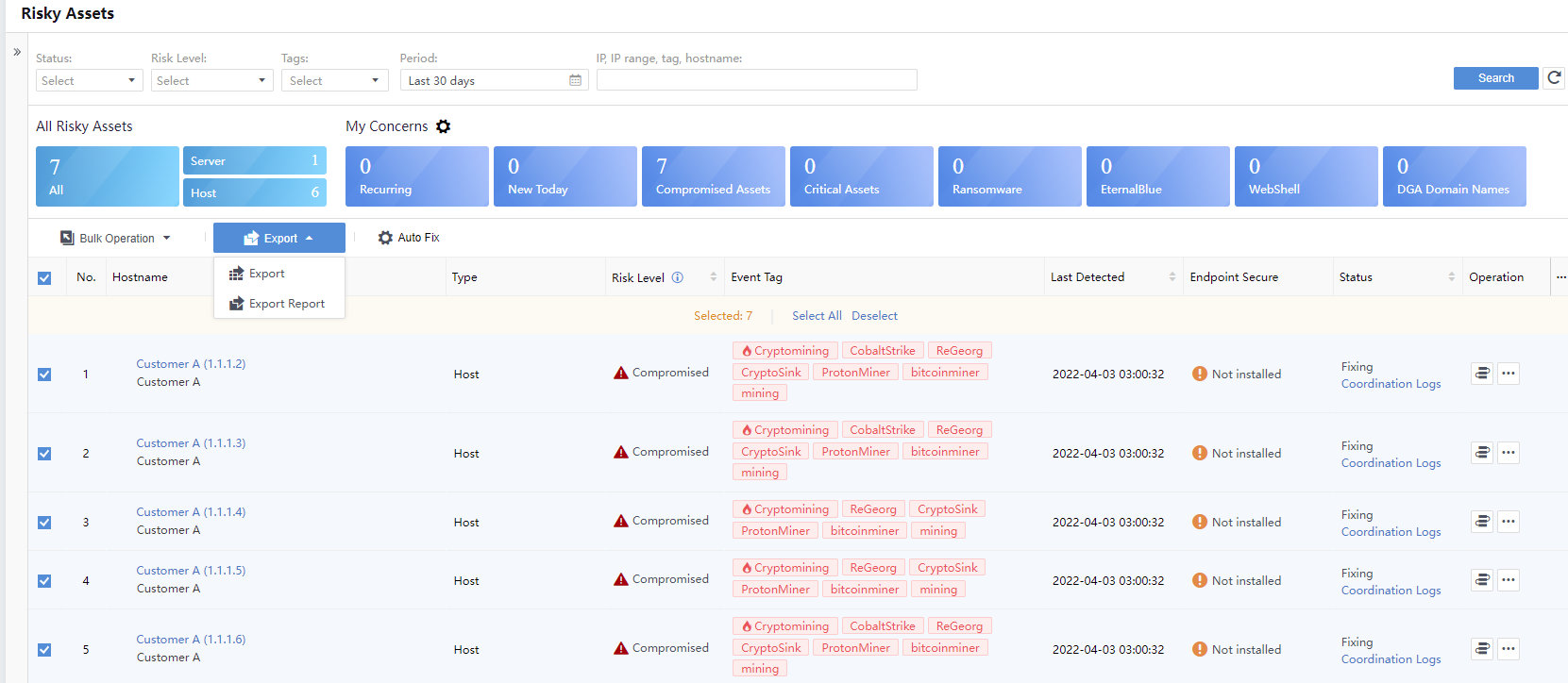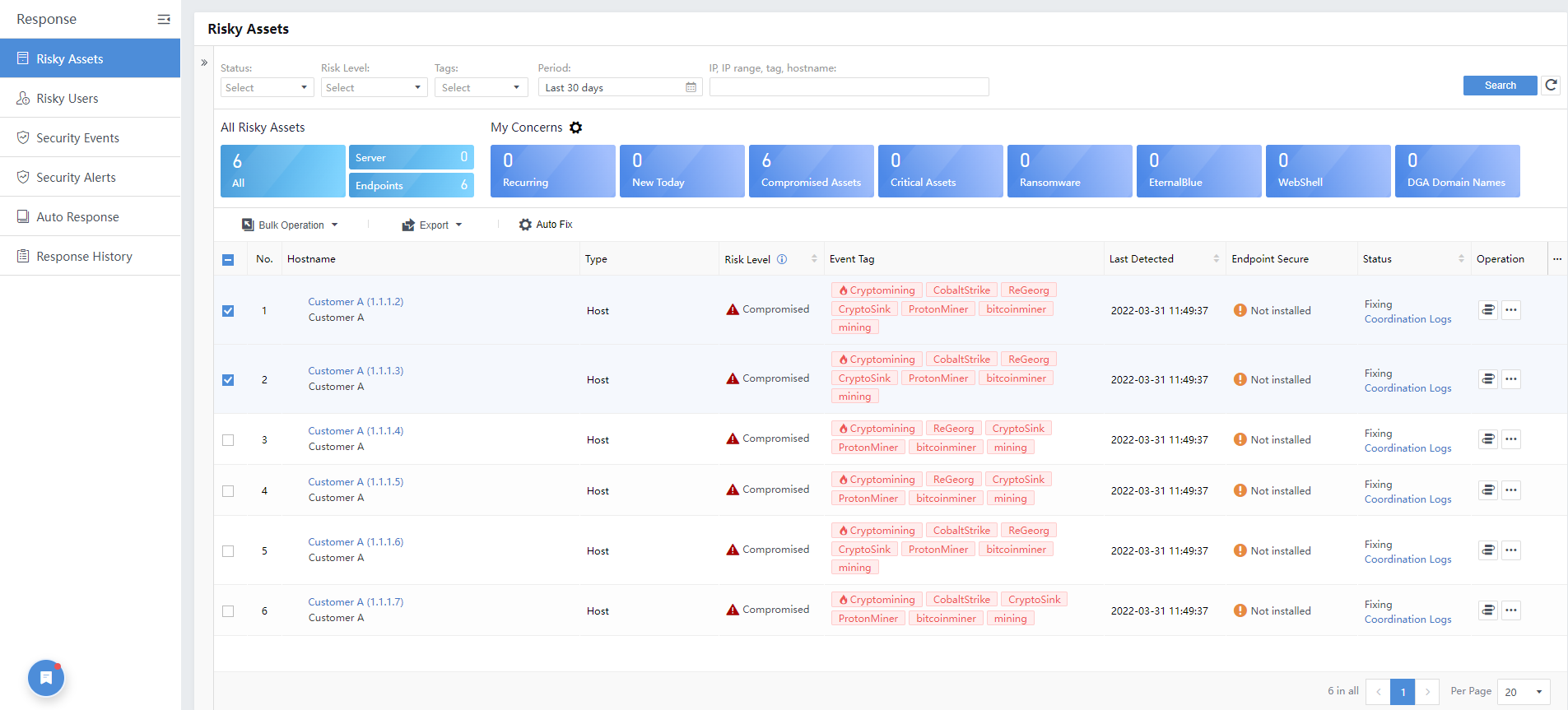 Top 5 Risky Hosts:Rank the Top 5 risky hosts by risk level. Hosts with risk levels after the Top 5 are ranked in random order. Click View More > Response > Risky Assets to see more.