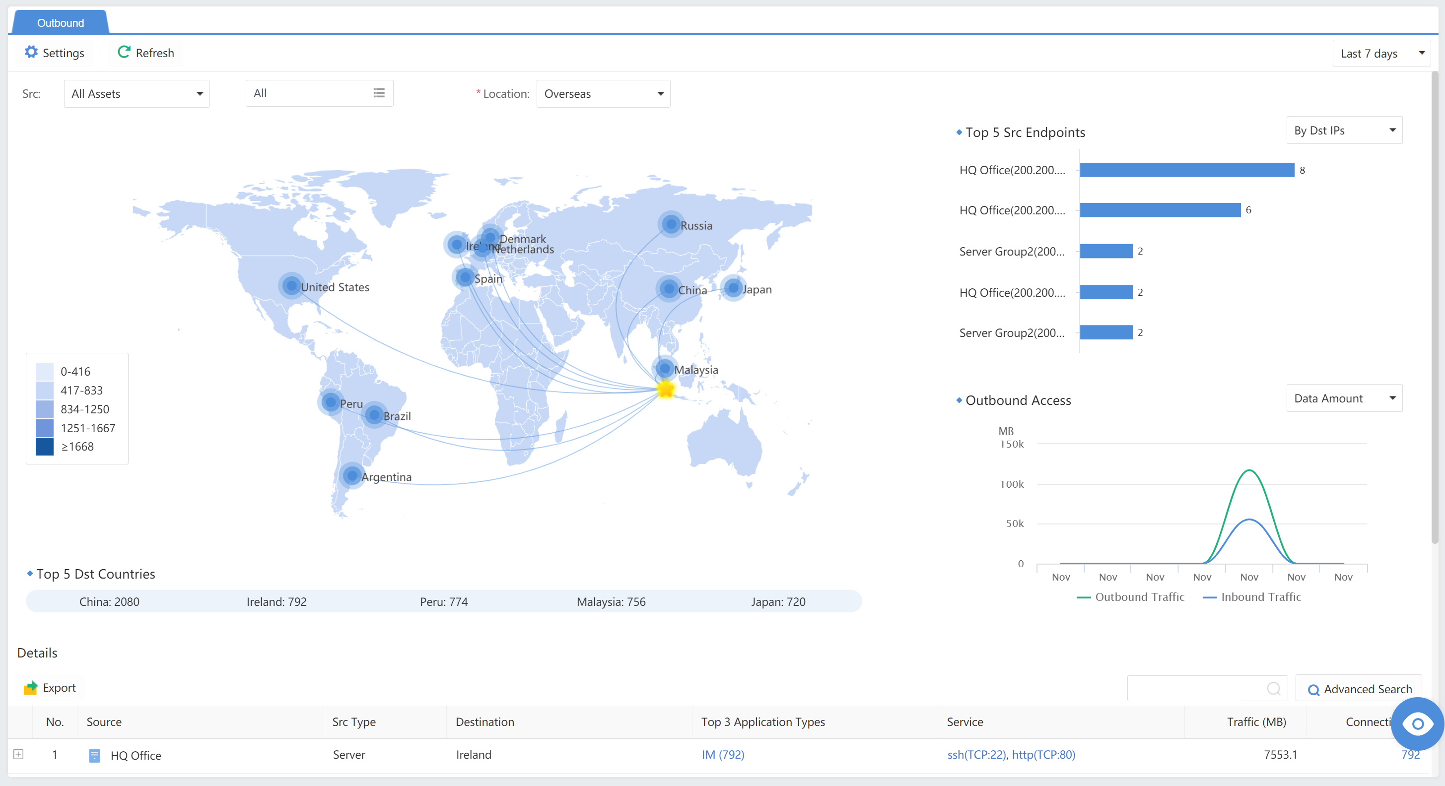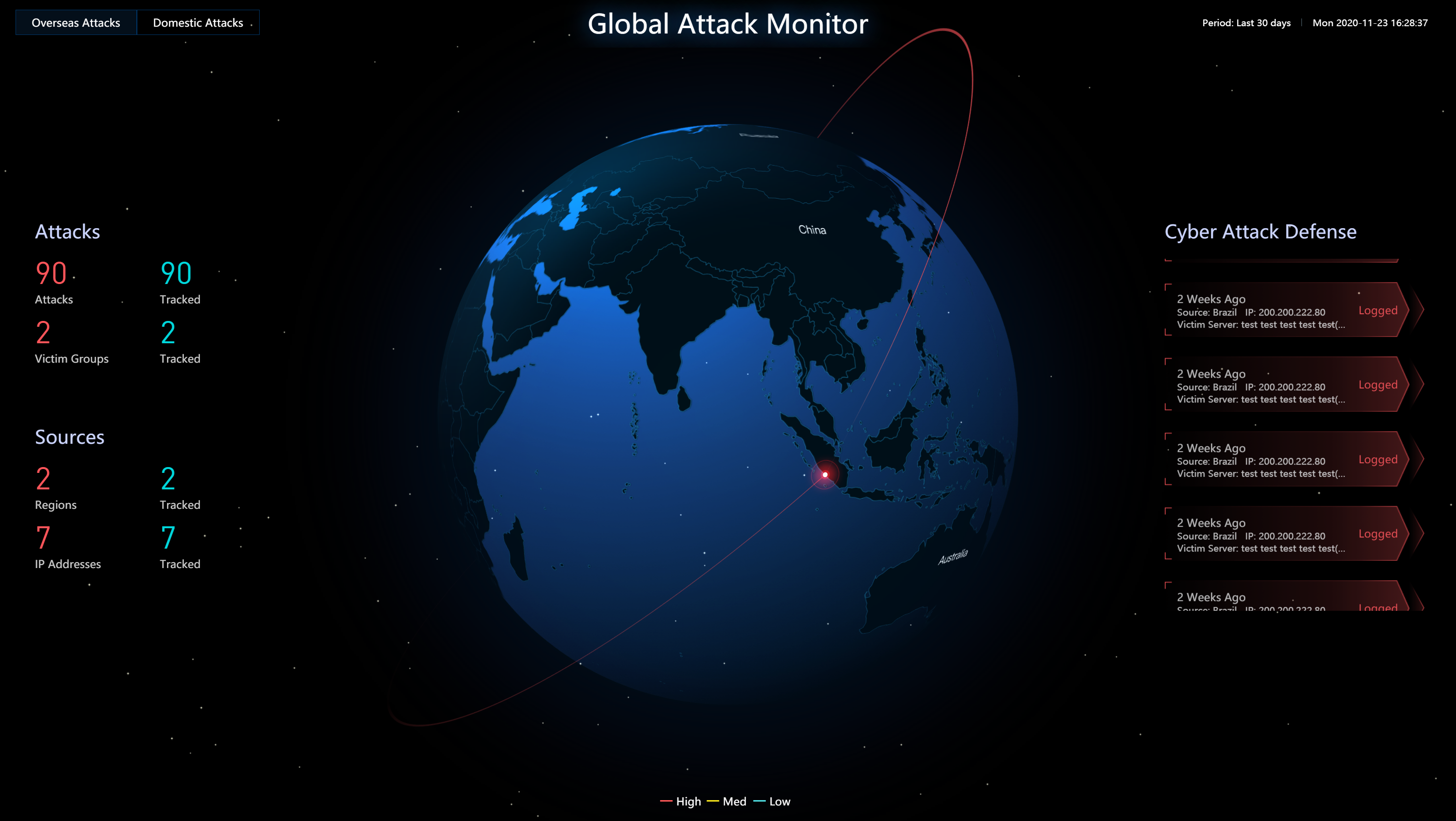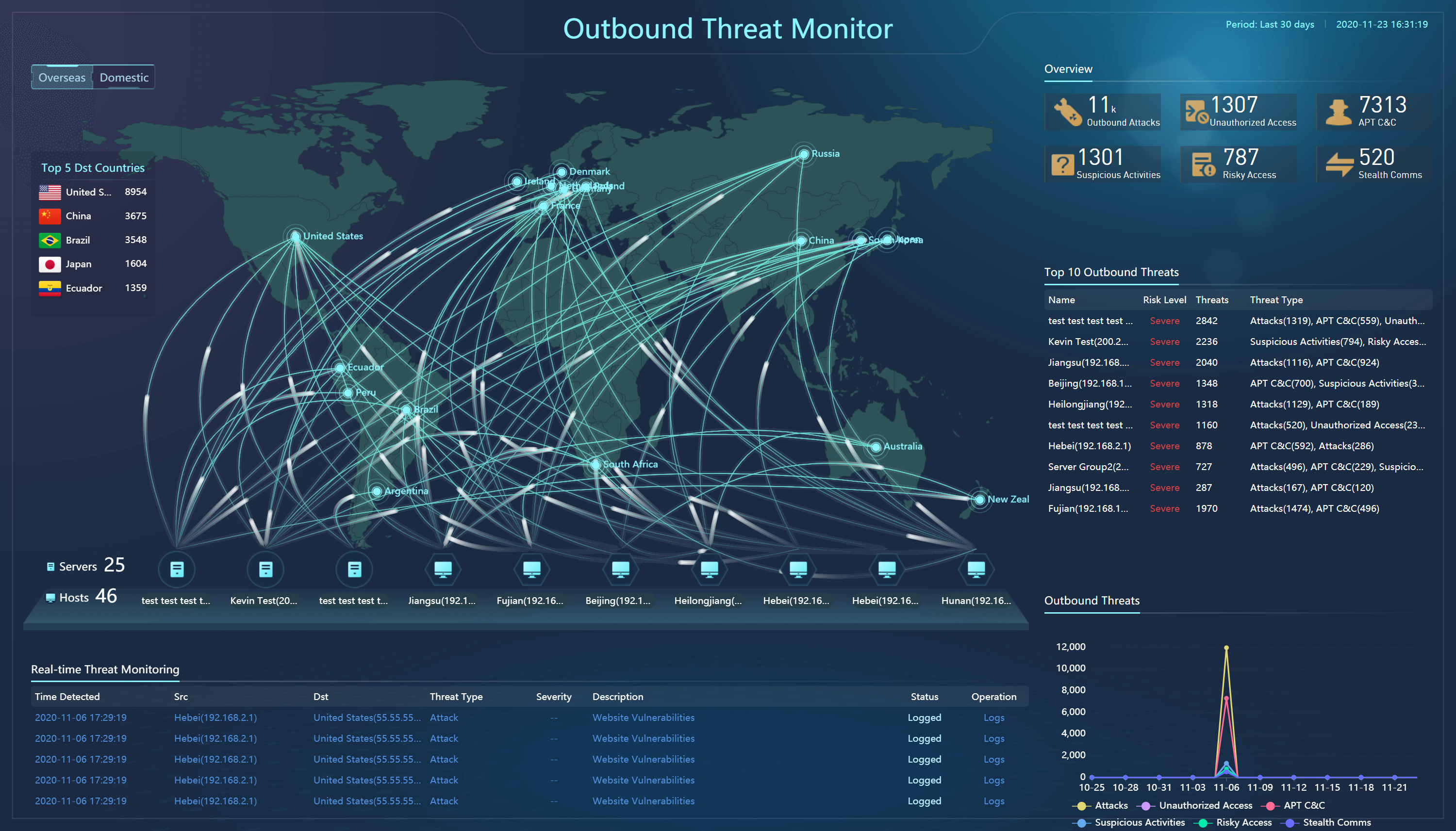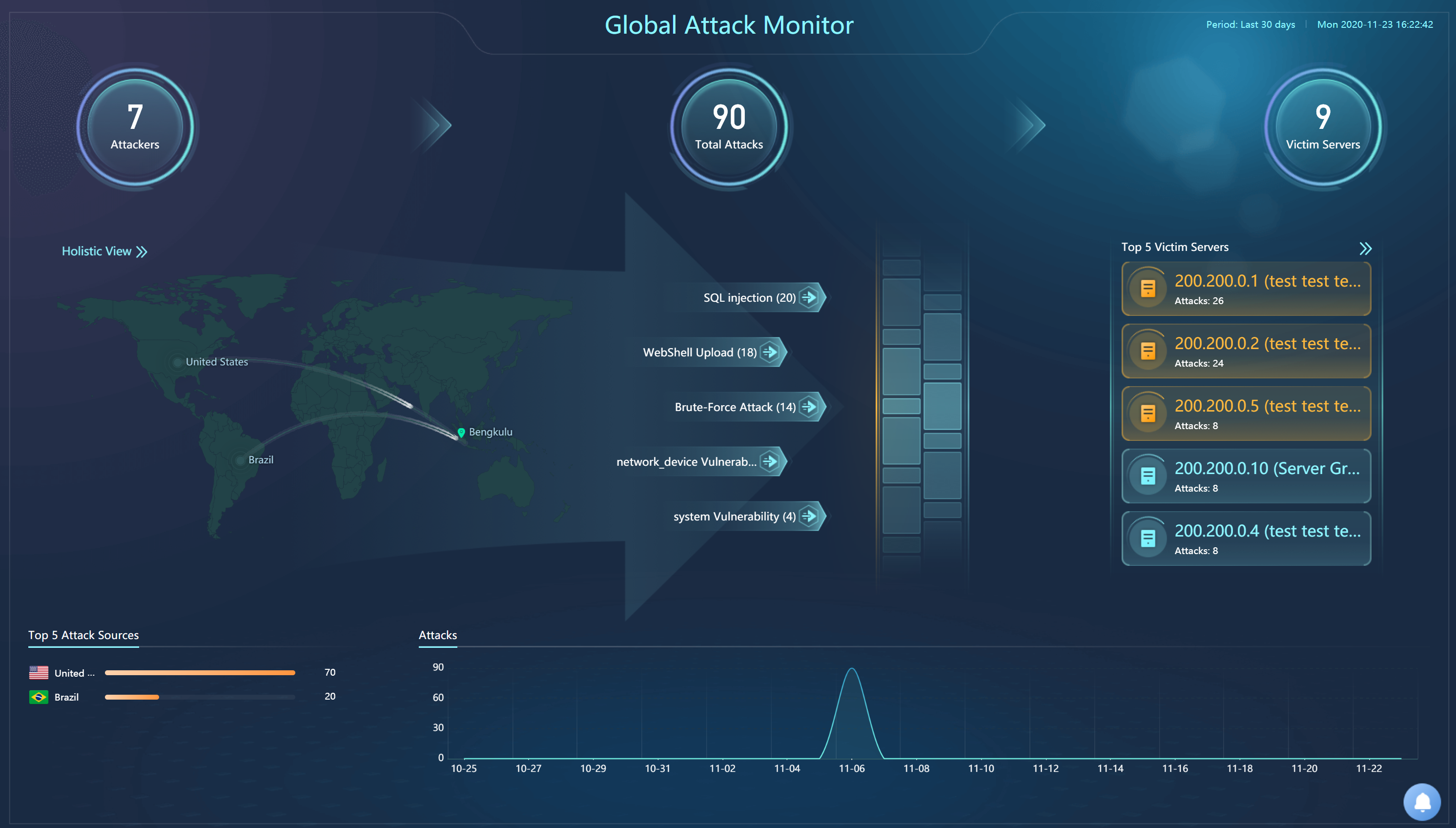 It monitors attacks from the outside and visually displays global attacks and threats confronted by LAN. The physical location of attack sources, attack methods, and attack services are displayed clearly.