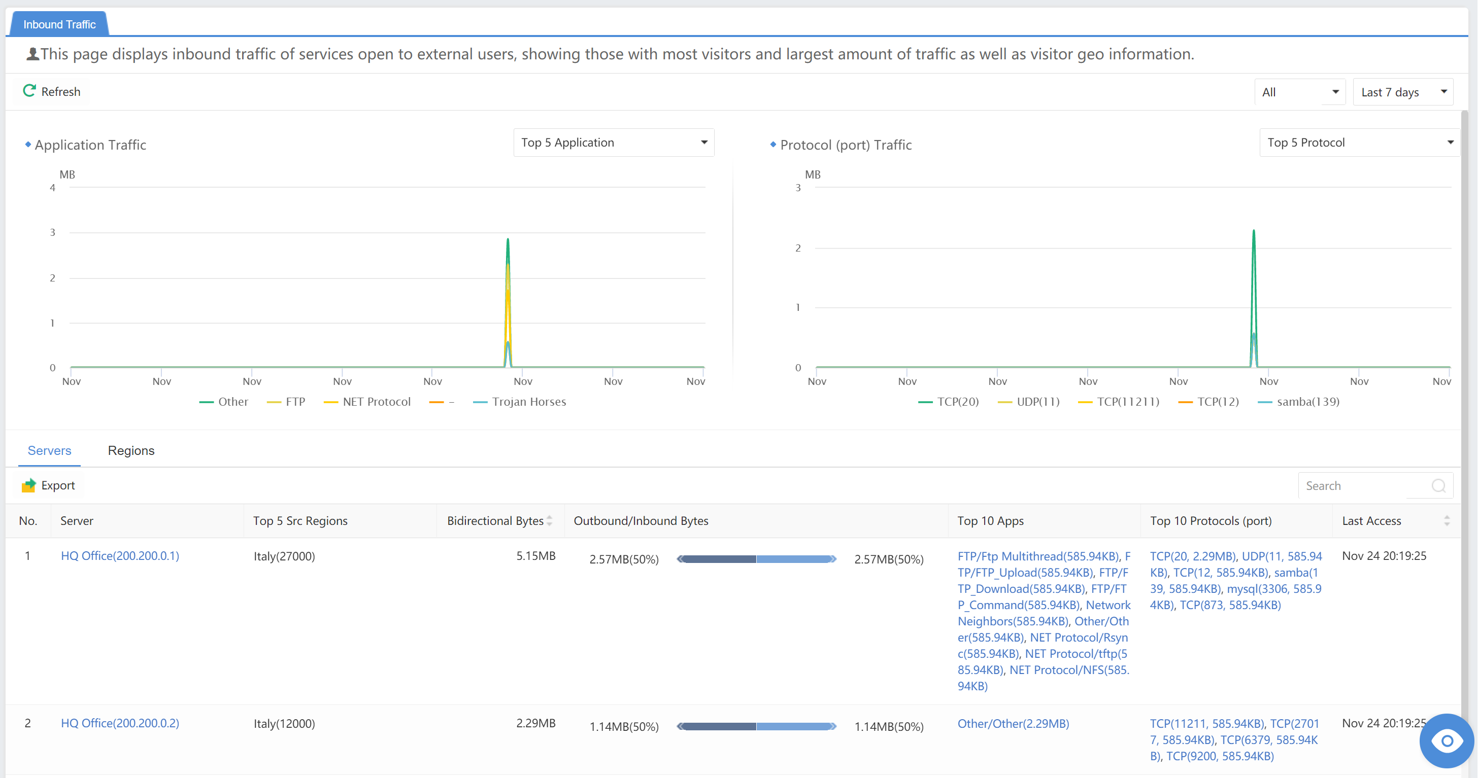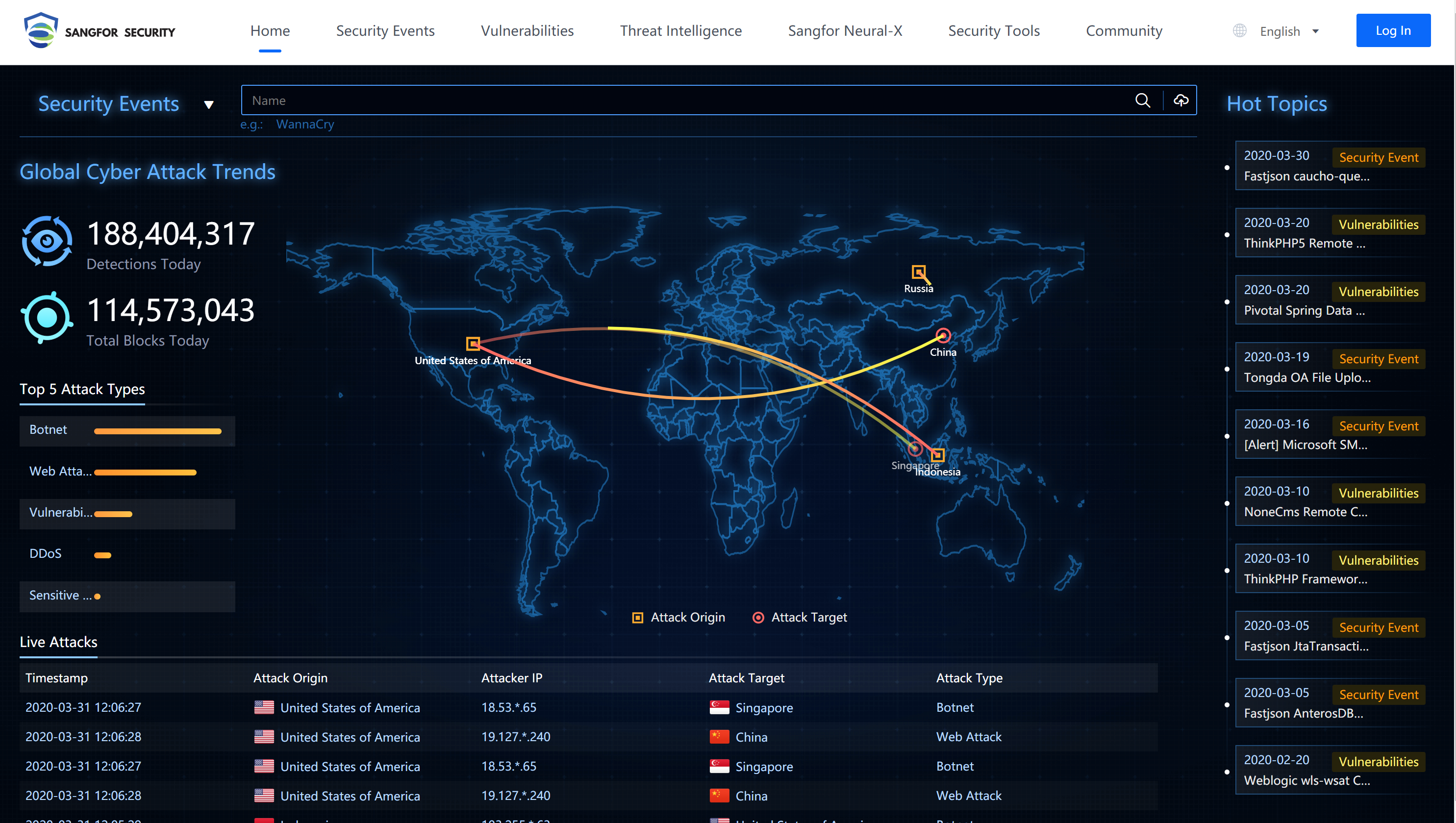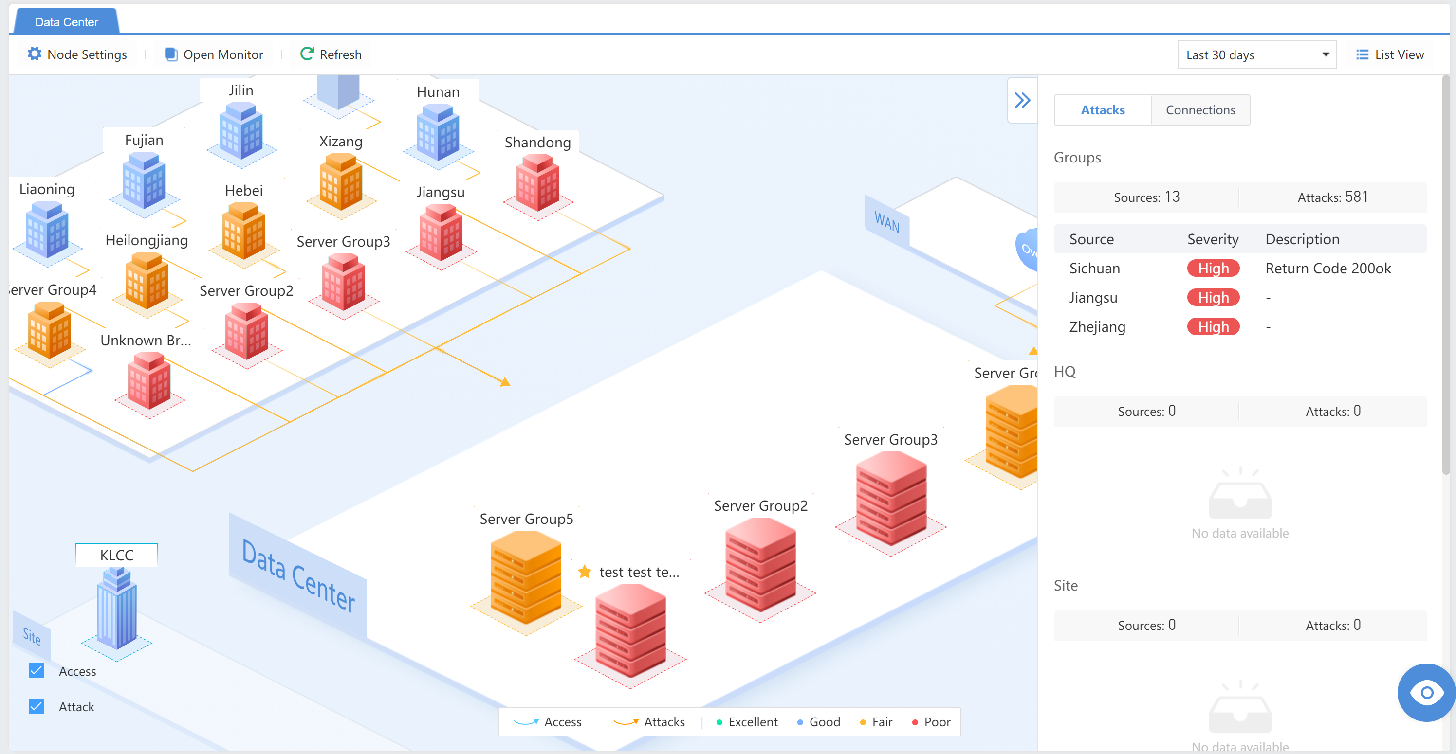 It monitors attacks from the outside and visually displays global attacks and threats confronted by LAN. The physical location of attack sources, attack methods, and attack services are displayed clearly.
