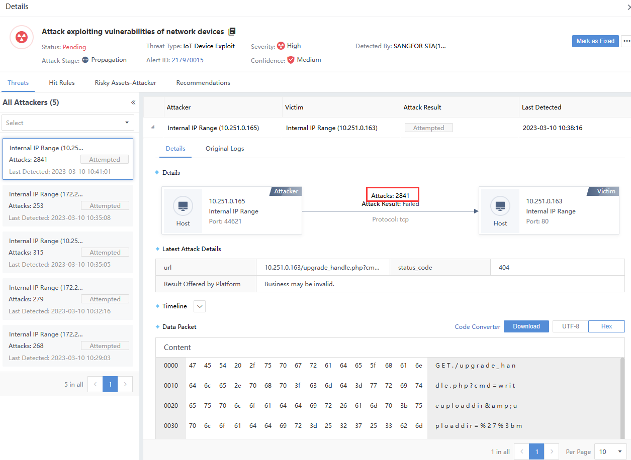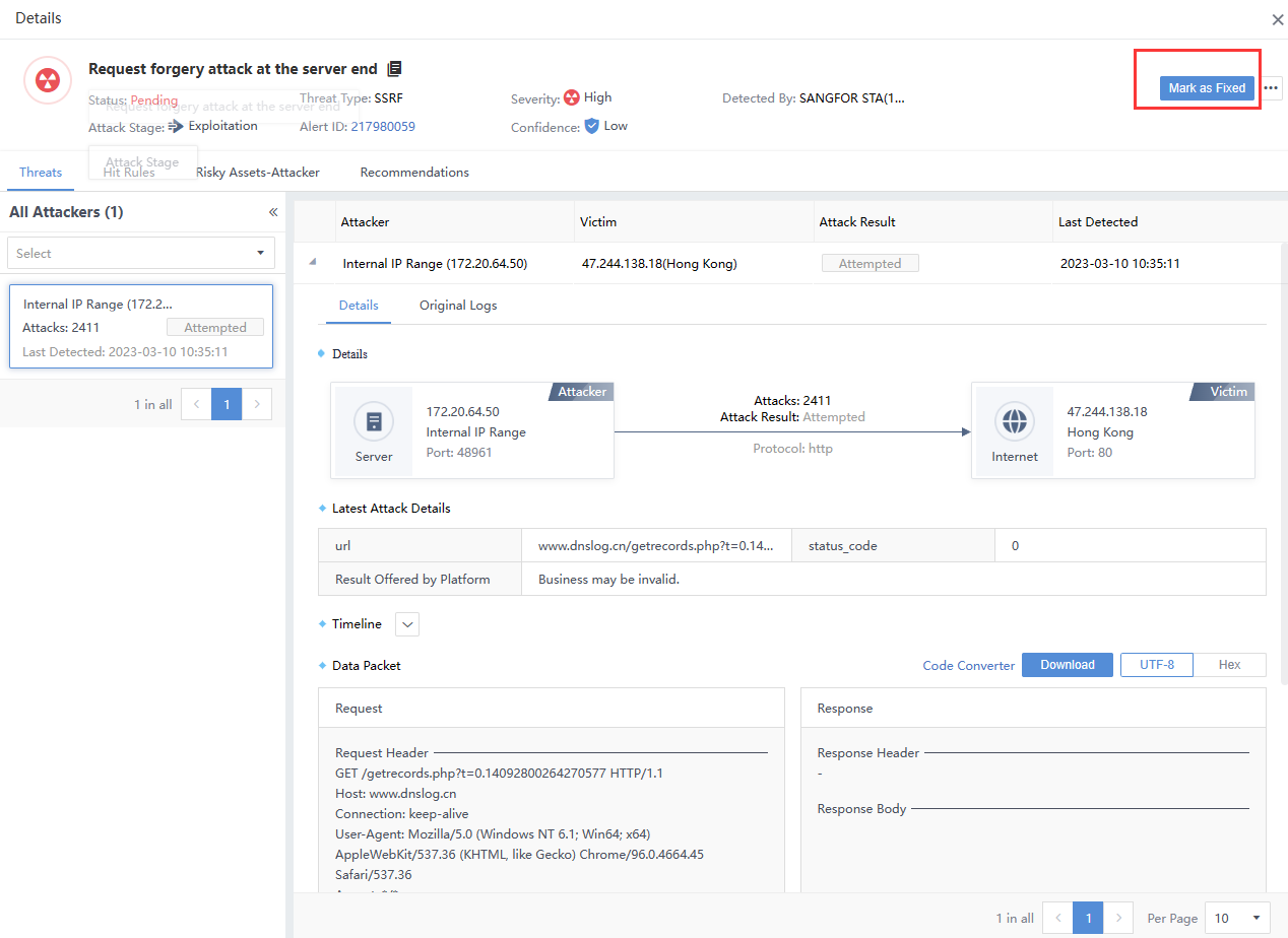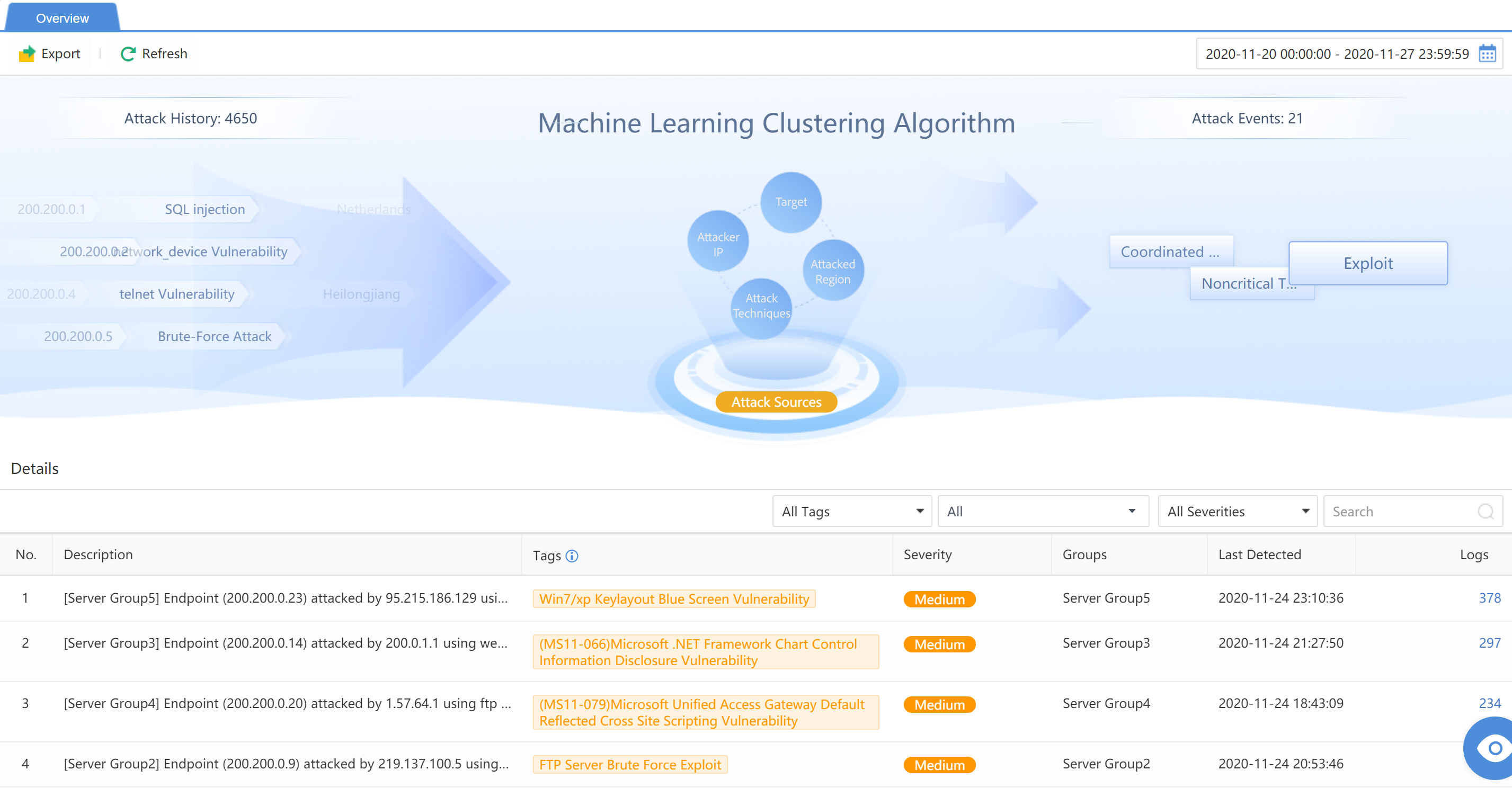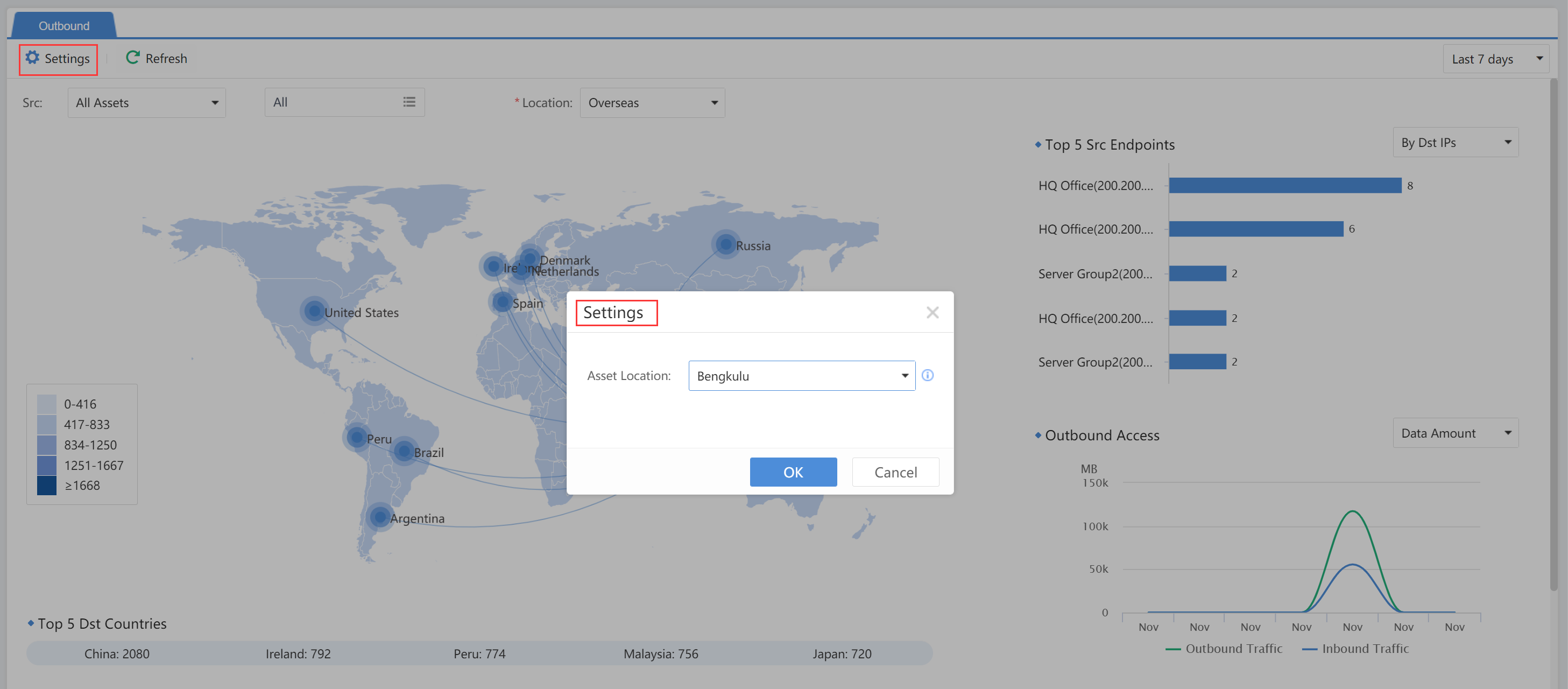 It monitors attacks from the outside and visually displays global attacks and threats confronted by LAN. The physical location of attack sources, attack methods, and attack services are displayed clearly.