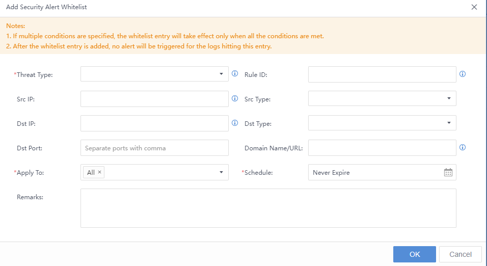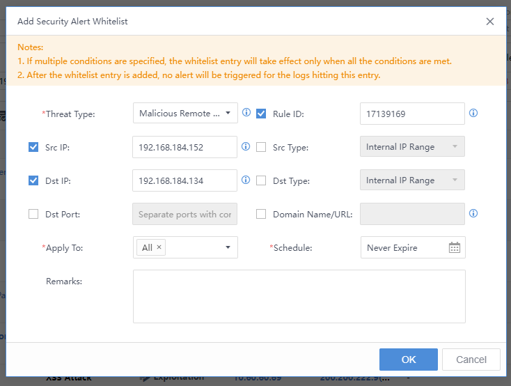Dst IP:After being added, data with this IP as the destination will not record alerts.