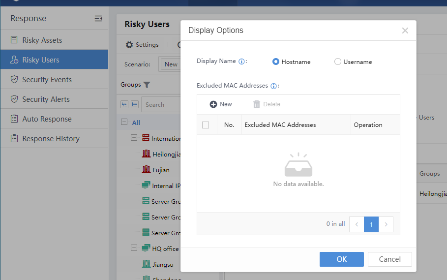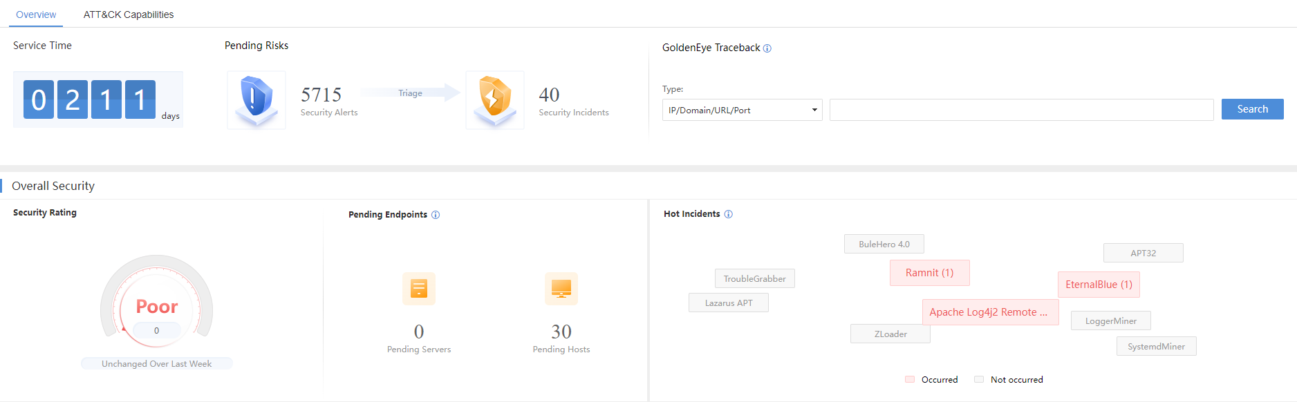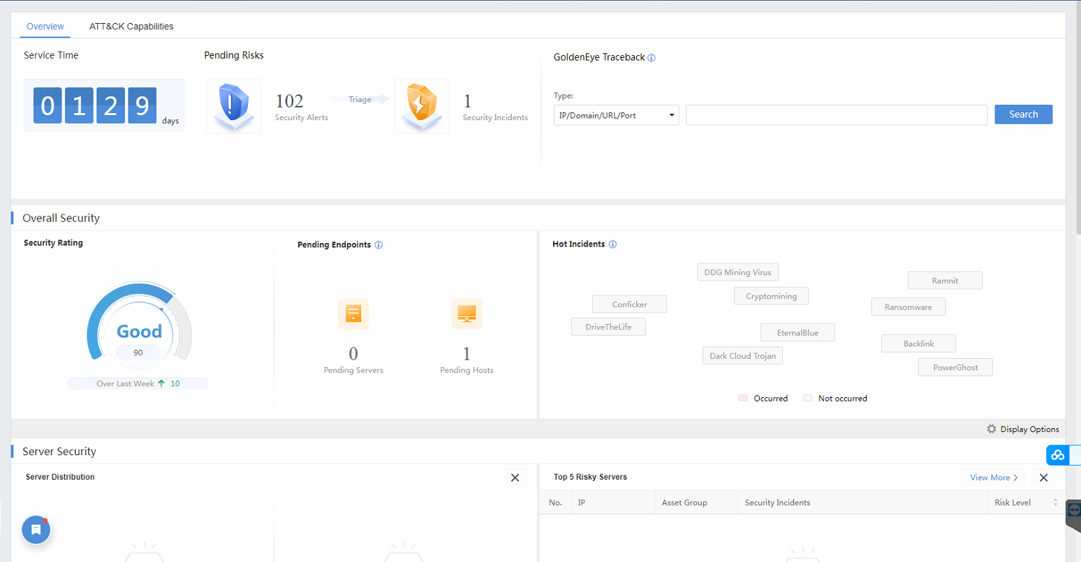 The comprehensive security intelligence displays the general and current situation of Cyber Command, including new events (30 days), fixed and unfixed events, Security Rating, Pending Endpoints, GoldenEye Traceback, and Hot Incidents. You can set the overview module’s display in the Display Options at the bottom right of the interface.