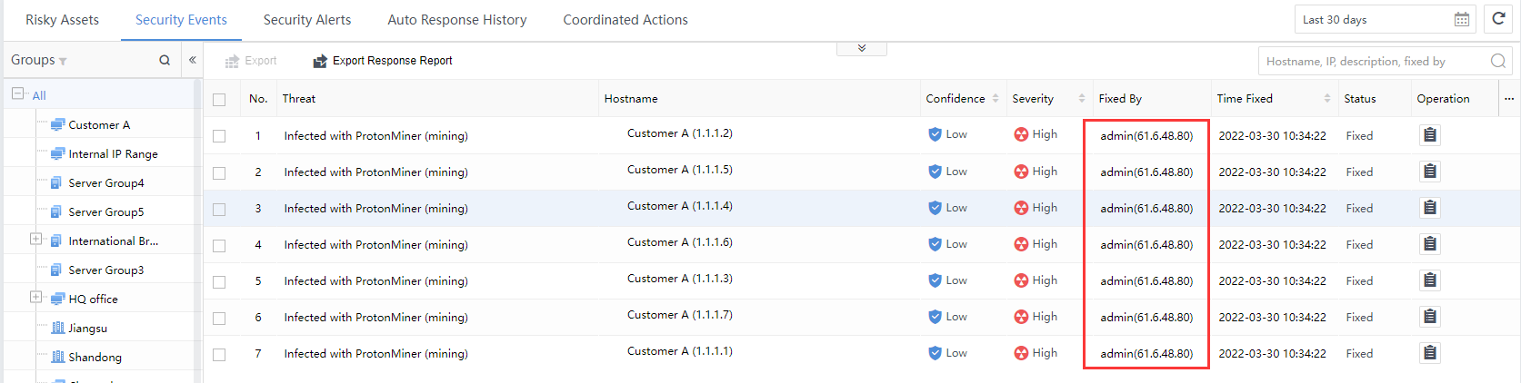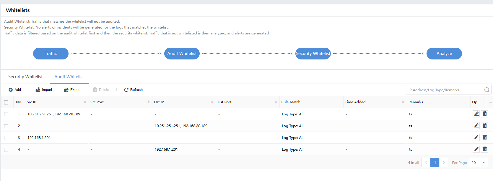 The audit whitelist scenario is suitable for whitening logs at the traffic level. The whitelisted IP addresses will not generate logs. Else, it will generate Security Alerts and Security Incidents.