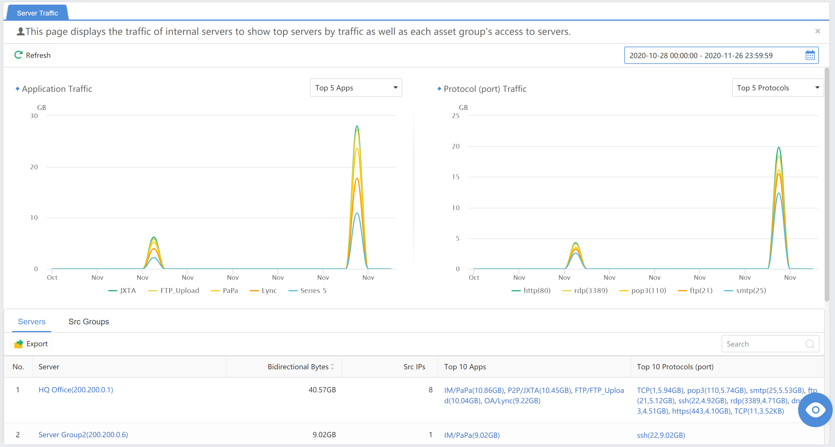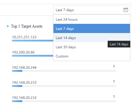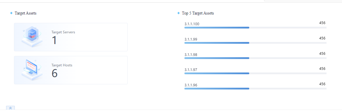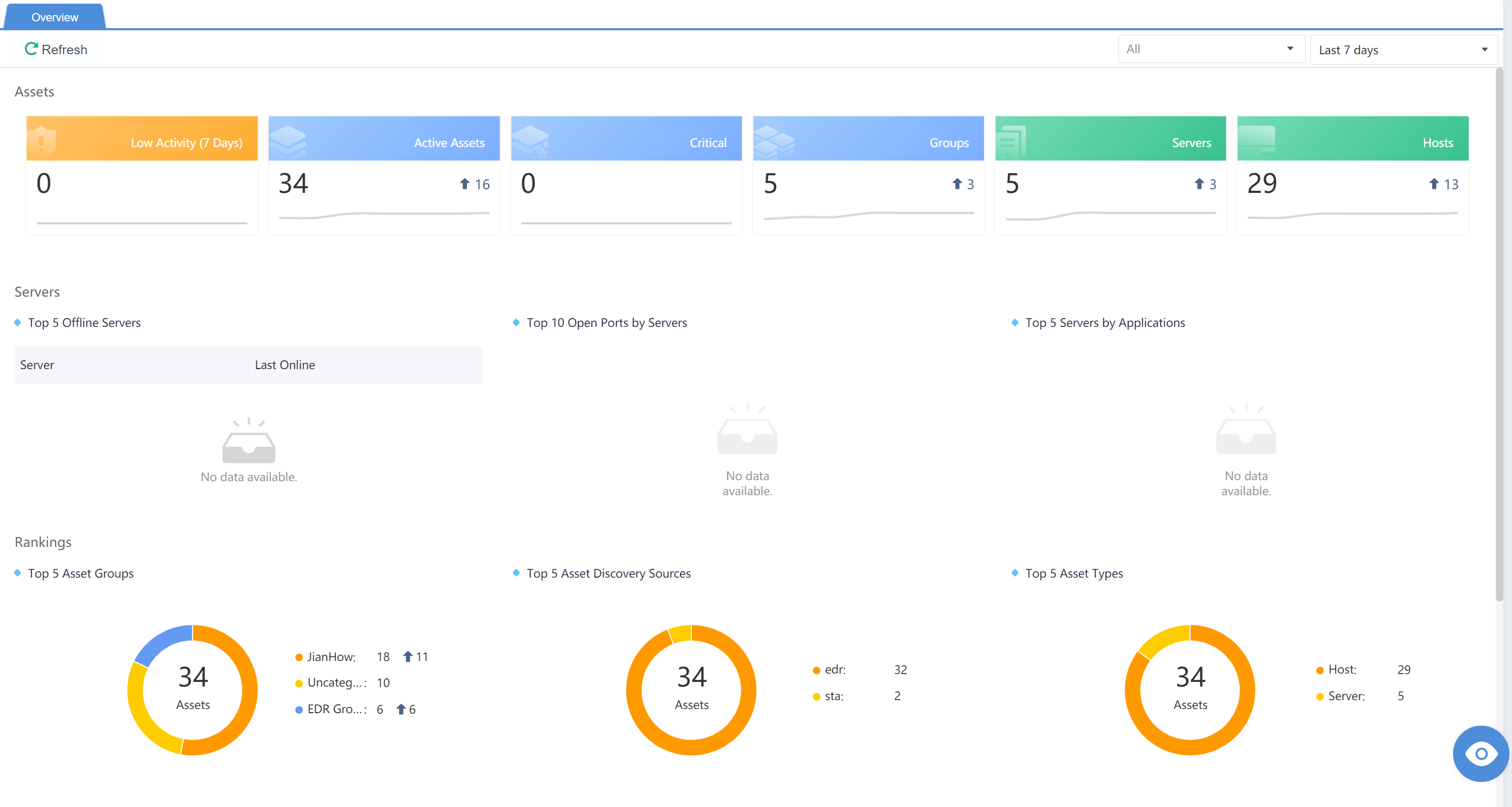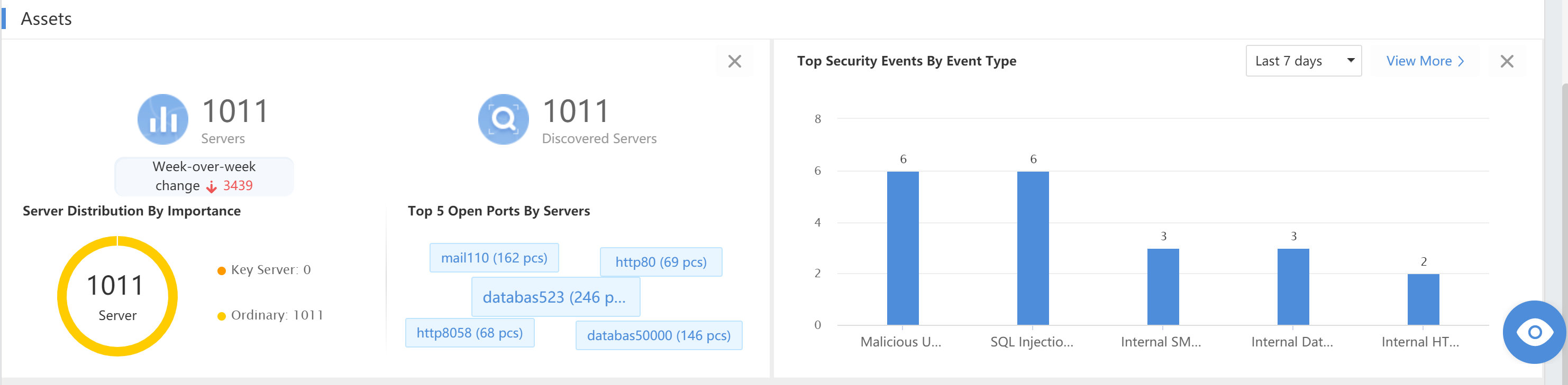 Assets: Display the number of servers, the Server Distribution by Criticality(the server level shall be defined first), and the Top 5 Open Ports By Servers.