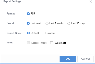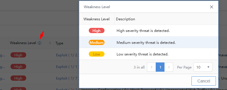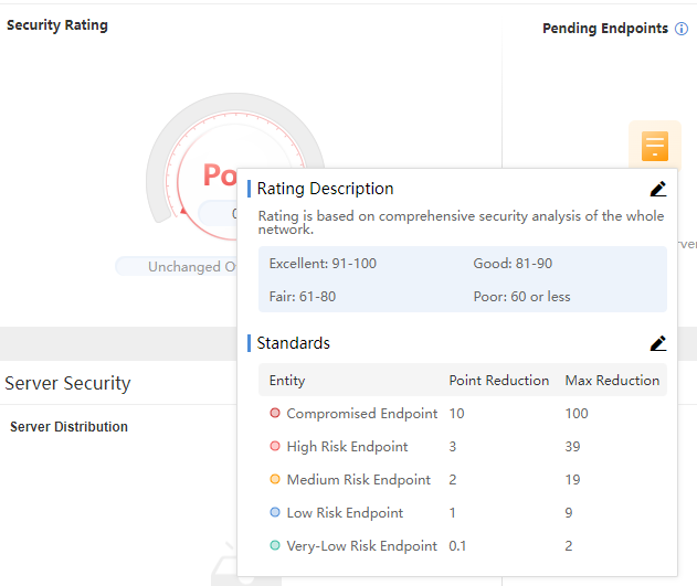 Security Rating:Display the current network rating by giving a score (maximum 100). Score levels include excellent (91-100), good (81-90), fair (61-80), and poor (60 or less). The following table shows the default rating standard: