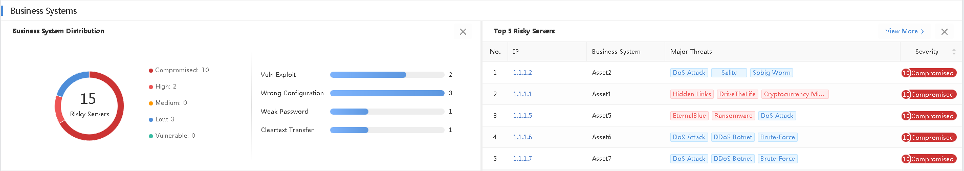 It statistically displays the distribution of business system security, including compromised, high-severity, medium-severity situations, and Top 5 risky servers.
