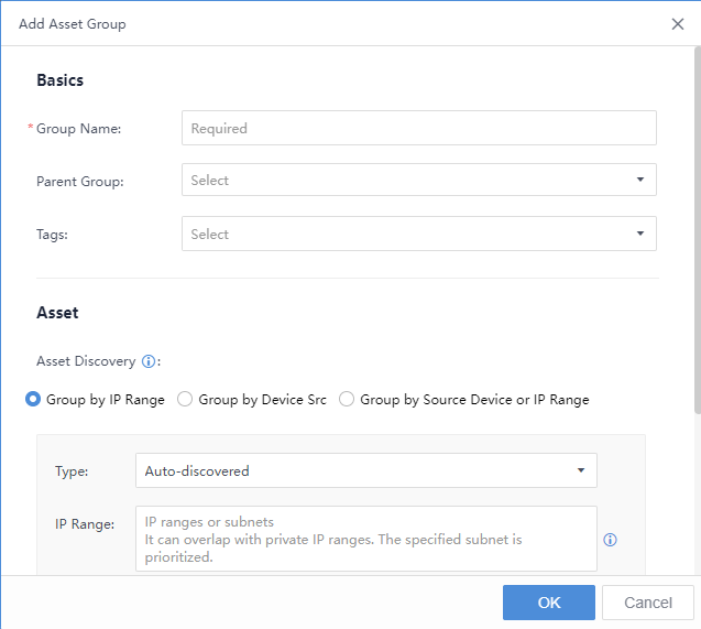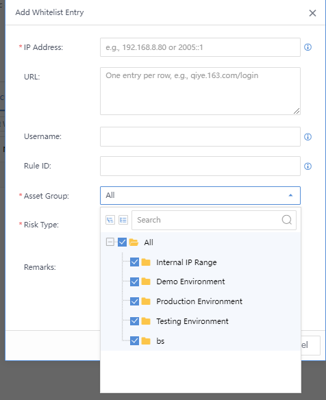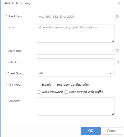 Under the Weakness Scan Whitelist tab, click Add to enter the Add Weakness Scan Whitelist page. Enter the IP address, URL, username, rule ID, asset group, risk type, and other information, then click OK, as shown below.