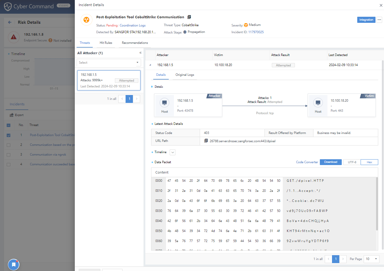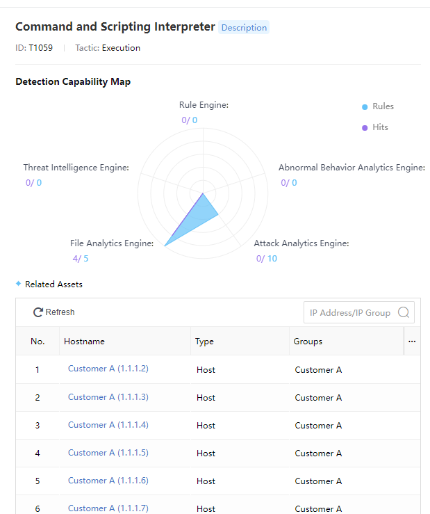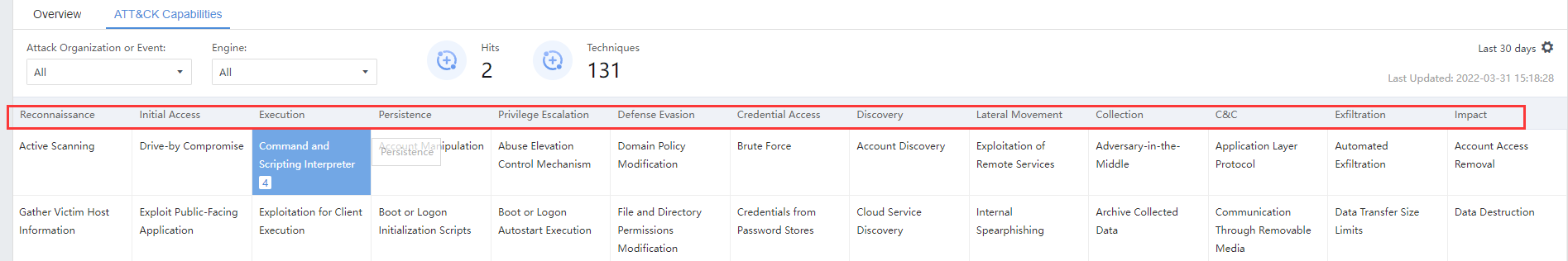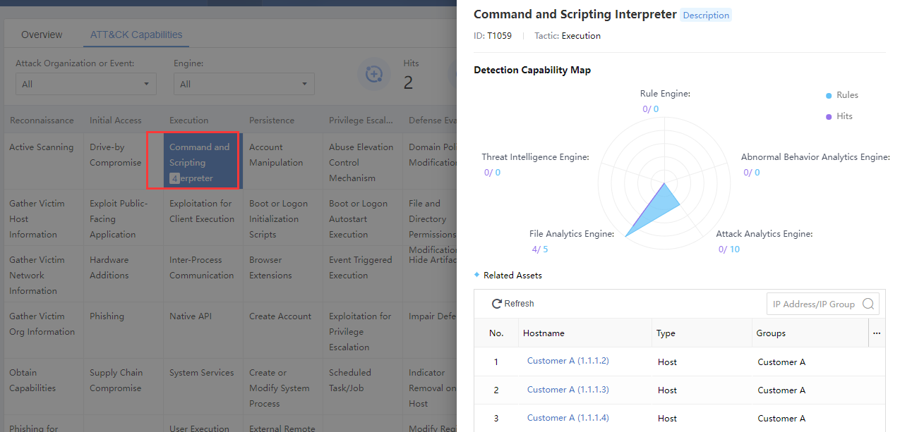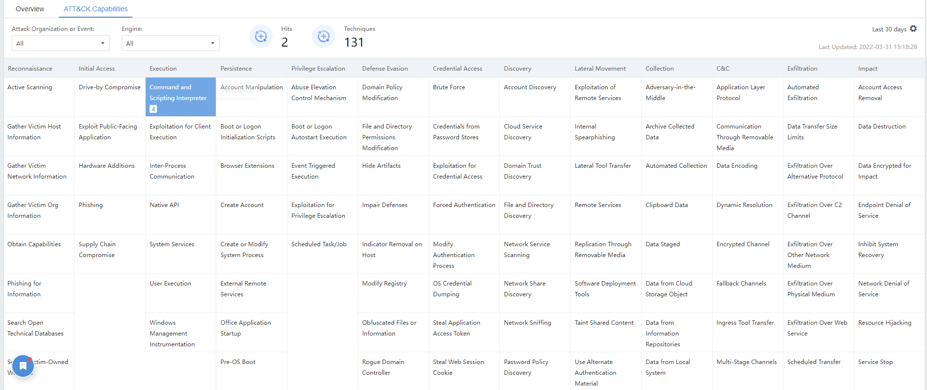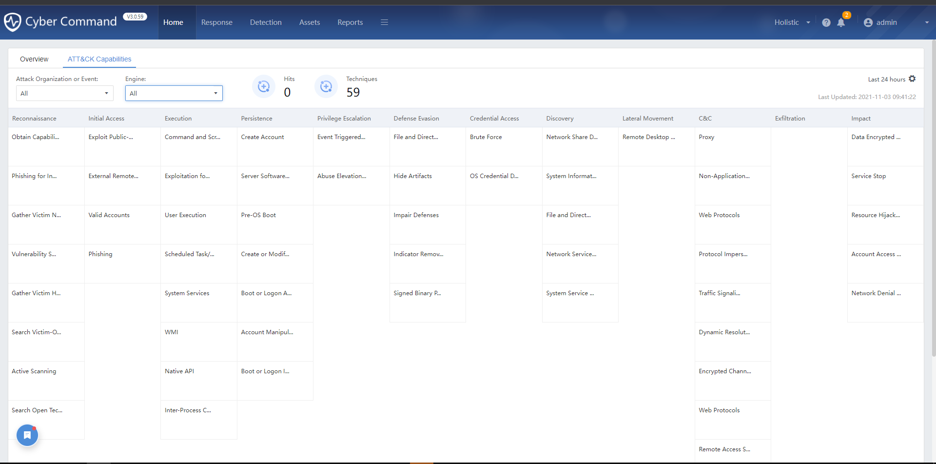 The Cyber Command has a built-in ATT&CK security framework in this version. The maps display the threats detected within the organization according to Hits and Techniques.