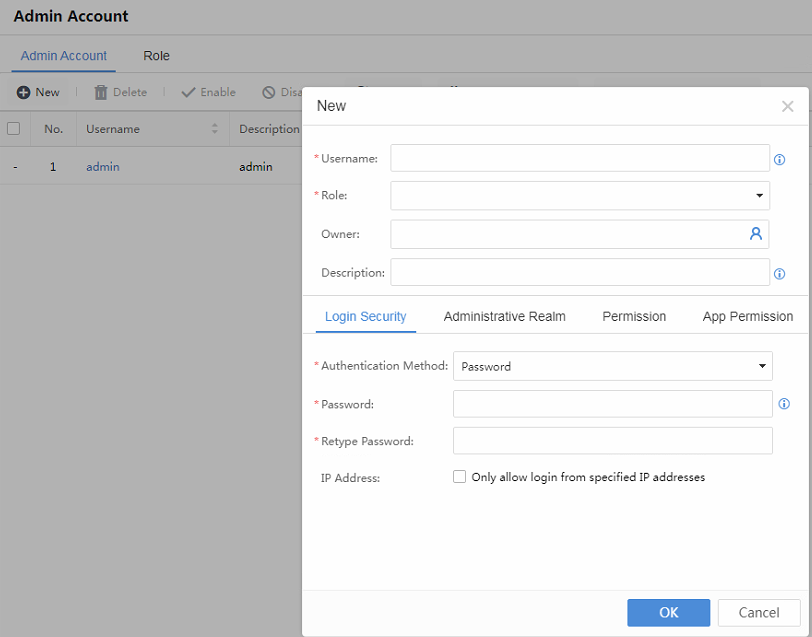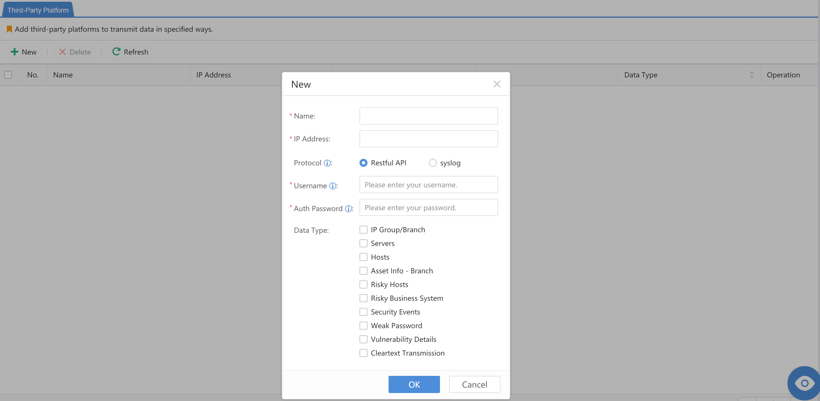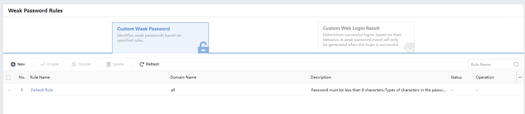 Navigate to System>Security Capabilities > Weak Password Rules and select the Custom Weak Password tab. Click the New button to enter the Add Rule page. The custom weak password rule is mainly for web applications. You need to specify the effective domain name, conditions, account whitelist, password whitelist, weak passwords, etc., as shown below.
