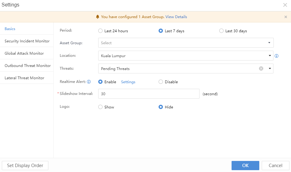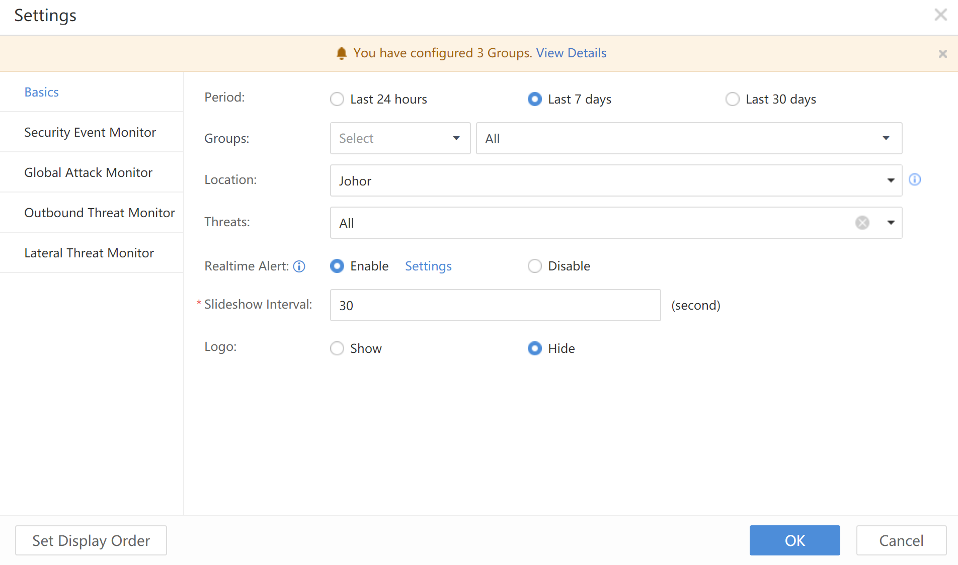 Basics: Define configurations for all interfaces. Choose the data statistics cycle, such as last 24 hours, last 7 days, or last 30 days, enable or disable the Realtime Alert, and select the unit’s physical location and time interval of large screen rotation according to your needs.