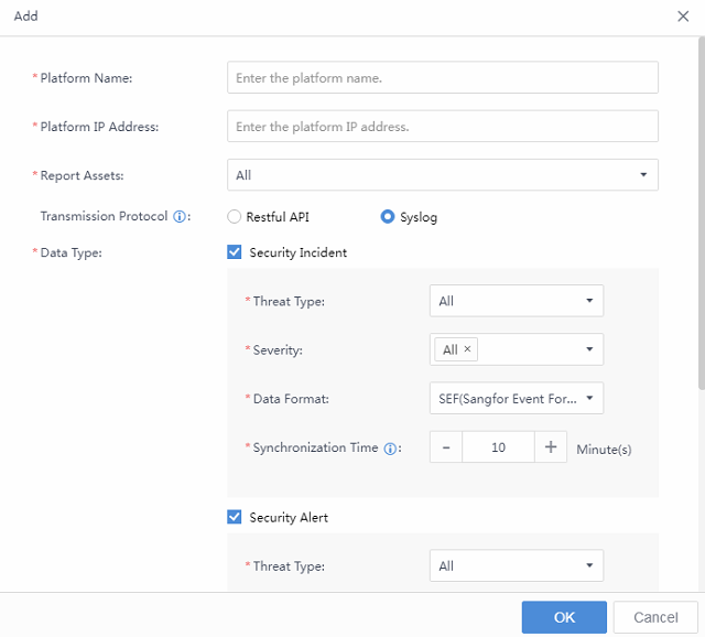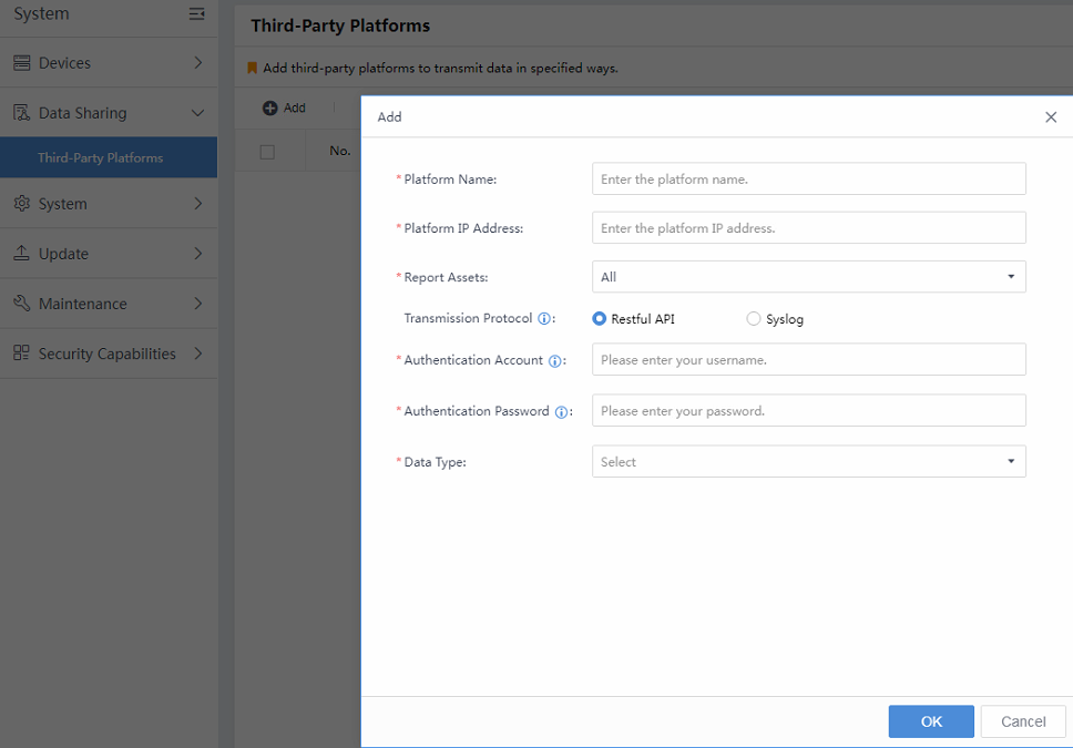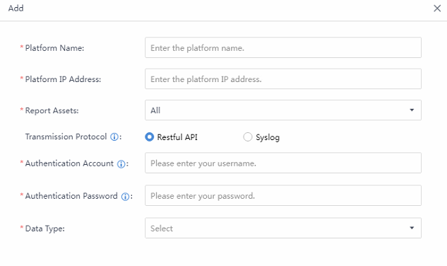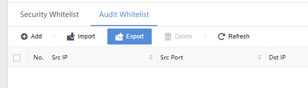 On the System>Security Capabilities>Whitelists page, under the Audit Whitelist tab, click Add to enter the Add Audit Whitelistdialog box. Next, fill in the source IP, destination IP, log type, and other information, as shown below.