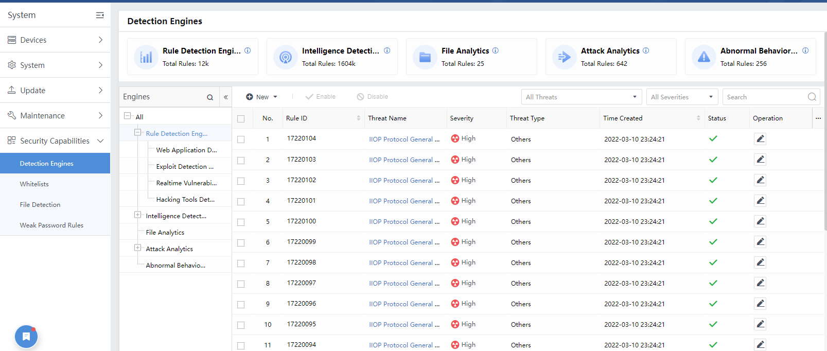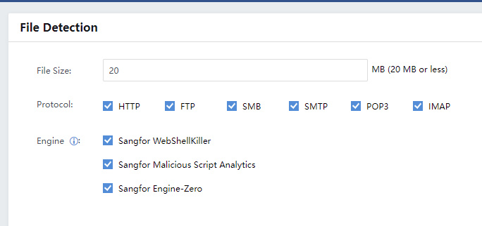 The administrator can adjust the file detection settings, including file analysis size (maximum 20MB), recognized protocol type, selected detection engine, etc., as shown in the following figure.