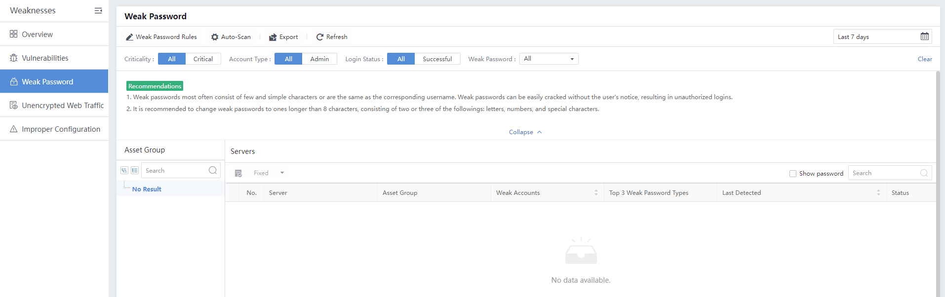 The Weak Password Rules correspond to the Assets > Weaknesses > Weak Password function module, as shown below.