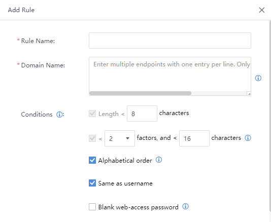 - Conditions: Including minimum password length, number of character types and digits, alphabetical order, same as username and Blank web-access password.