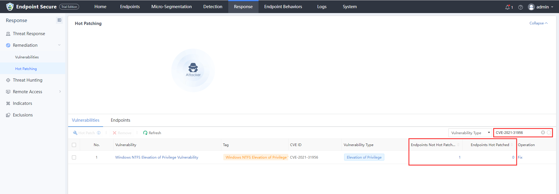 Log in to Endpoint Secure Manager, navigate Response > Remediation > Hot Patching, and click the Endpoints tab. Select the testing endpoint with the vulnerability and click Hot Patch.