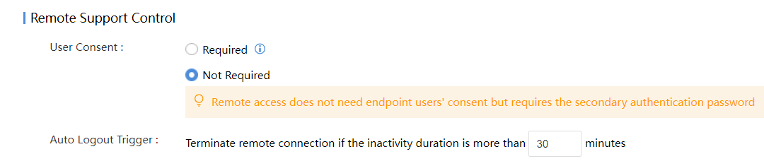 Navigate to Endpoints > Security Protection > Endpoint Control, and set the endpoint control policy of the group where the endpoint that needs to be remotely controlled is located, as shown in the figure below. Under Remote Support Control > User Consent, select Not Required.