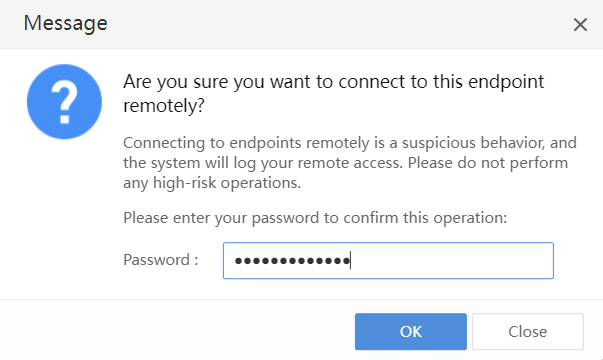 You need to enter the current administrator account password to confirm your identity. After entering the administrator password, click OK to establish a remote connection, as shown in the figure below.