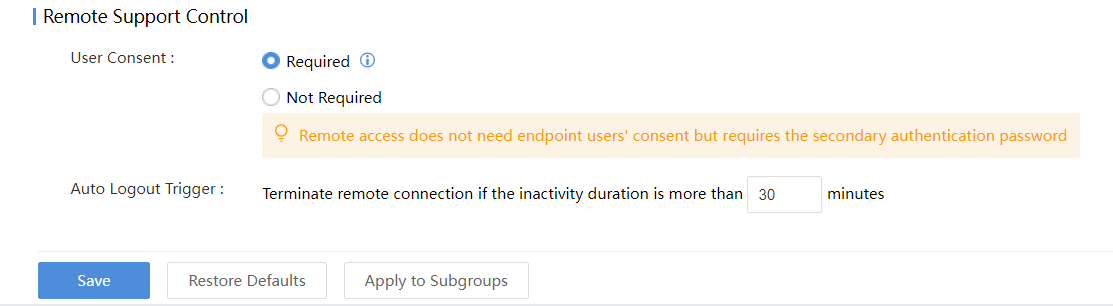 Navigate to Endpoints > Security Protection > Endpoint Control, and set the endpoint control policy of the group where the endpoint that needs to be remotely controlled is located, as shown in the figure below. Under Remote Support Control > User Consent, select Required.