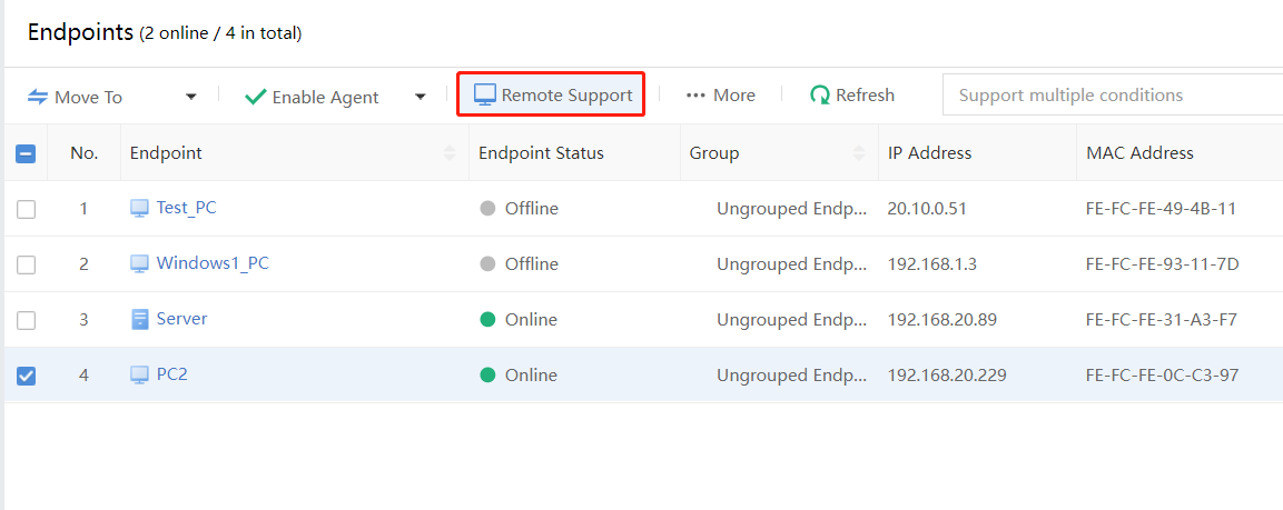 Navigate to Endpoints > Groups, select the endpoint that needs to be remote, and click Remote Support, as shown in the figure below.