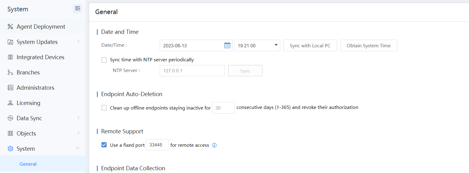 By default, remote support uses a random port to control the computer remotely. You can set a fixed port in advance through System > System > General > Remote Support.