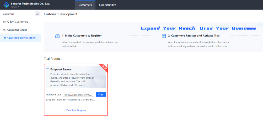 If you want to provide customers with licenses for POC projects. After logging in, navigate to Customers > Customer Development, and copy the Invitation Link under Endpoint Secure. Share the link with customer partners or customers.