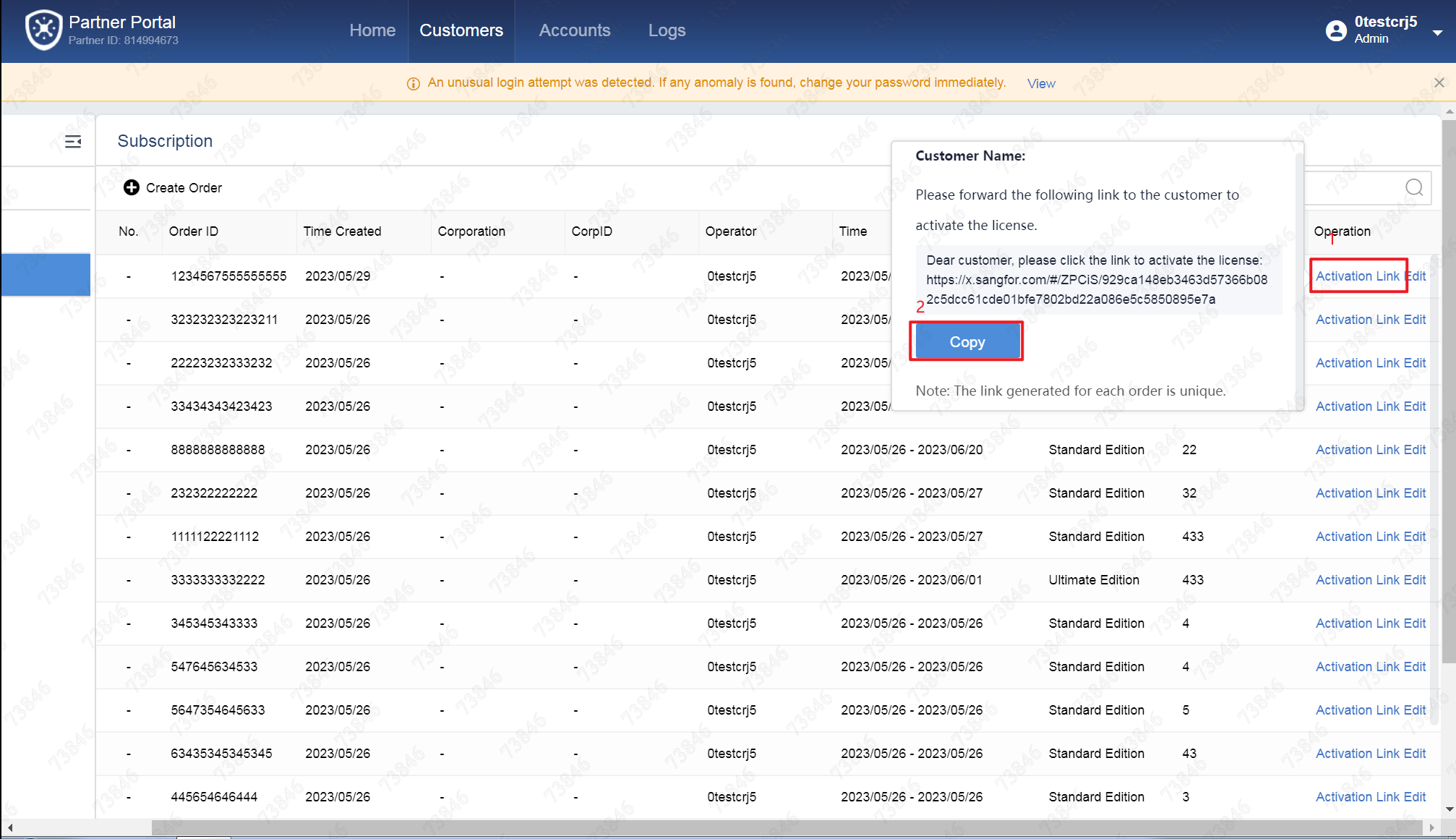 Find the order, click the Activation Link, copy the activation link, and send it to the customer or partner.