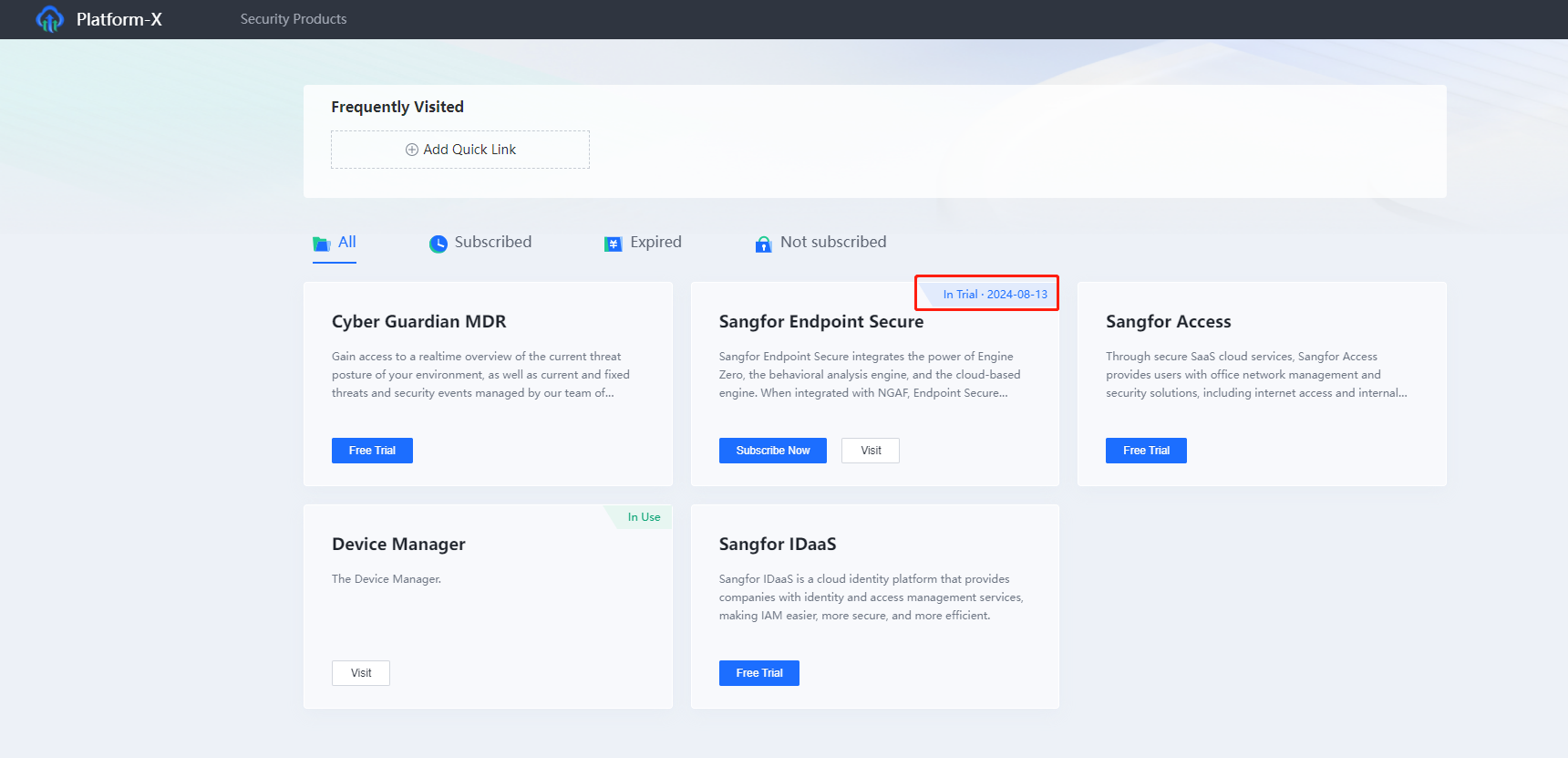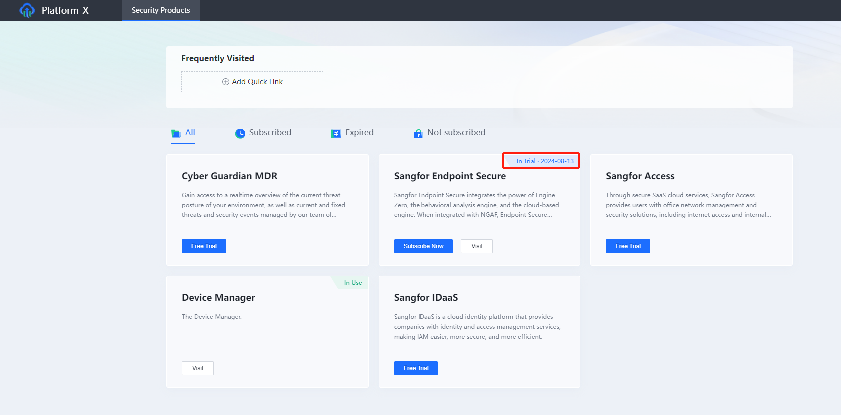 Click Get Started, then you have logged in to the Platform X platform successfully, and the SaaS Endpoint Secure has been created with a one-month trial period.