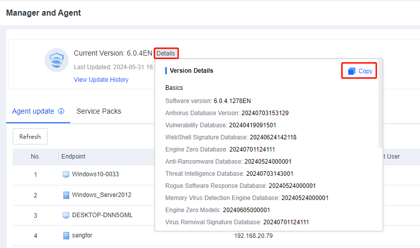 Got to System > System Updates > Manager and Agent path, Place the cursor on Details, and the pop-up window will display the version information, click Copy and paste it to Sangfor engineers. ****