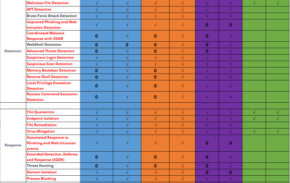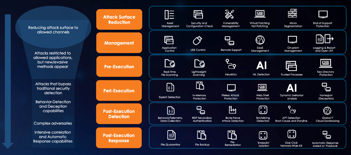 Endpoint Secure offers pre-event, during-event, and post-event services based on its four capabilities: discovery, detection, defense, and response.