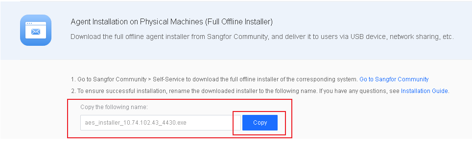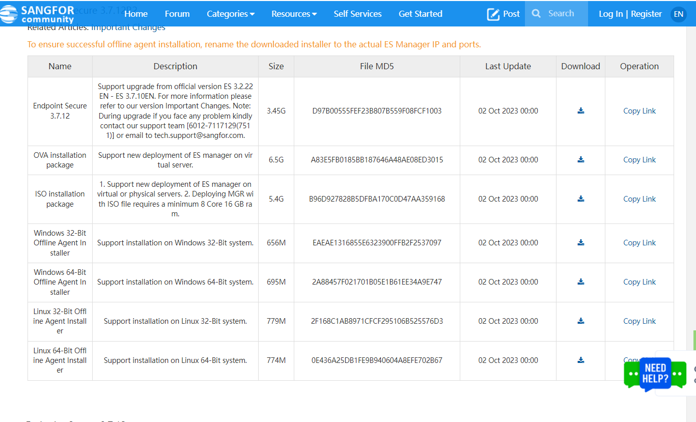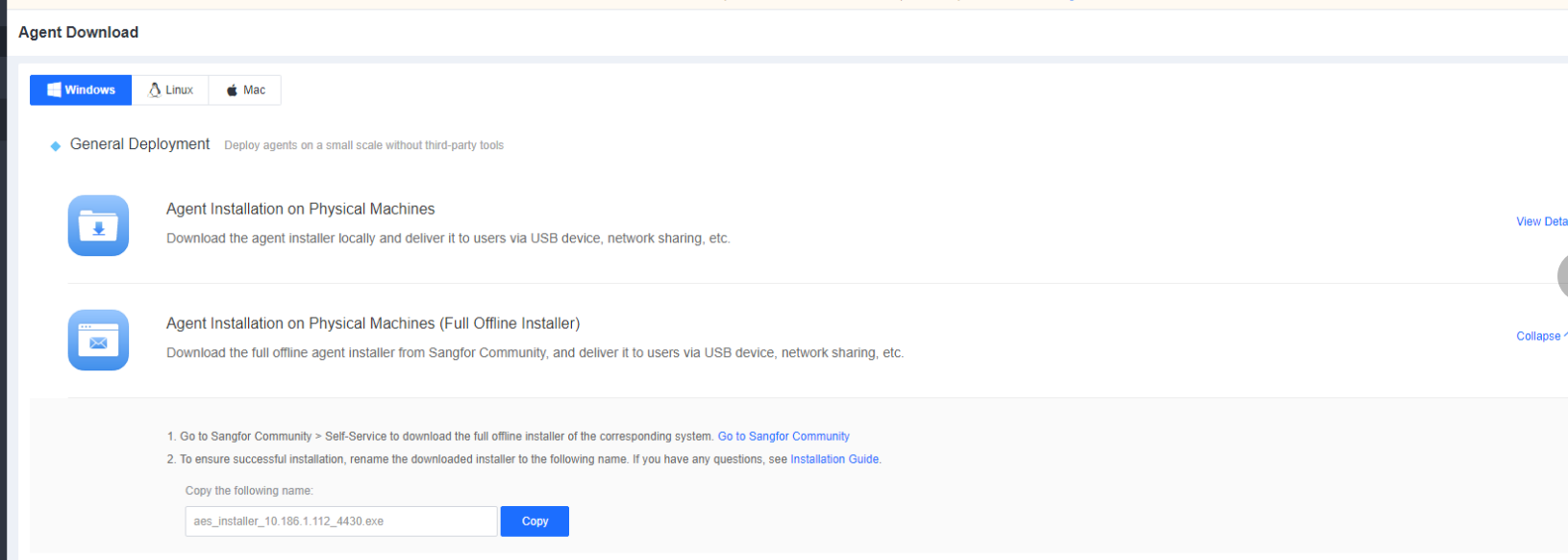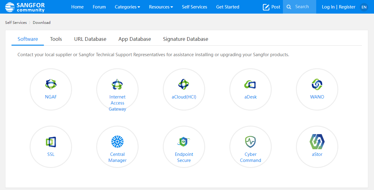 Visit the Sangfor community at https://community.sangfor.com and go to Self Services > Download > Endpoint Secure to download an upgrade package of the version you need.