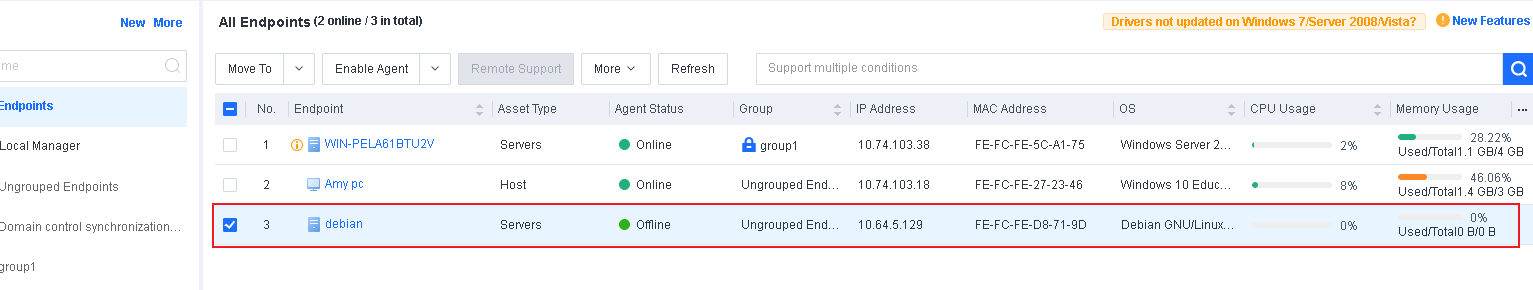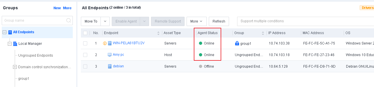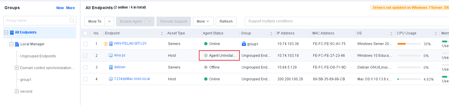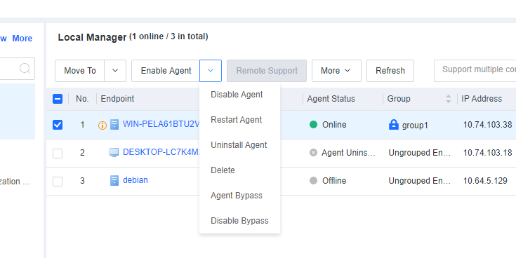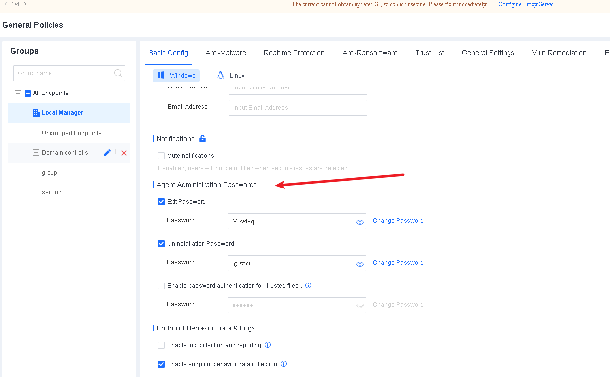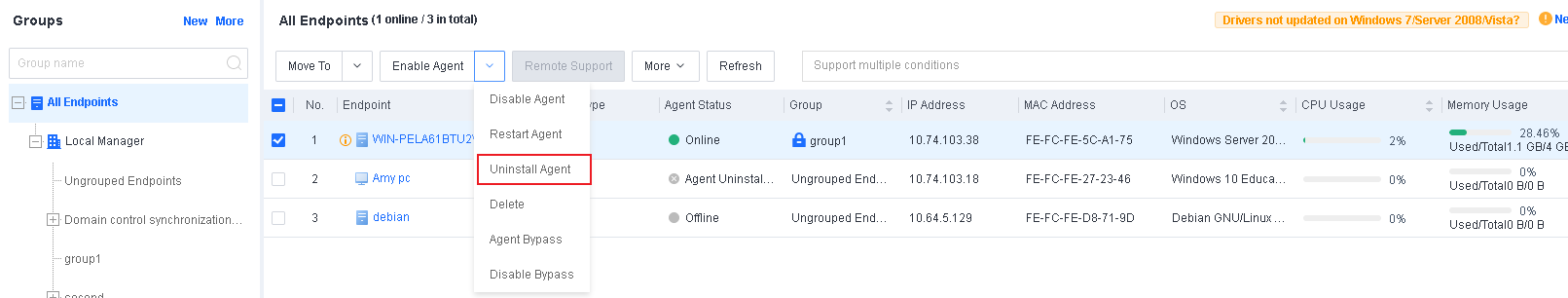 Log in to Endpoint Secure Manager. Go to Endpoint > Endpoint Groups and disable Endpoint Secure Agent on the endpoint, as shown in the following figure. If the errors persist after Endpoint Secure Agent is disabled, contact your service provider.