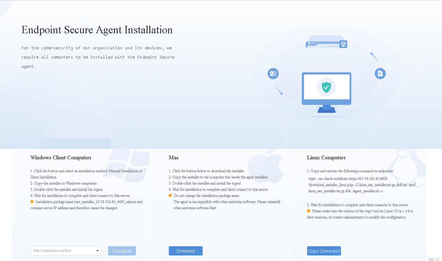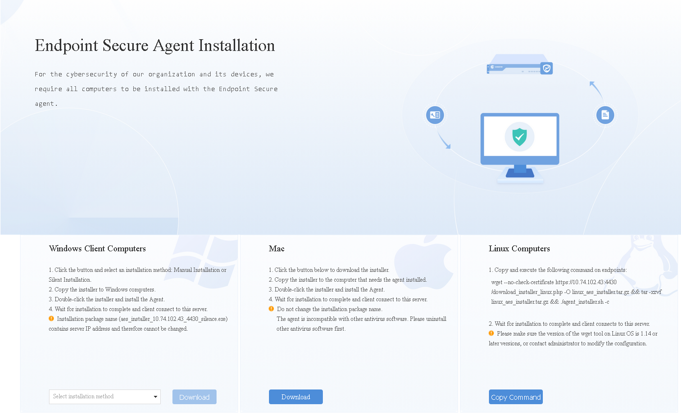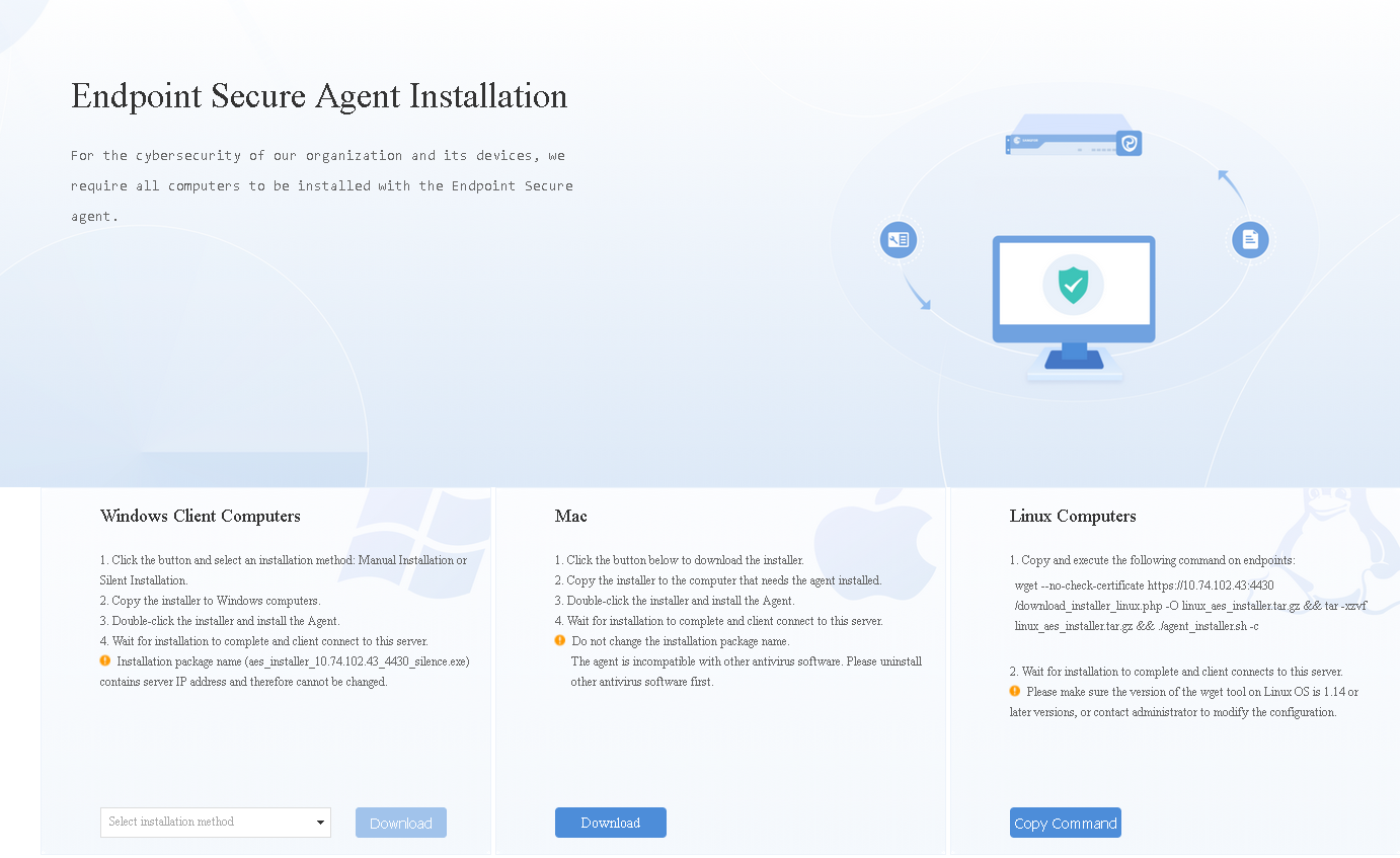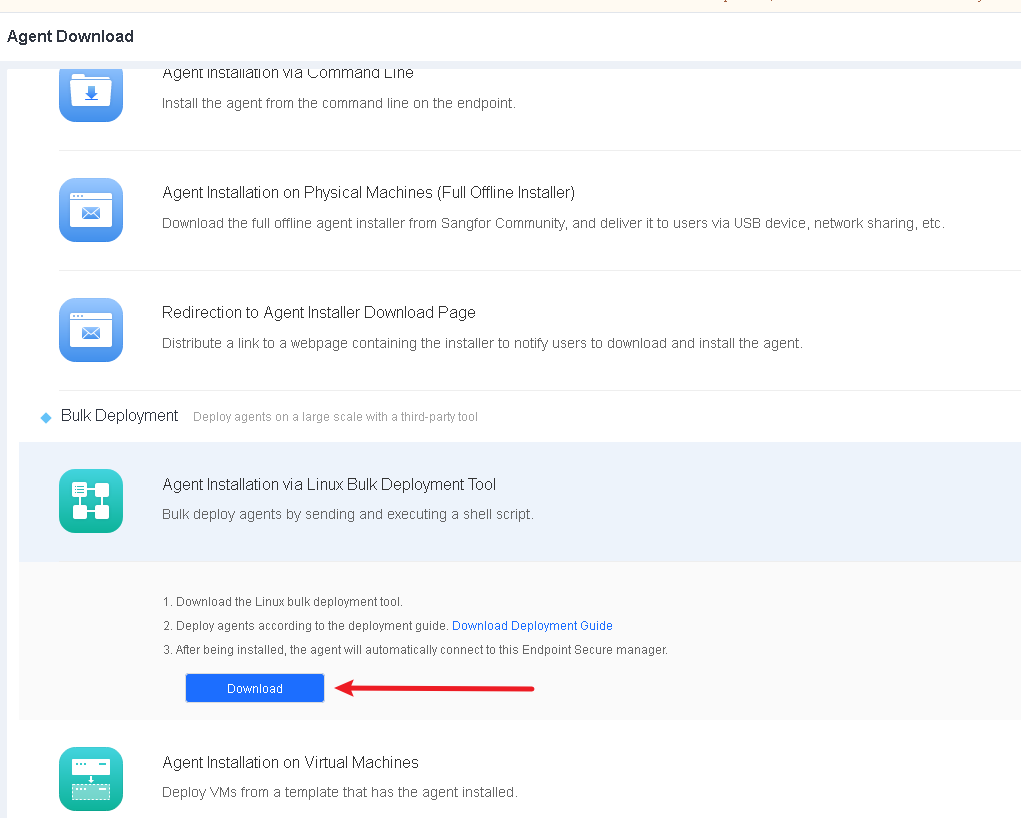 Not recommended: Script-based deployment. This method will be phased out in future versions. Avoid using it whenever possible. This method applies to scenarios not supporting OVA and ISO image-based deployment. If the customer wants to adopt this method, apply for a special installation package containing only Endpoint Secure Manager. Since the underlying operating system is from the customer, the deployment may fail due to missing dependencies, missing drivers, or version incompatibility. Endpoint Secure Manager is installed after the deployment.