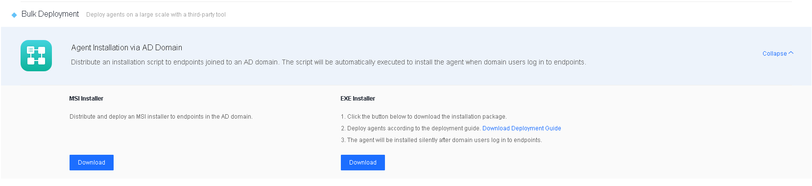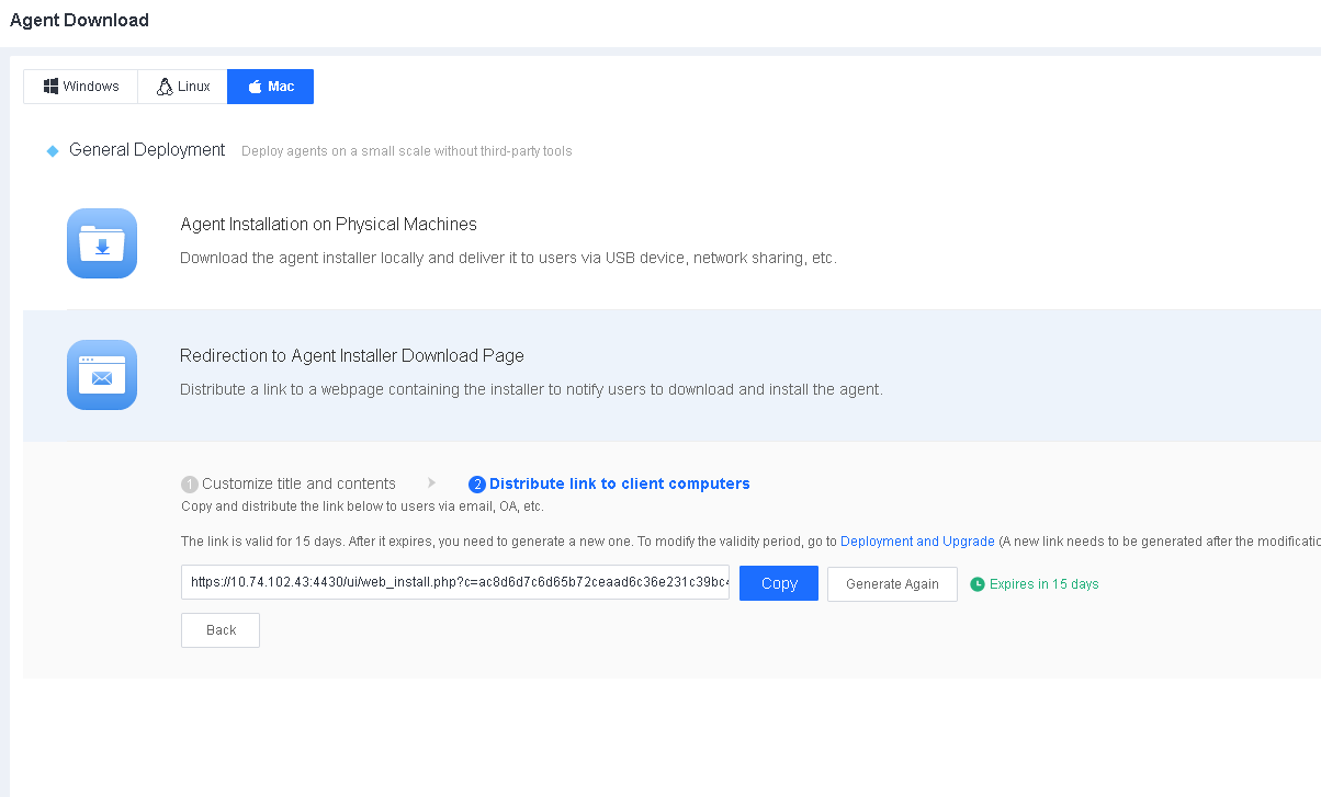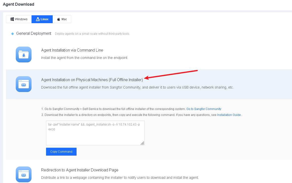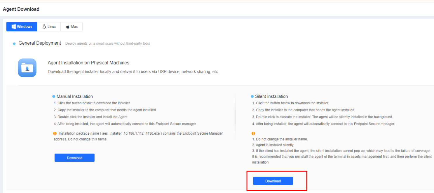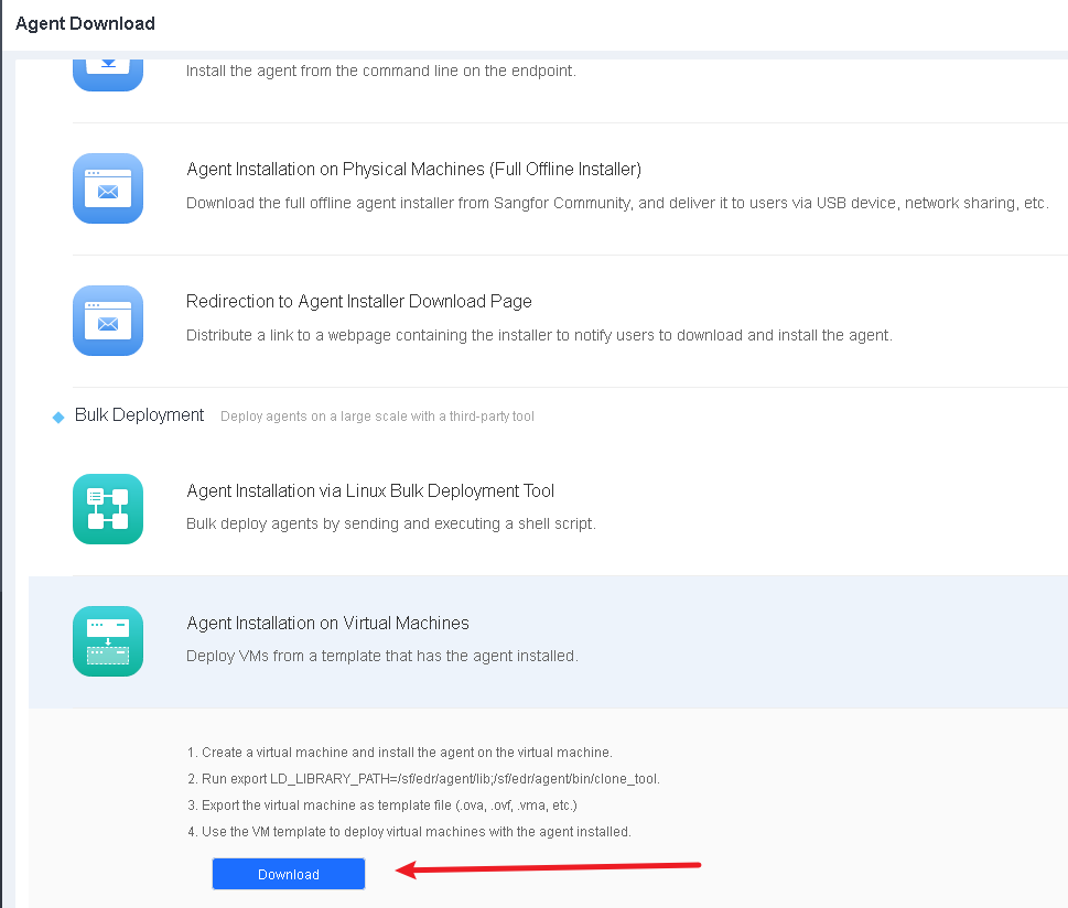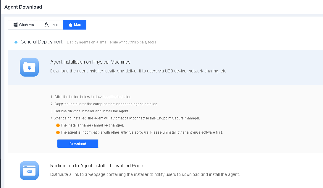 Not recommended: Script-based deployment. This method will be phased out in future versions. Avoid using it whenever possible. This method applies to scenarios not supporting OVA and ISO image-based deployment. If the customer wants to adopt this method, apply for a special installation package containing only Endpoint Secure Manager. Since the underlying operating system is from the customer, the deployment may fail due to missing dependencies, missing drivers, or version incompatibility. Endpoint Secure Manager is installed after the deployment.