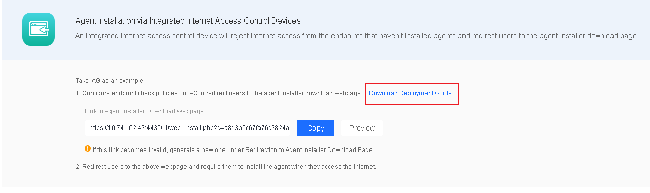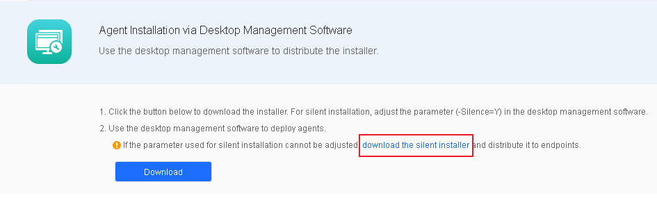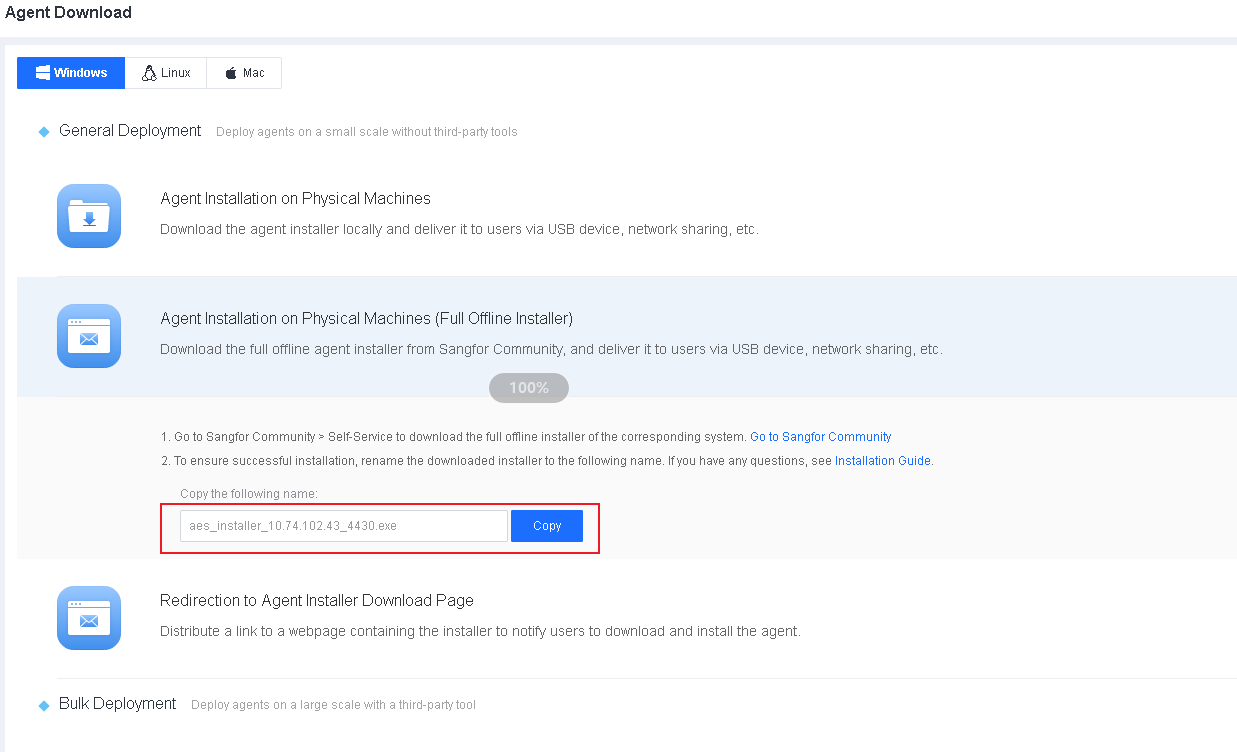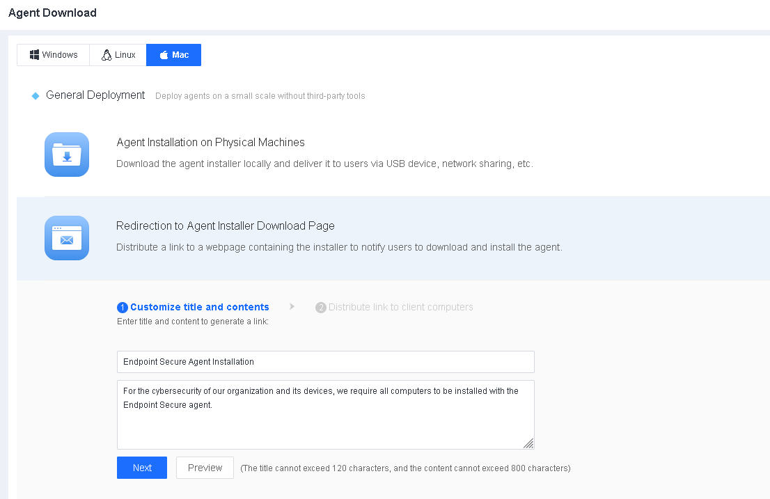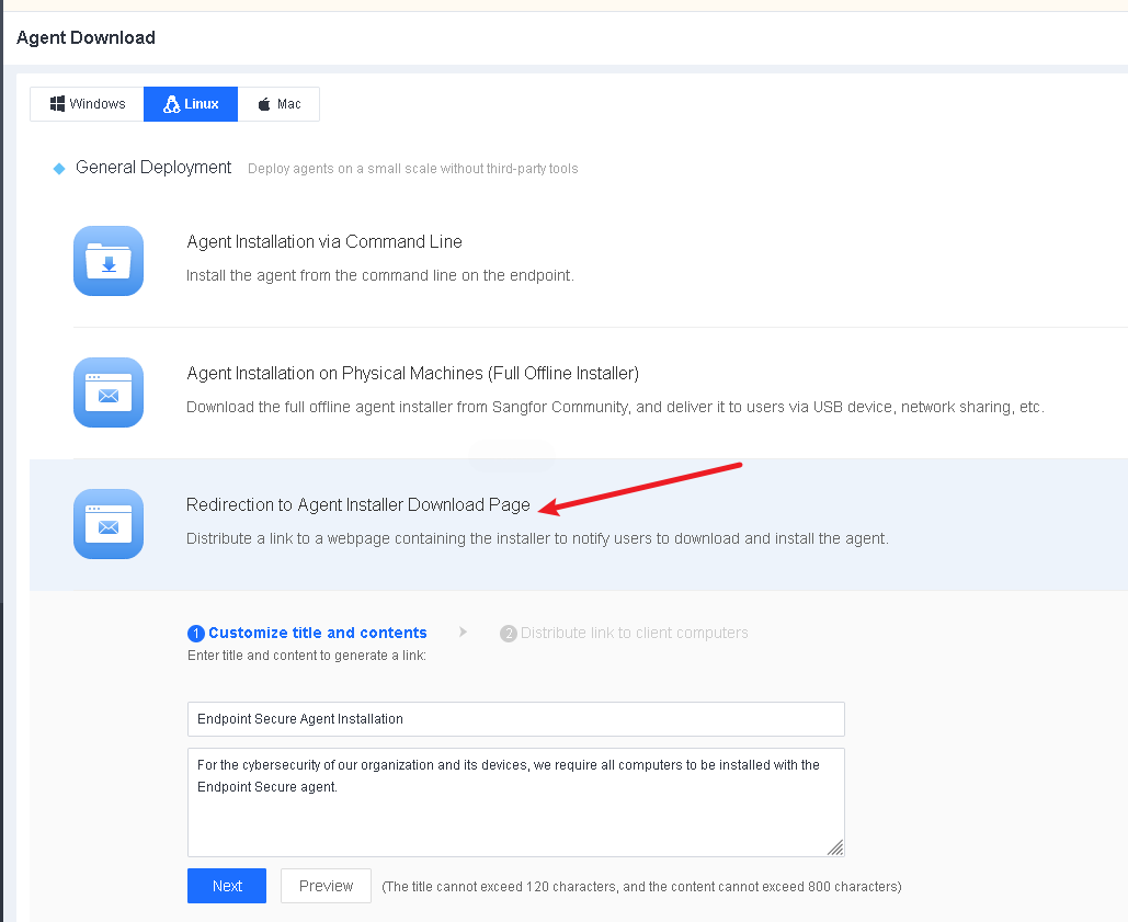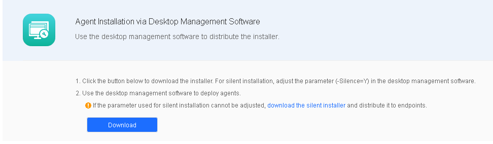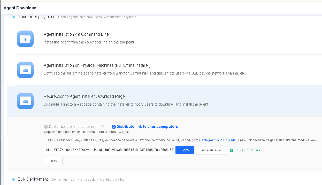 Not recommended: Script-based deployment. This method will be phased out in future versions. Avoid using it whenever possible. This method applies to scenarios not supporting OVA and ISO image-based deployment. If the customer wants to adopt this method, apply for a special installation package containing only Endpoint Secure Manager. Since the underlying operating system is from the customer, the deployment may fail due to missing dependencies, missing drivers, or version incompatibility. Endpoint Secure Manager is installed after the deployment.