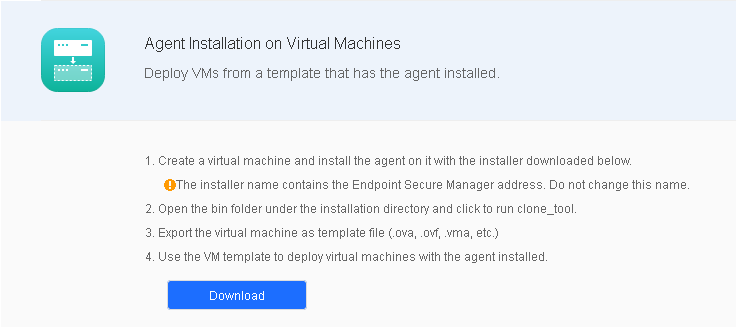 Strongly recommended: OVA image-based deployment. As the OVA package contains Endpoint Secure Manager and the underlying Ubuntu system, you can directly use Endpoint Secure Manager after importing the OVA package. Endpoint Secure Manager and the underlying Ubuntu system are installed after deployment.