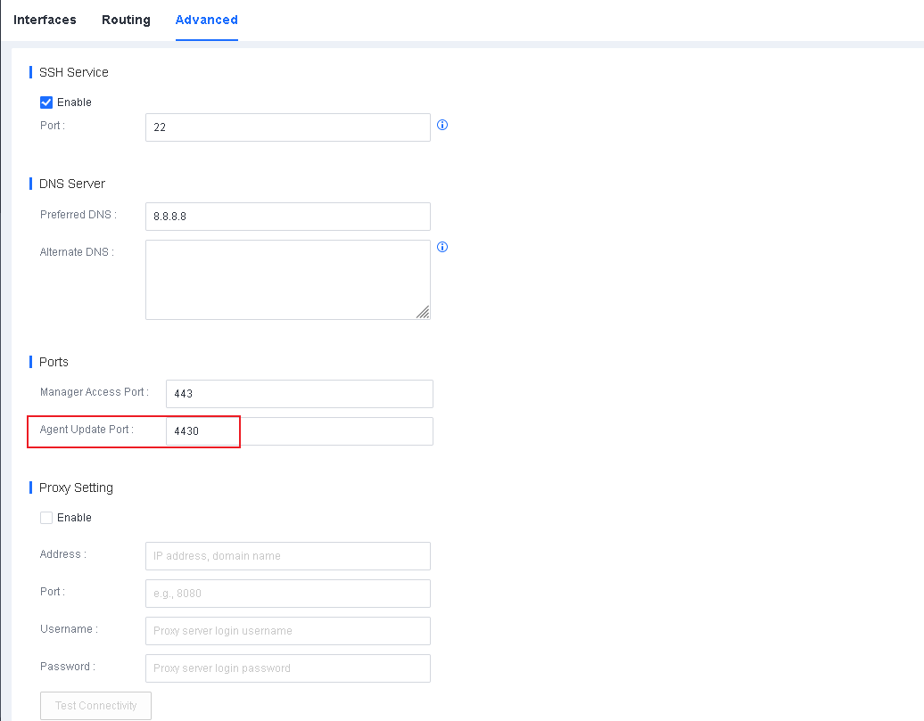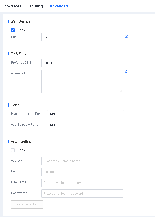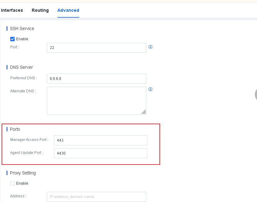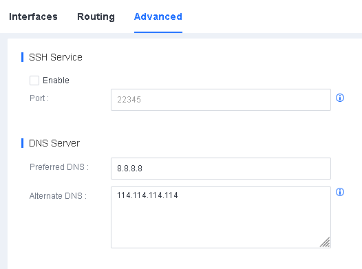 Navigate to System > System > Network > Advanced, and configure a preferred DNS server and an alternate DNS server, as shown in the following figure.