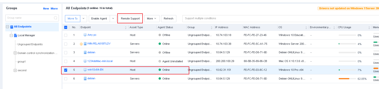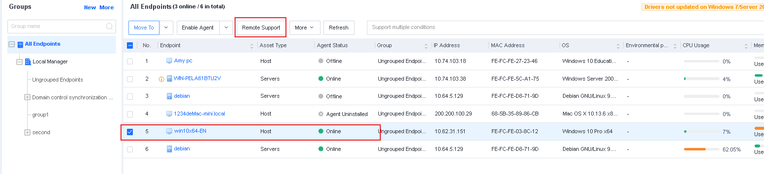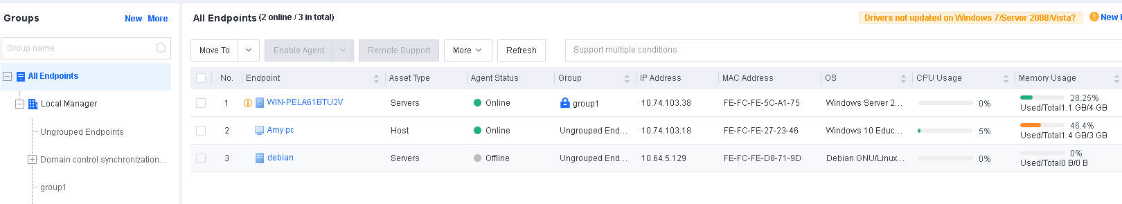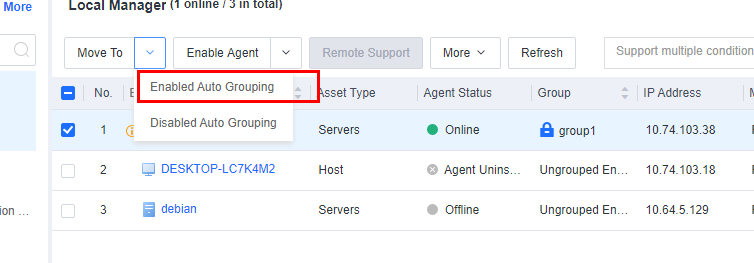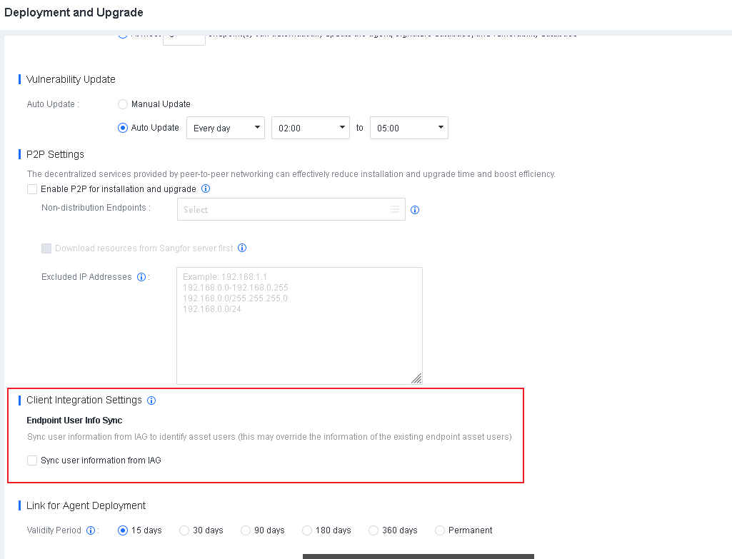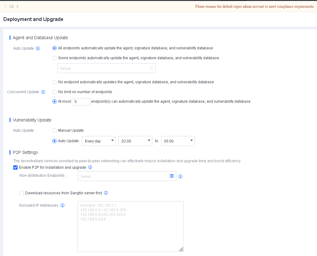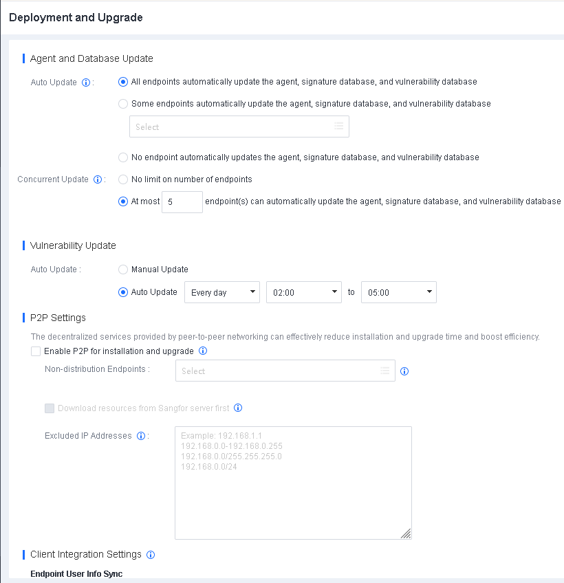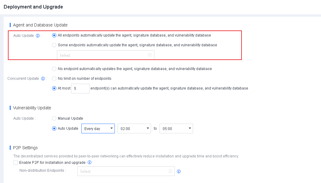 On the Deployment and Upgrade page of Endpoint Secure Manager, you can enable auto-update only for some endpoints after the Manager is updated. After these endpoints are successfully updated, select Agent, antivirus database, and vulnerability database on all endpoints to enable the update for all endpoints. It ensures smooth update and system stability.