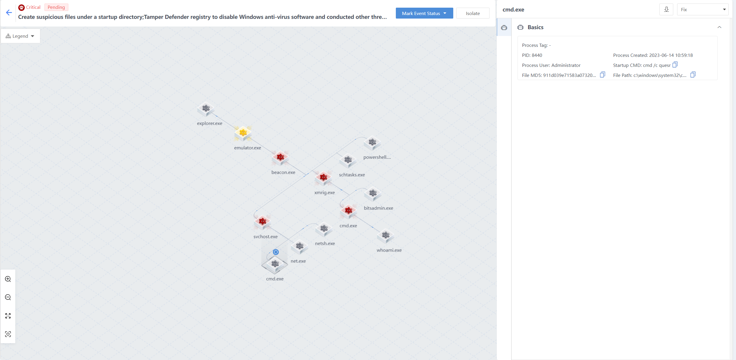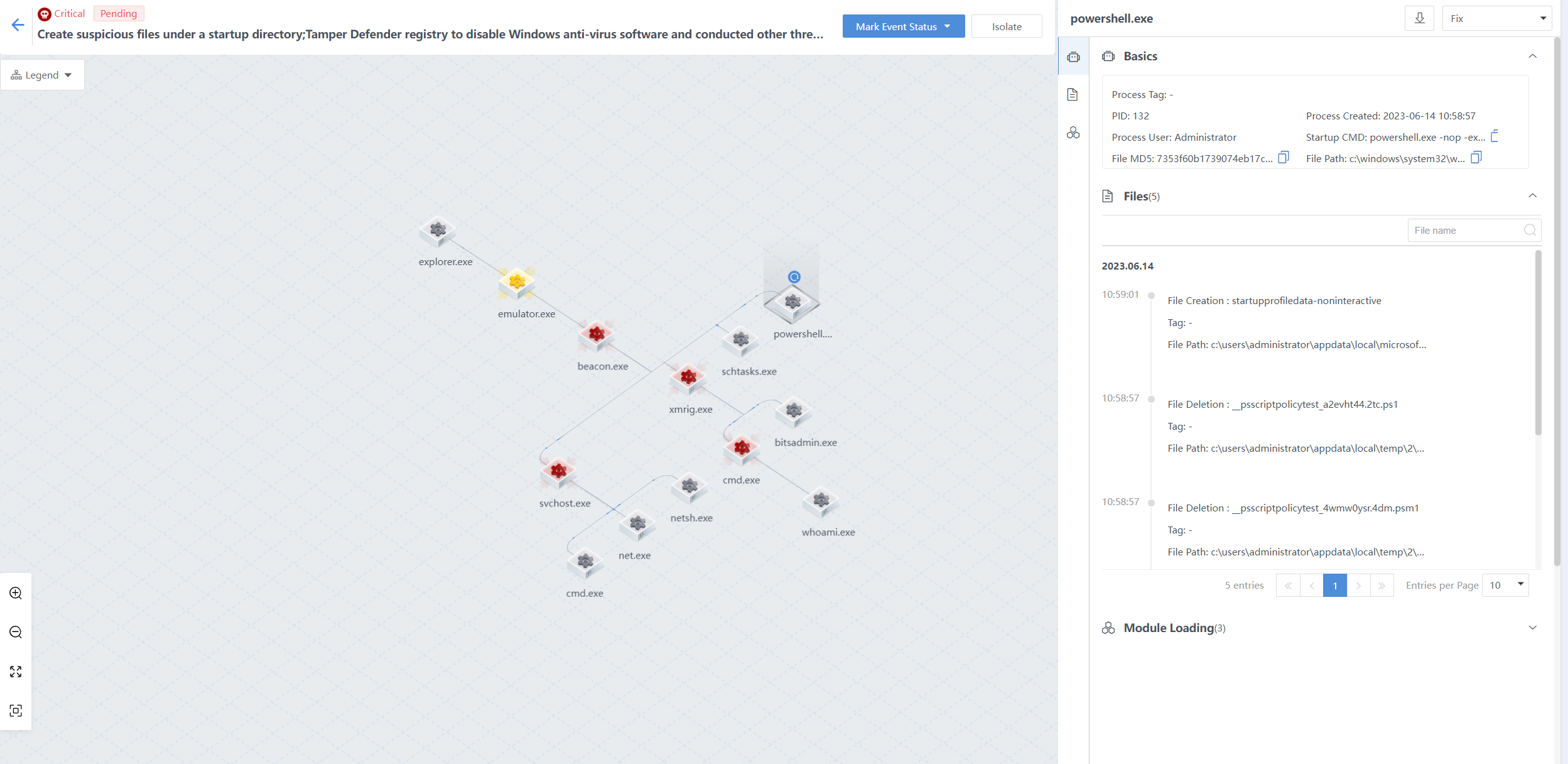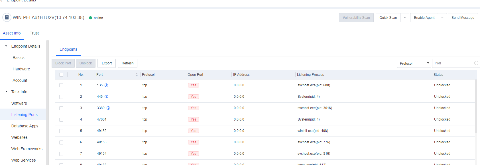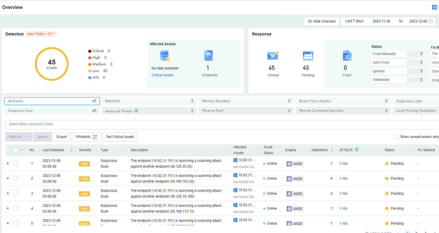 Discovery: Provides pre-event risk assessment capabilities, including fingerprint-based asset inventory, shadow asset discovery, vulnerability patch management, security compliance check, exposure surface analysis, application/system/account risk assessment, security enhancement, USB device control, and micro-segmentation visualization.