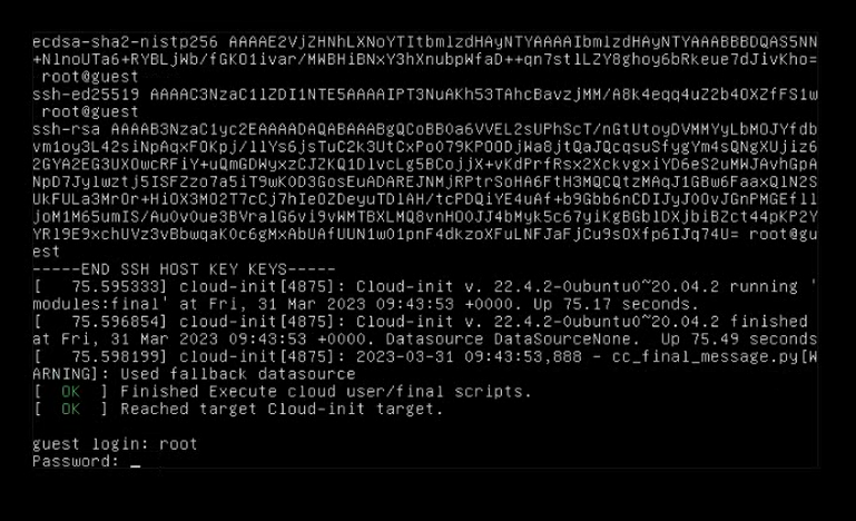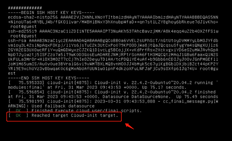 The installation finishes when the prompt "Reached target Cloud-init target" appears, as shown in the following figure.