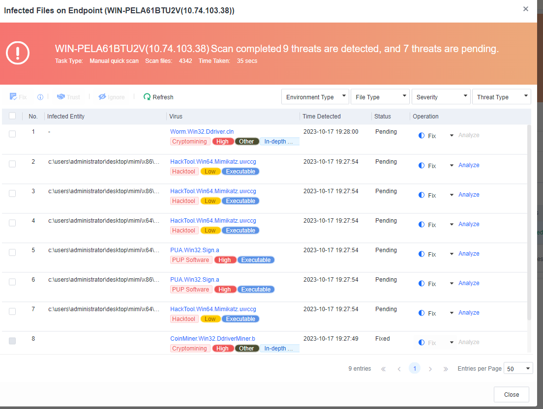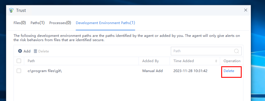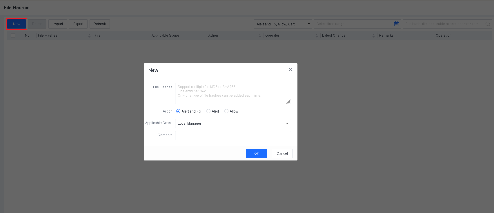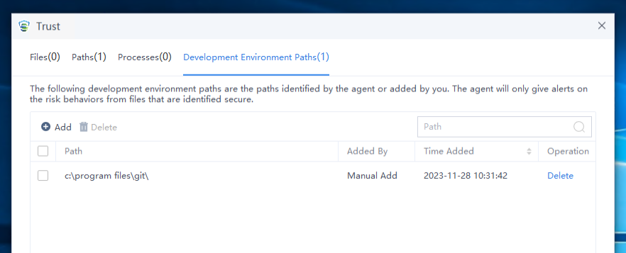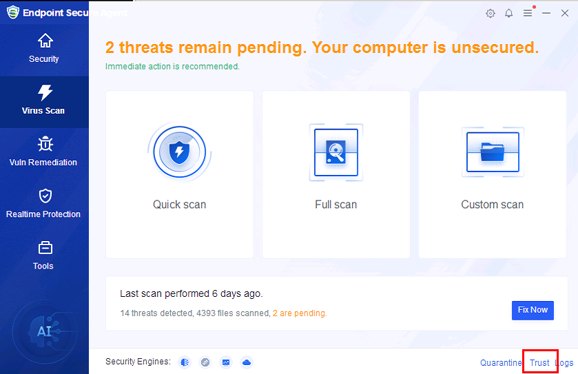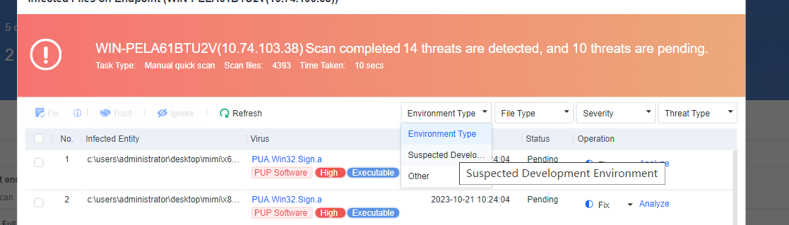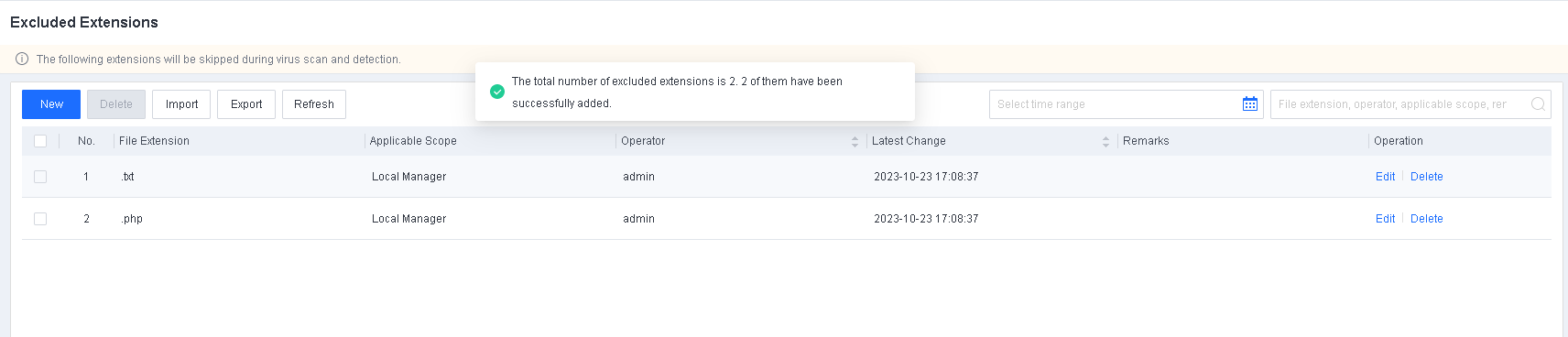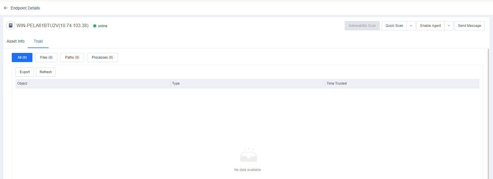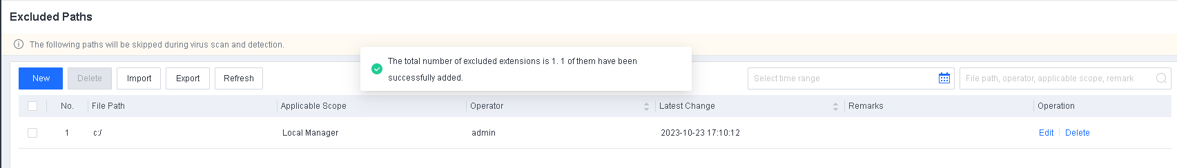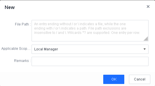 To avoid false positives during virus scans, collect trusted files such as virus-free business software and previously whitelisted files from other antivirus products, log in to Endpoint Secure Manager that you have deployed and activated, and add the trusted files in Policies > Detection Policies > Indicators or Policies > Exclusions. Added trusted files will not be scanned.
