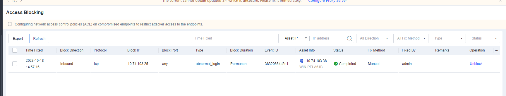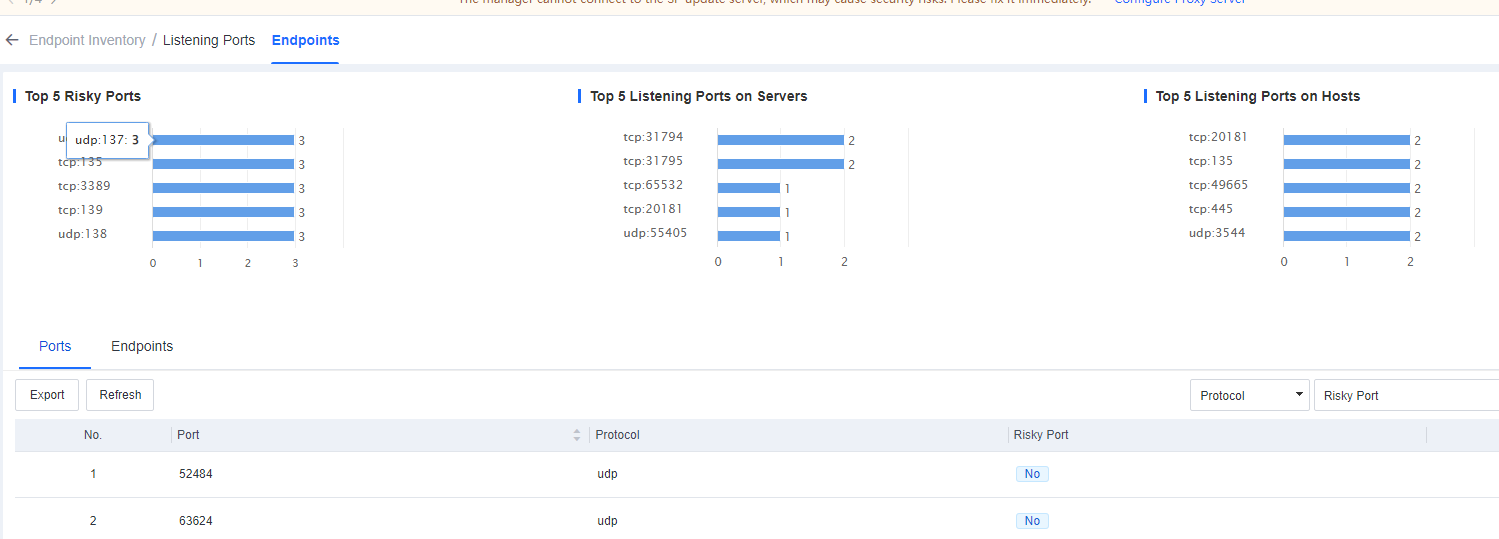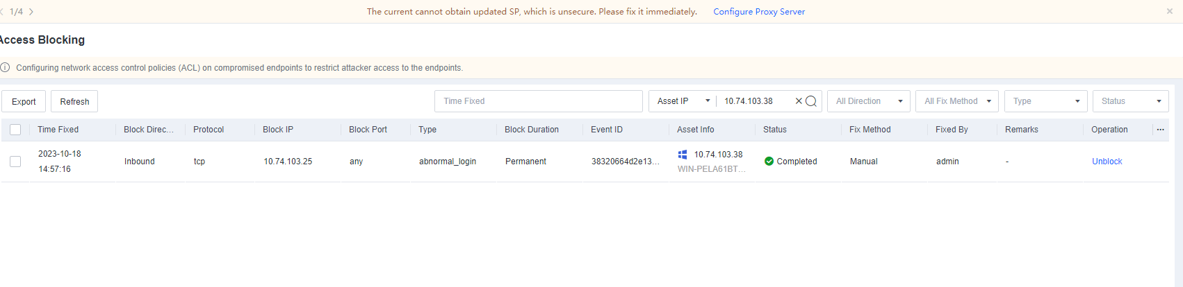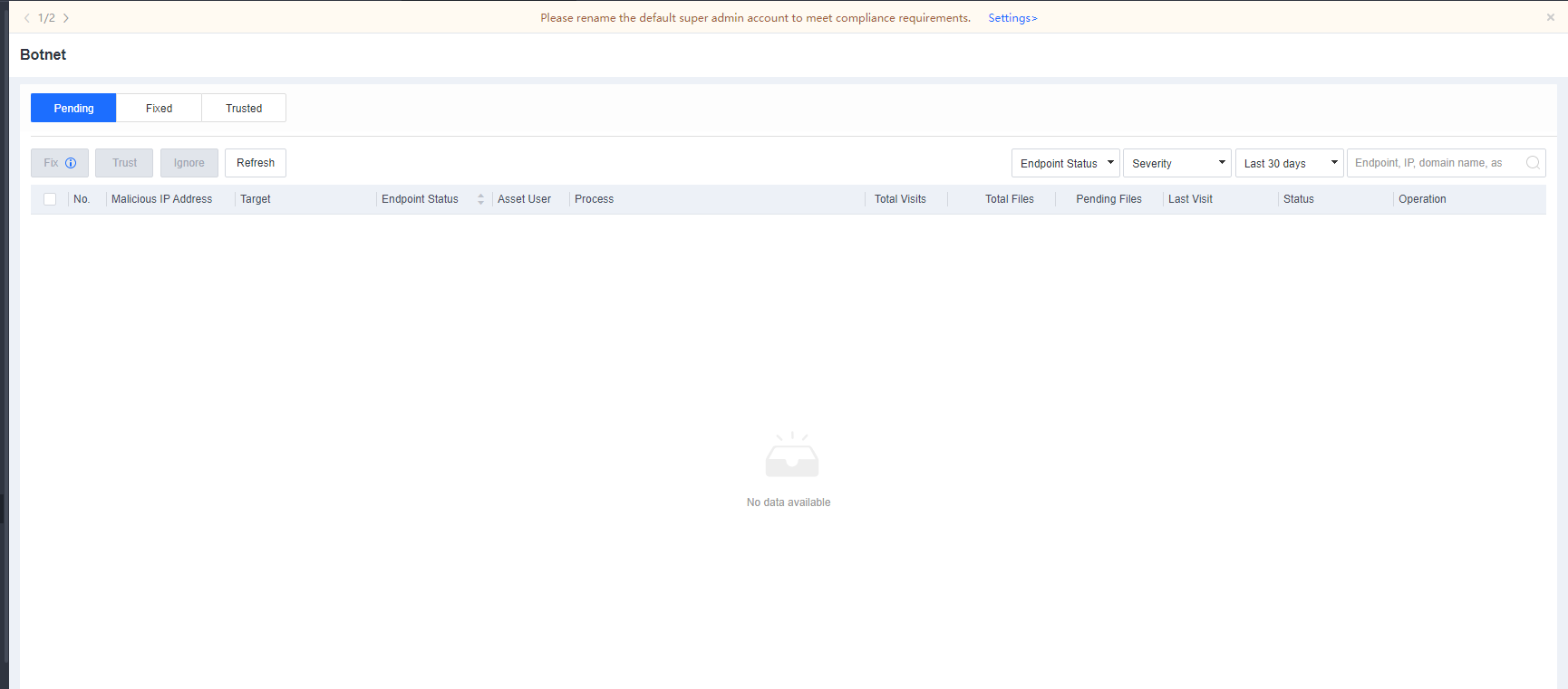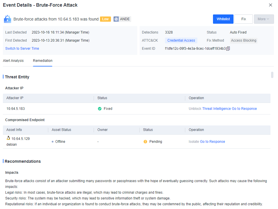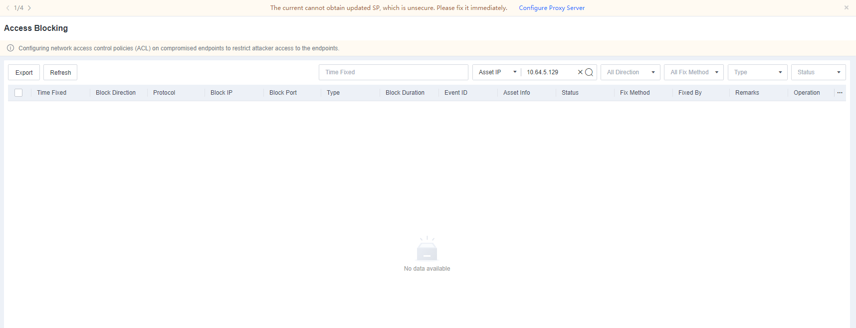 | Detection and Response | Target Assets | / | Endpoint isolation | An isolated endpoint cannot access any other networks. If a server is isolated, your business may be affected. | High | Go to Detection and Response > Target Assets > Isolated, and remove the endpoint from isolation. |