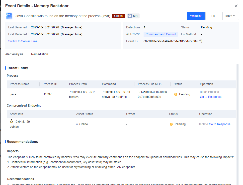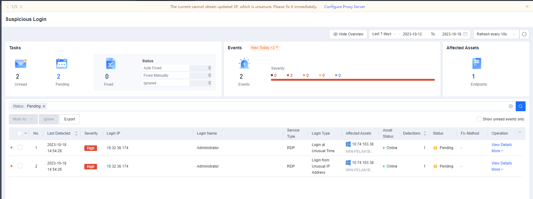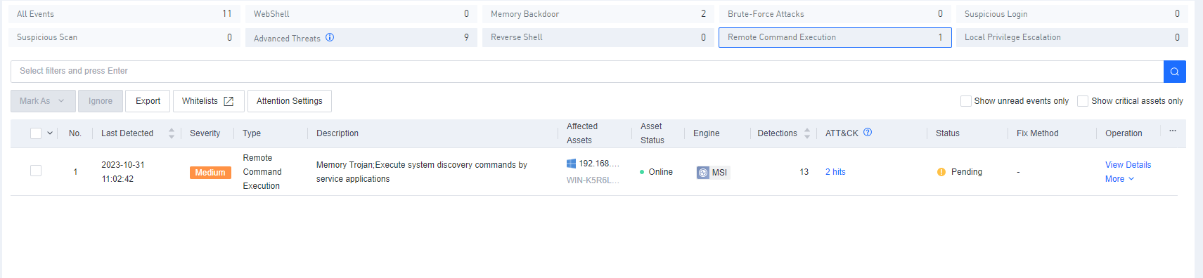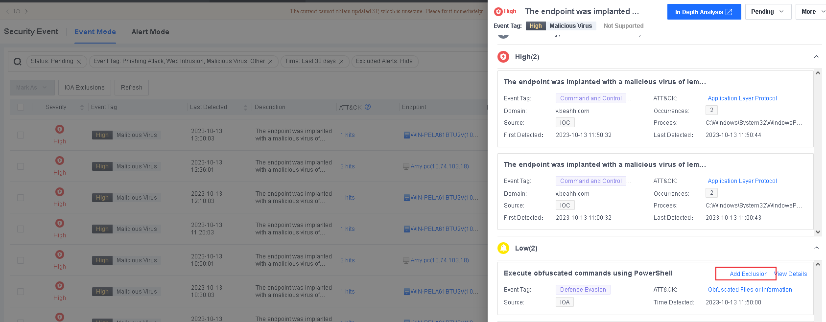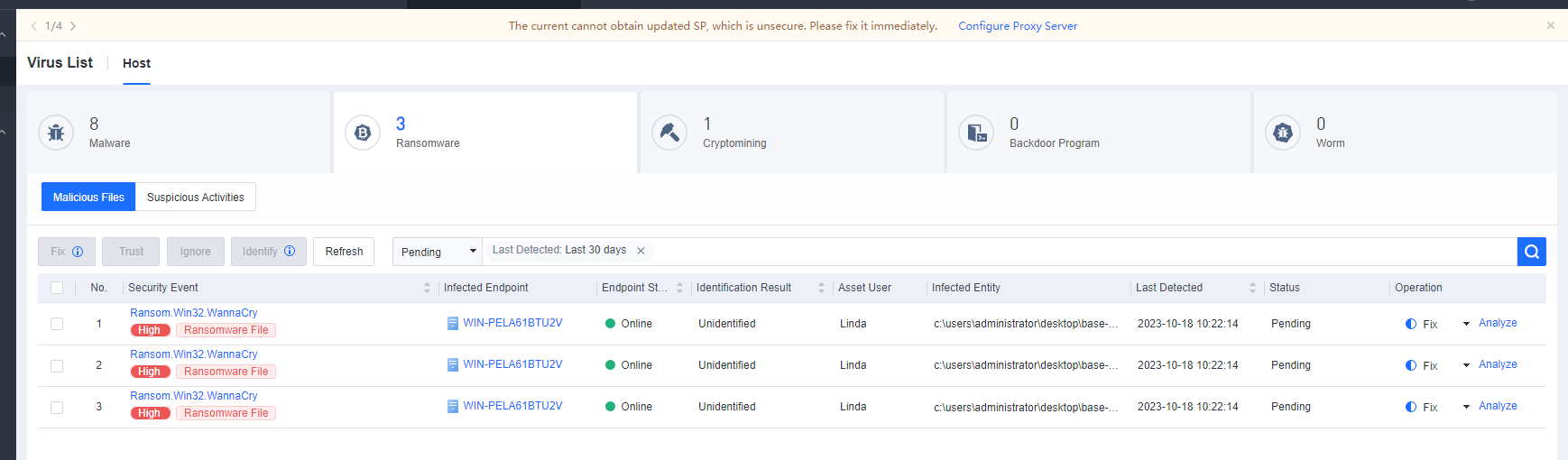 | Detection and Response | Target Assets | / | Endpoint isolation | An isolated endpoint cannot access any other networks. If a server is isolated, your business may be affected. | High | Go to Detection and Response > Target Assets > Isolated, and remove the endpoint from isolation. |